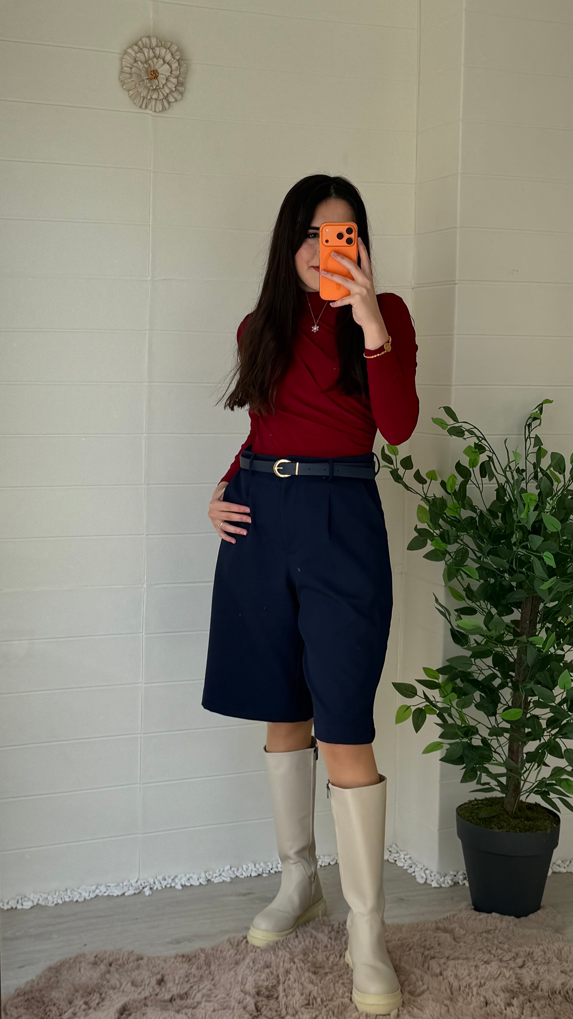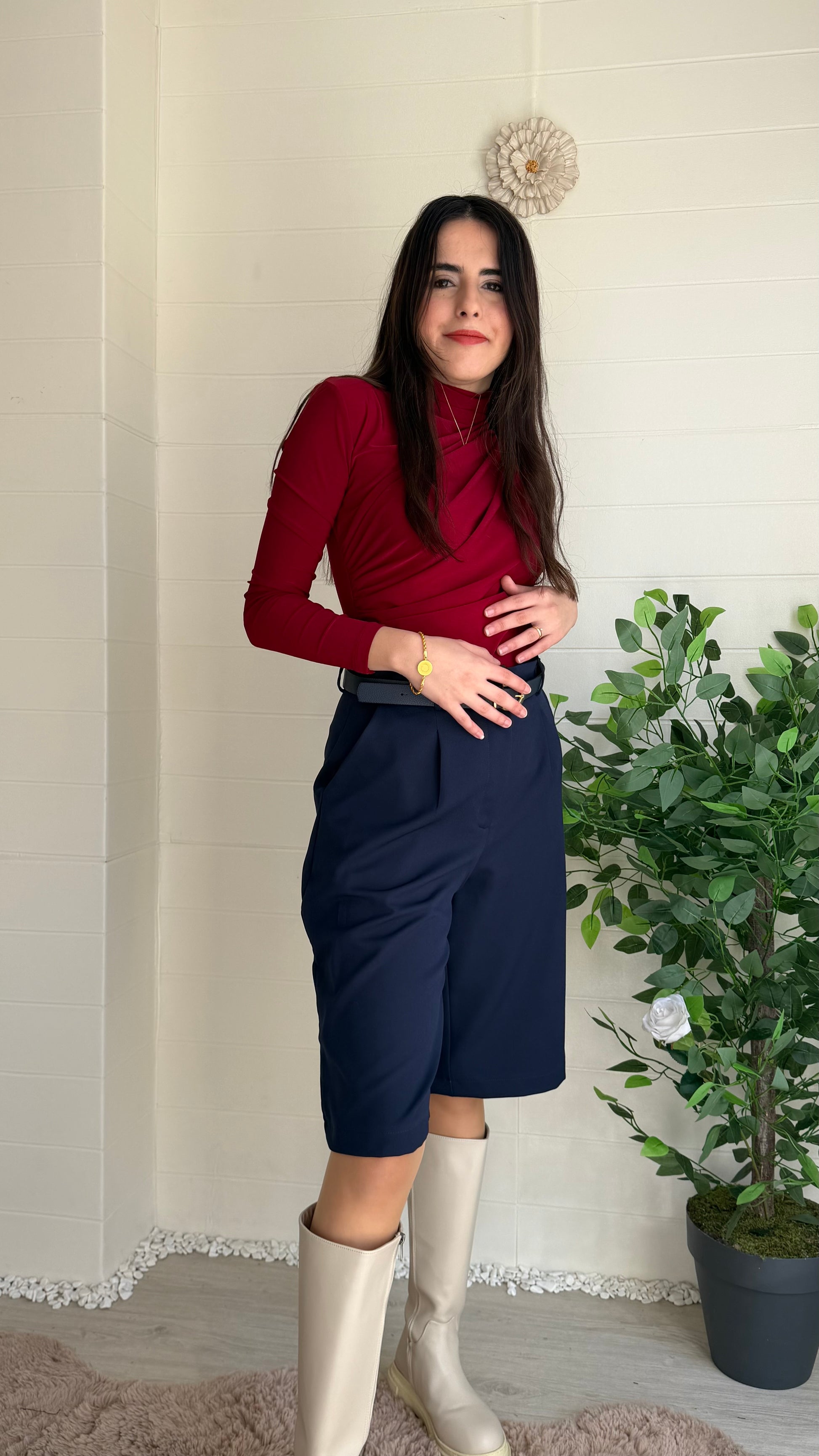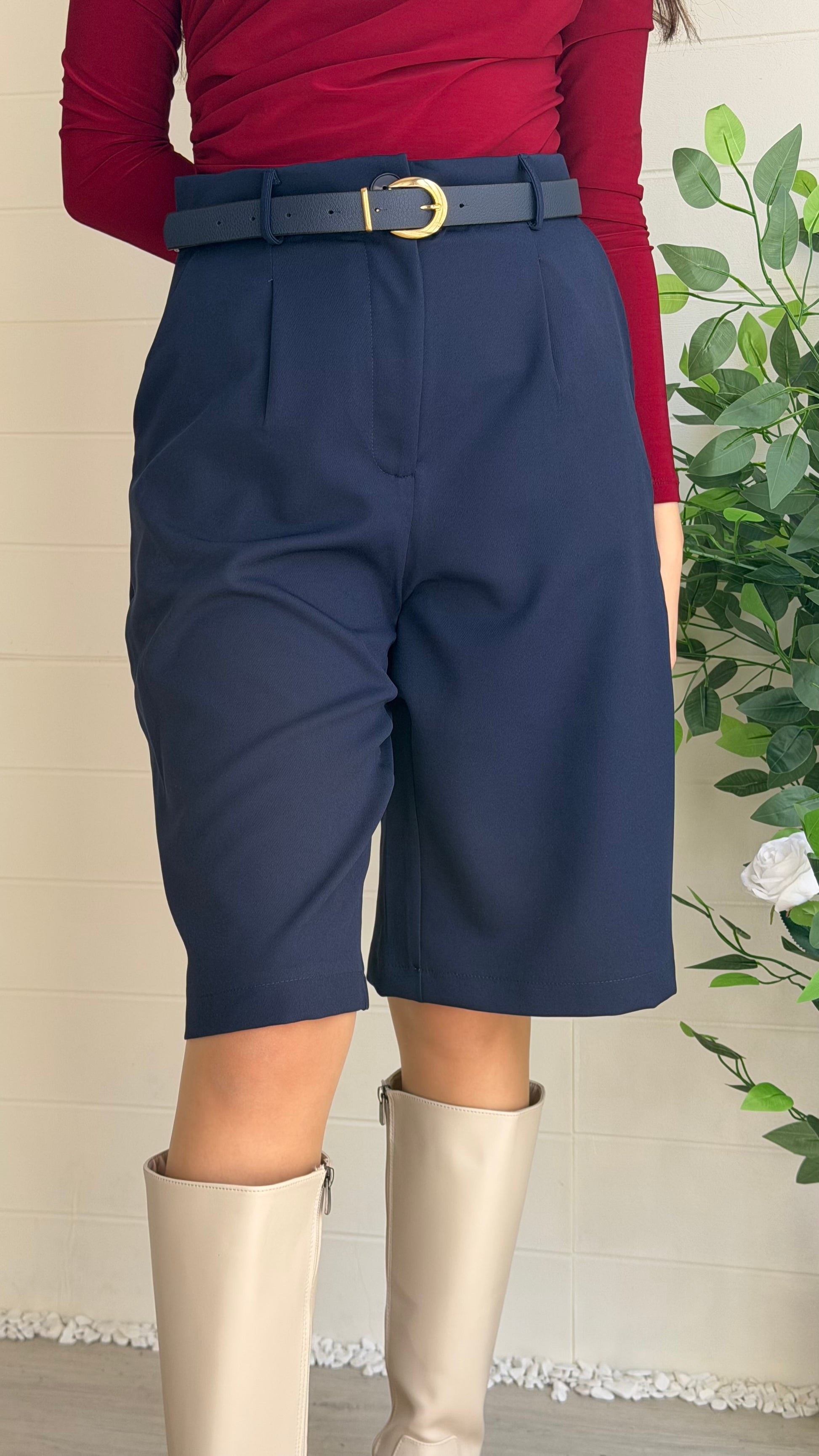 Yükselen belli, geniş paçalı bermuda tarzı şort. Akıcı ve hafif struktüre kumaşıyla günlük ve özel kombinlerde rahatlık sağlar. Etek görünümüne yaklaşan zarif ve sade bir siluet sunar.