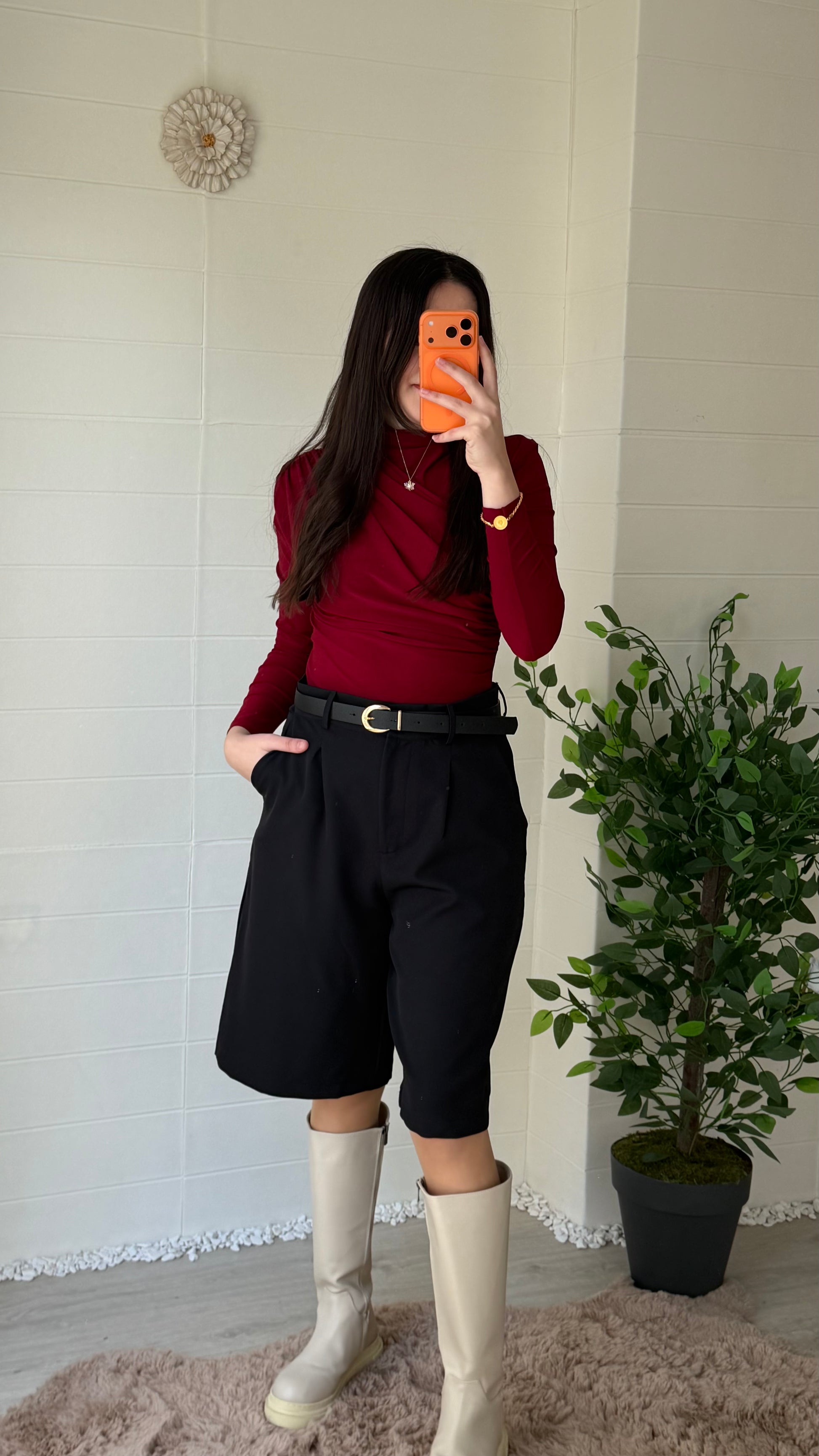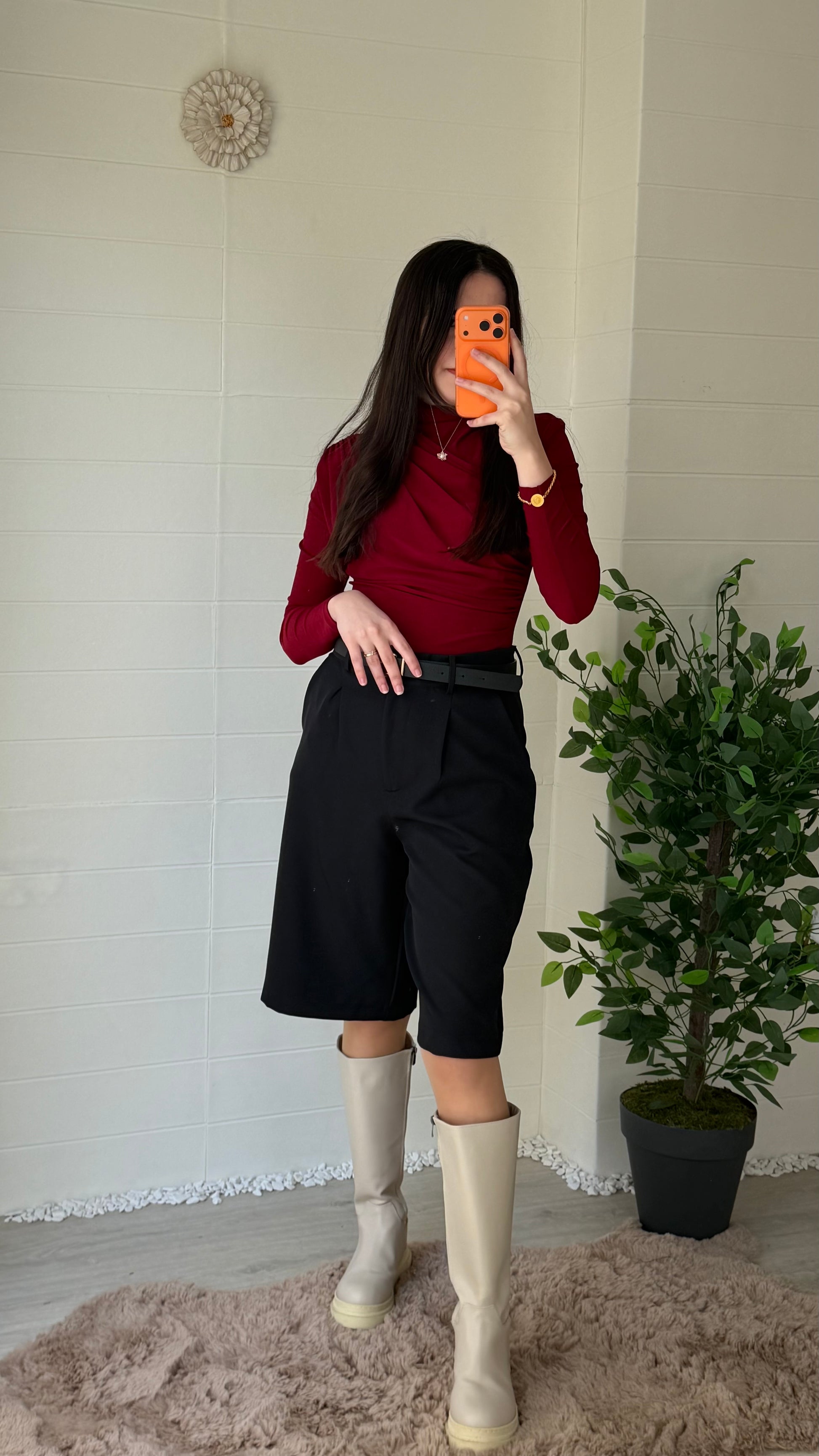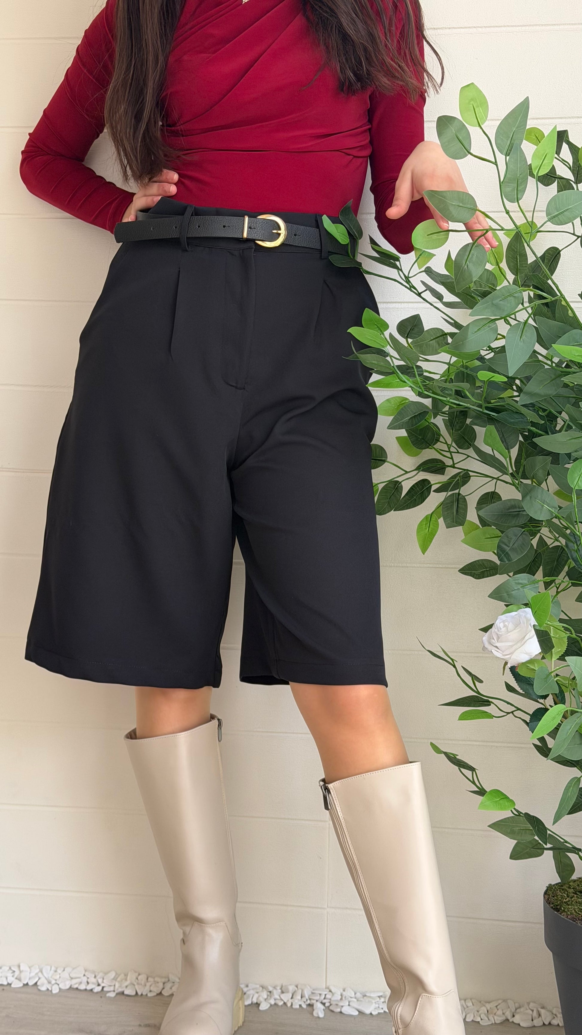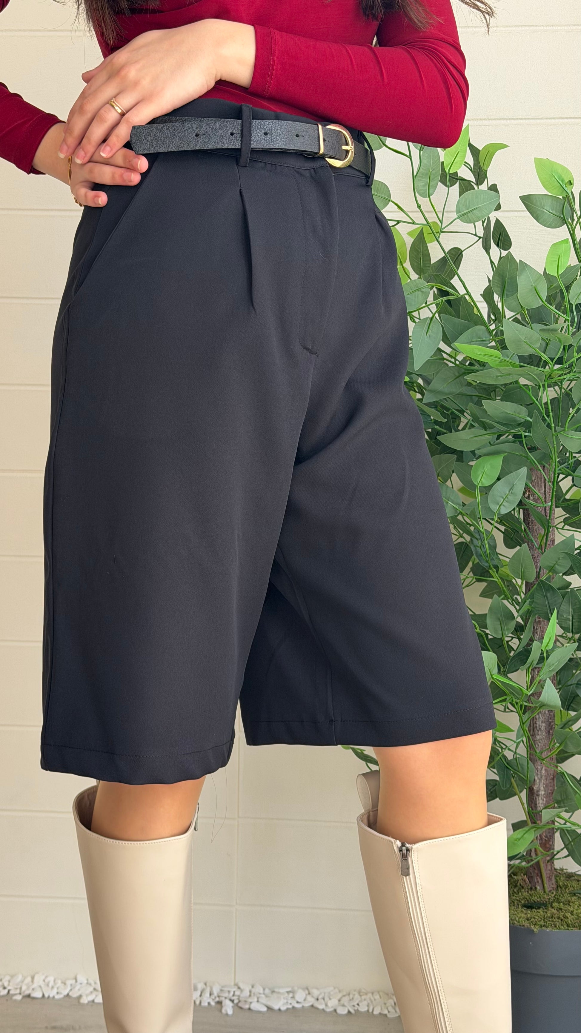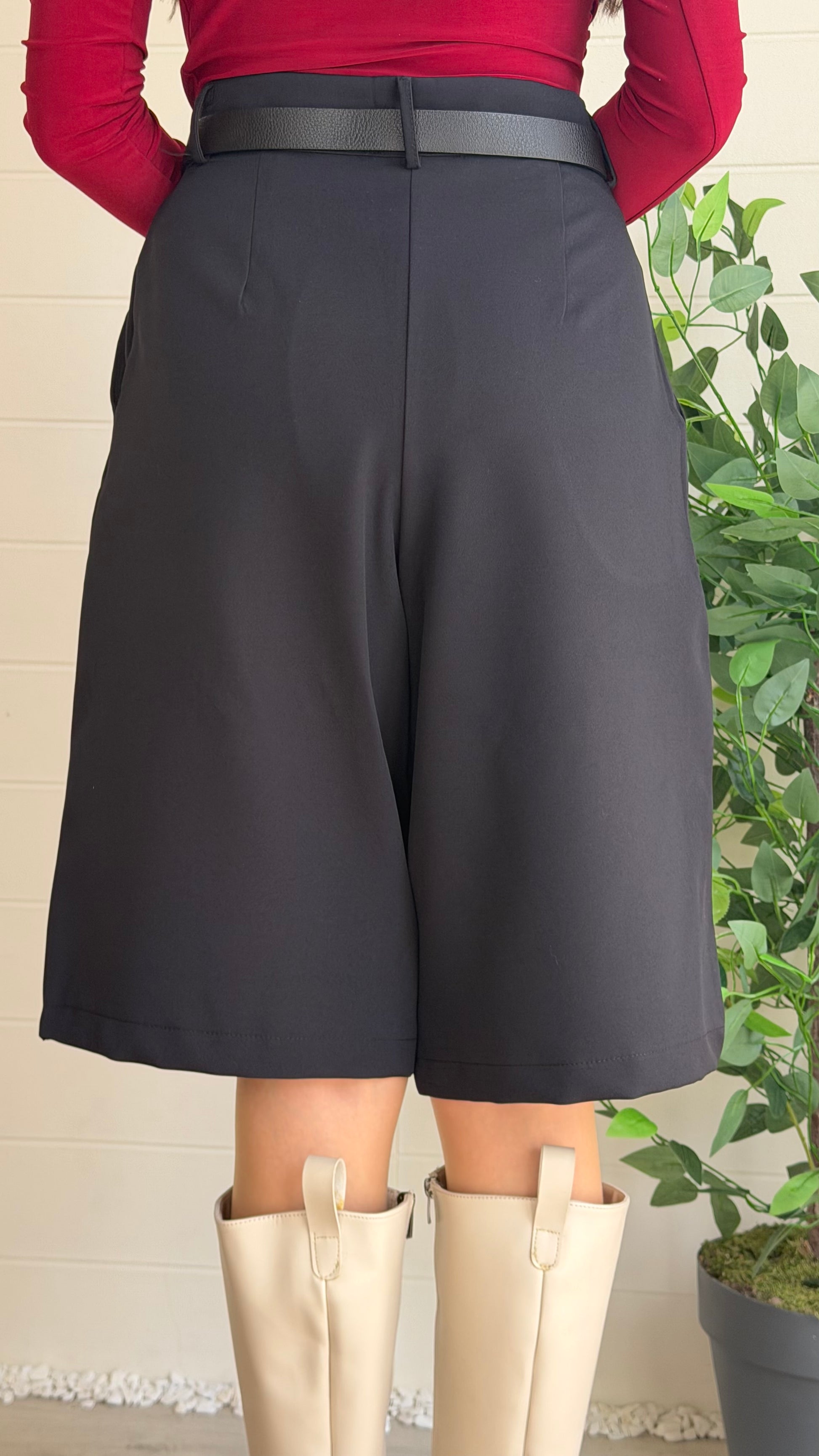Yükselen belli, geniş paçalı bermuda tarzı şort. Akıcı ve hafif struktüre kumaşıyla günlük ve özel kombinlerde rahatlık sağlar. Etek görünümüne yaklaşan zarif ve sade bir siluet sunar.