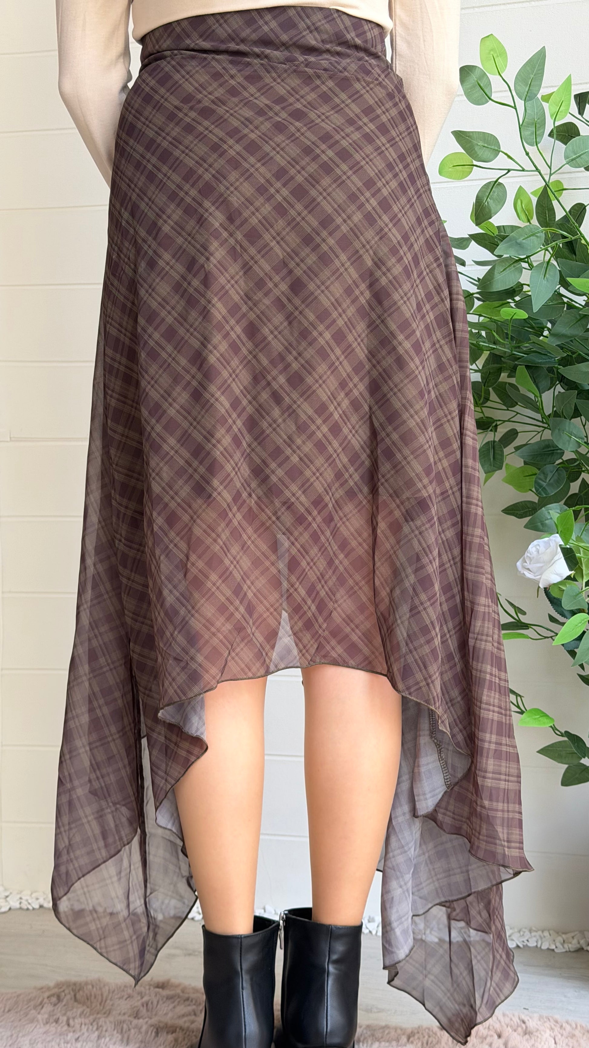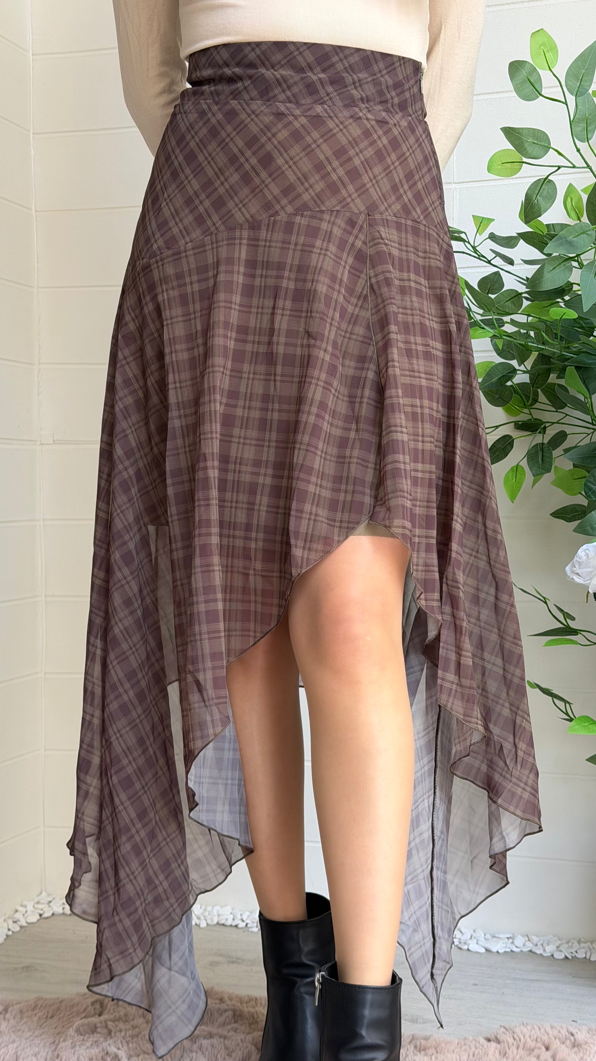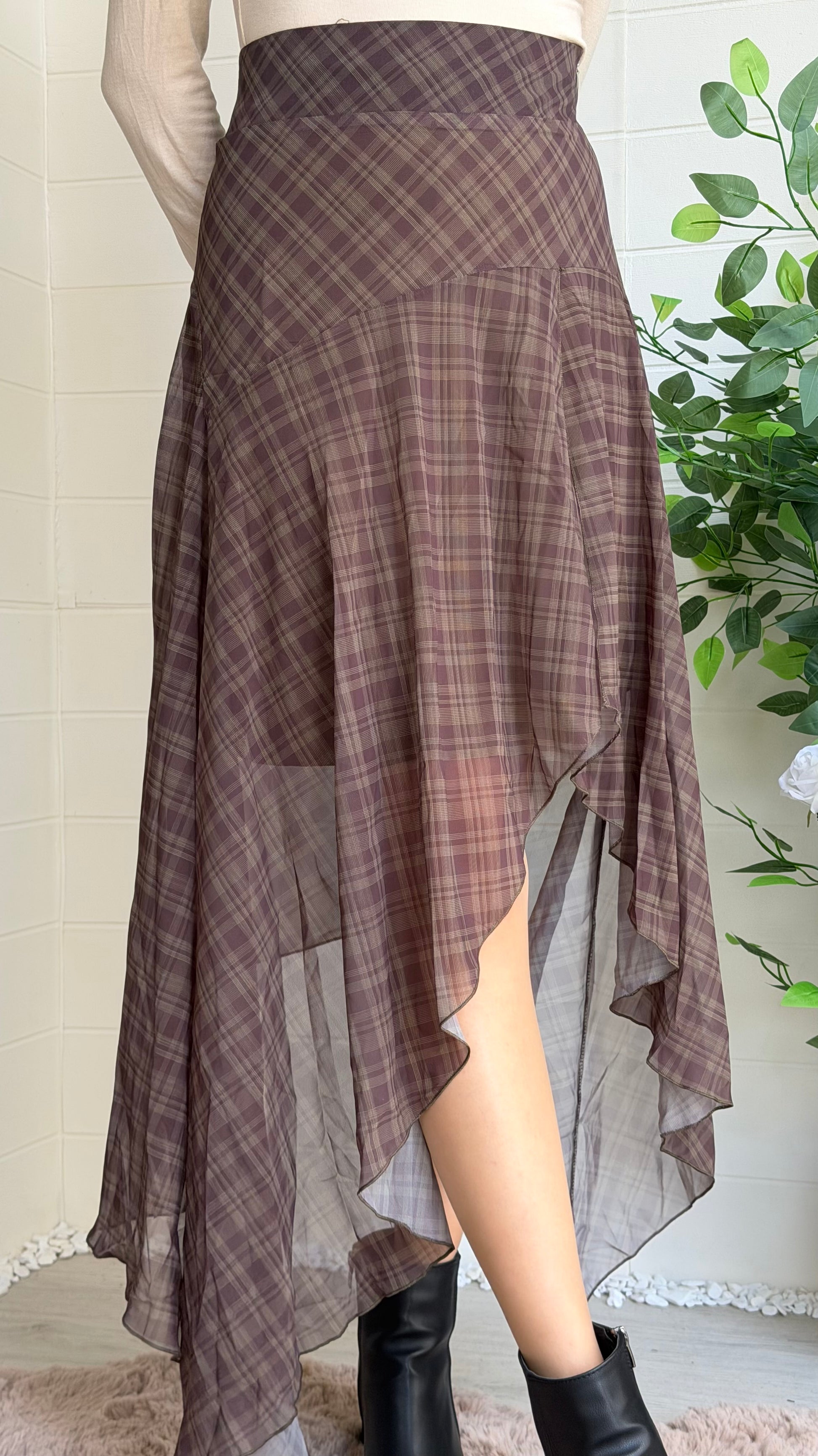 Ekose desenli şifon etek, volanlı ve dökümlü yüksek/orta bel kesimiyle hem günlük hem özel kombinler için ideal. Asimetrik etek uçlarıyla hareketli bir siluet yaratır.