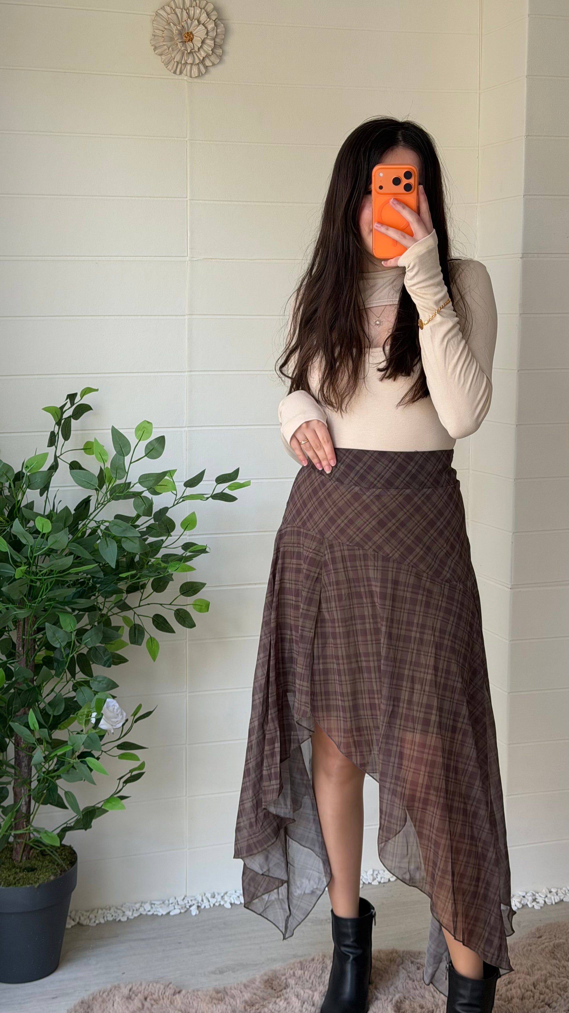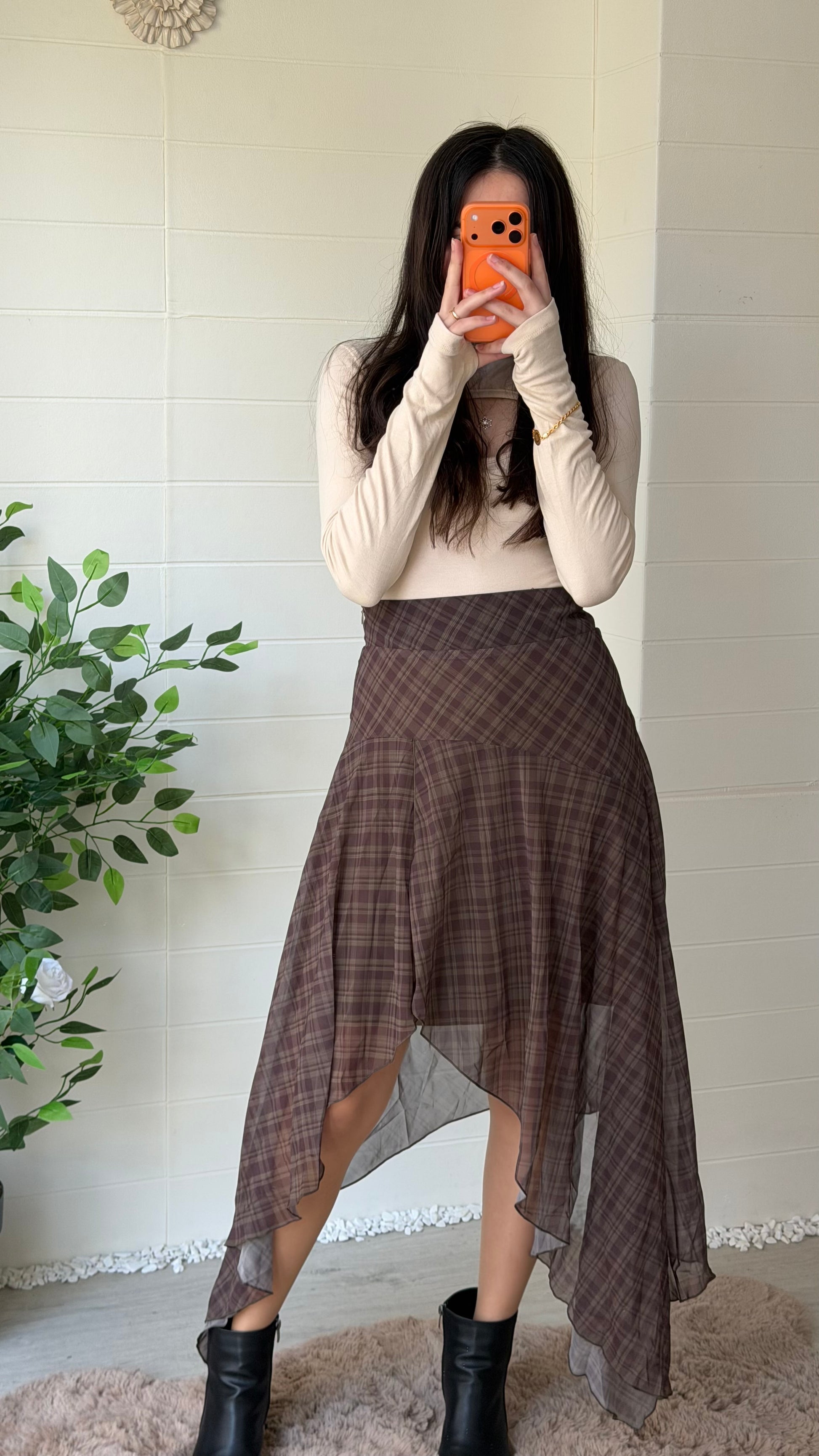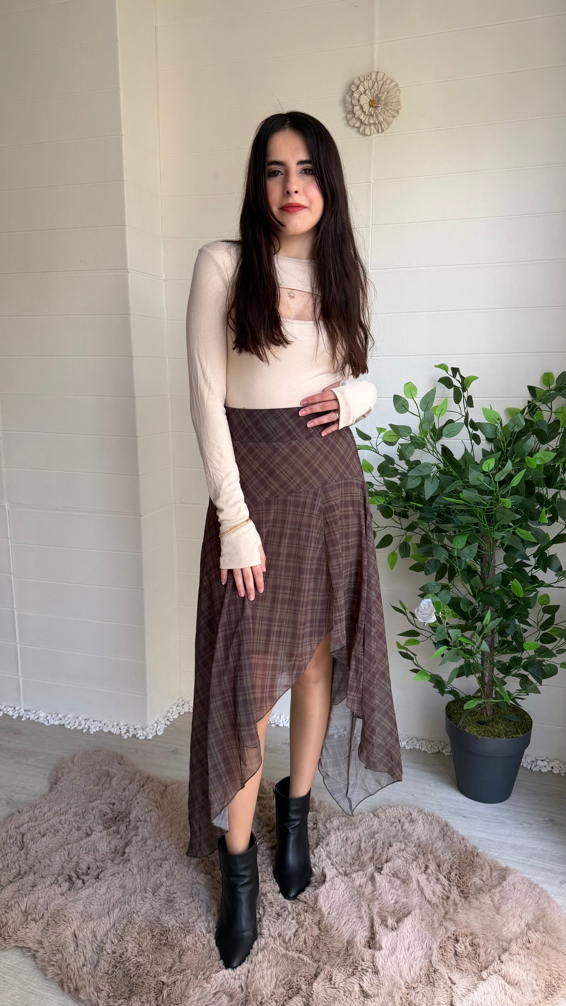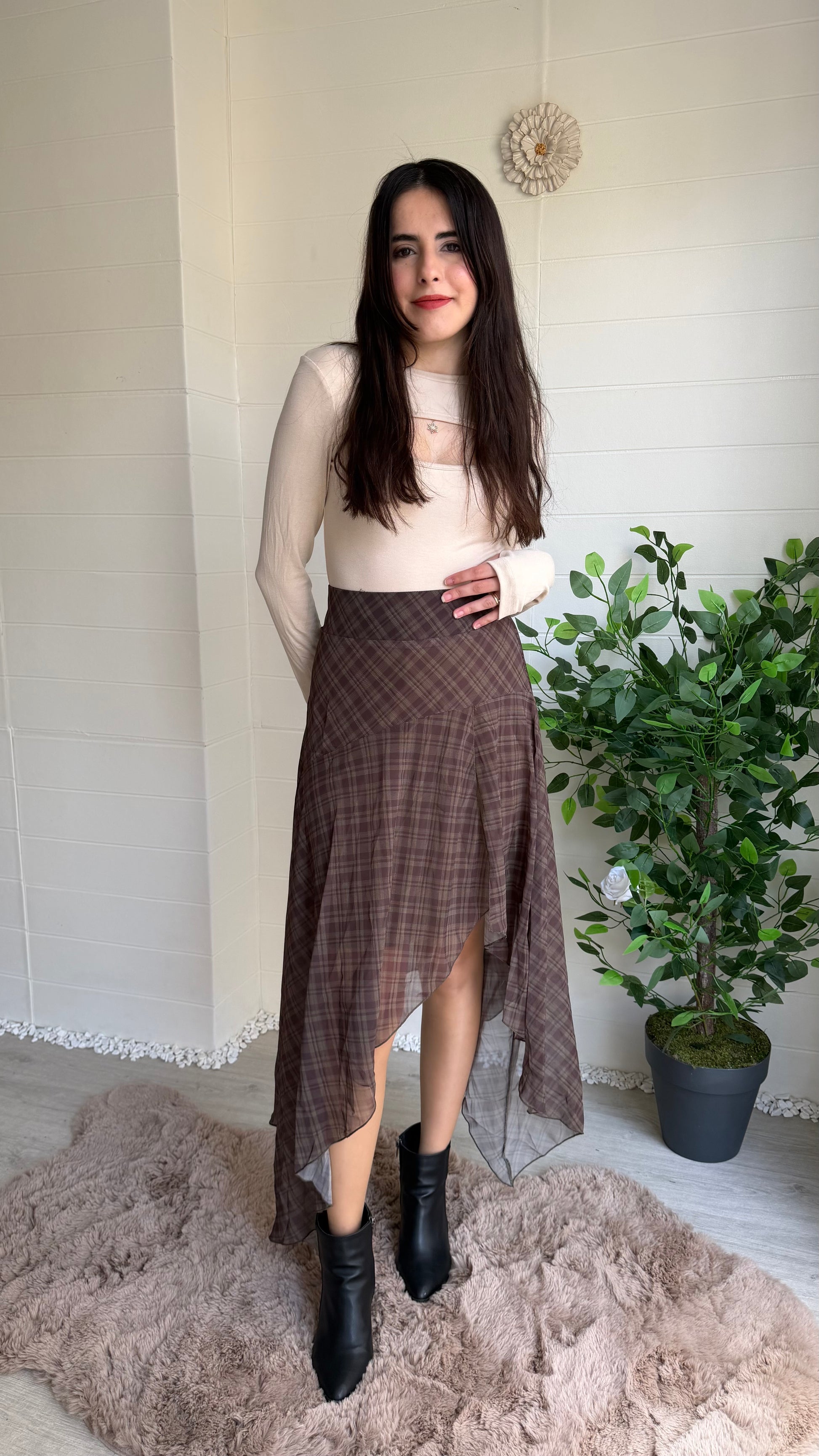 Ekose desenli şifon etek, volanlı ve dökümlü yüksek/orta bel kesimiyle hem günlük hem özel kombinler için ideal. Asimetrik etek uçlarıyla hareketli bir siluet yaratır.