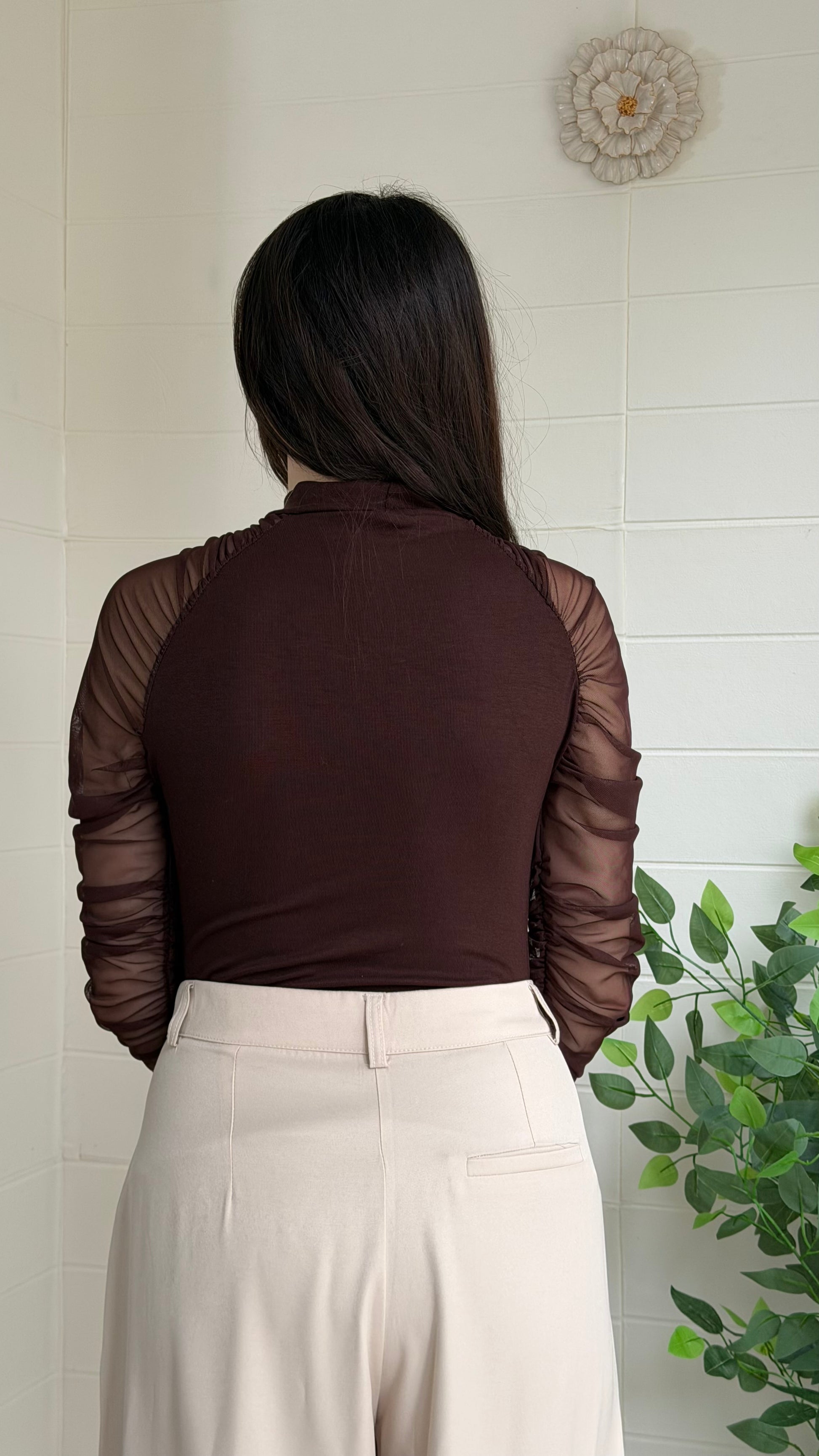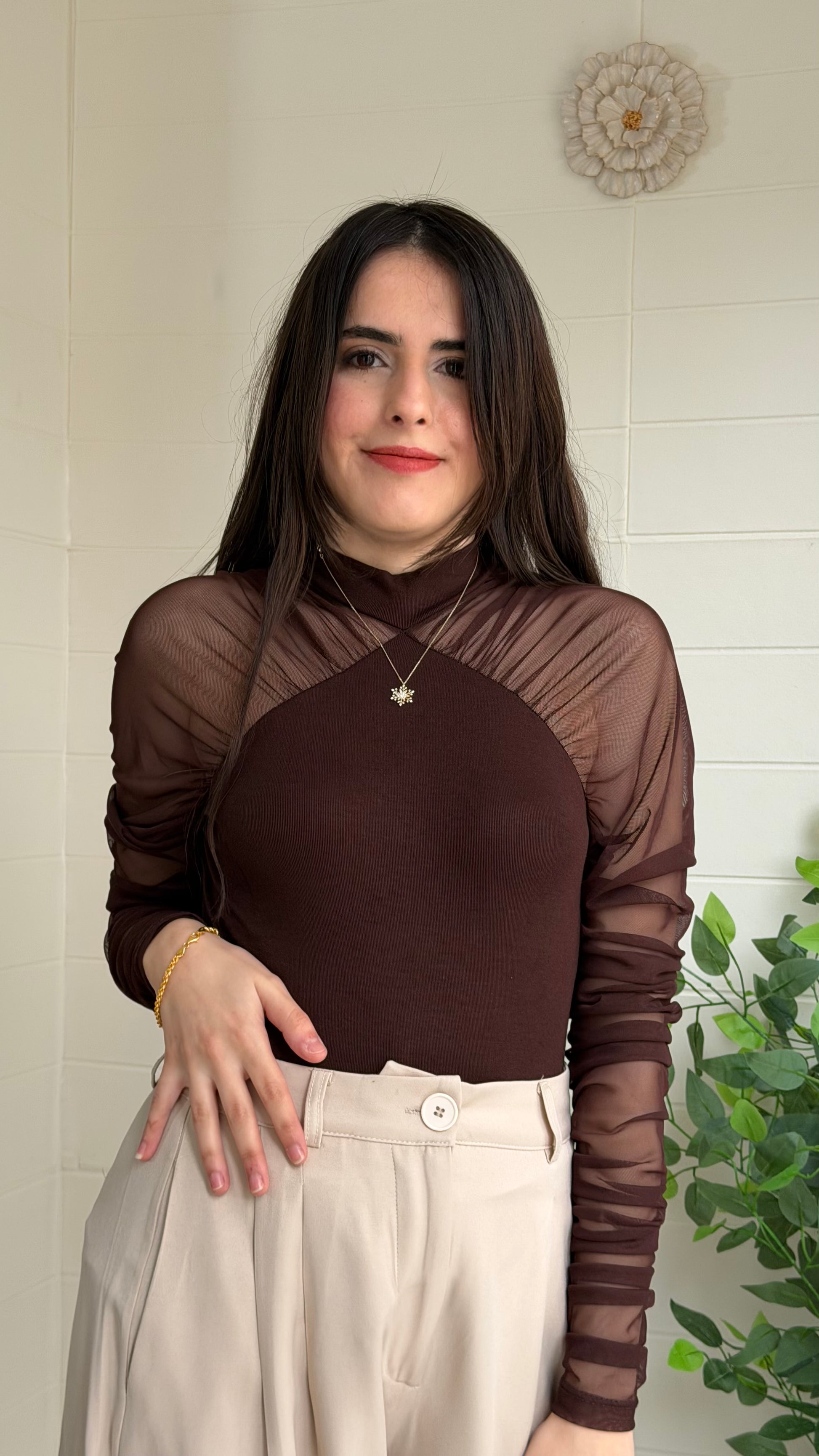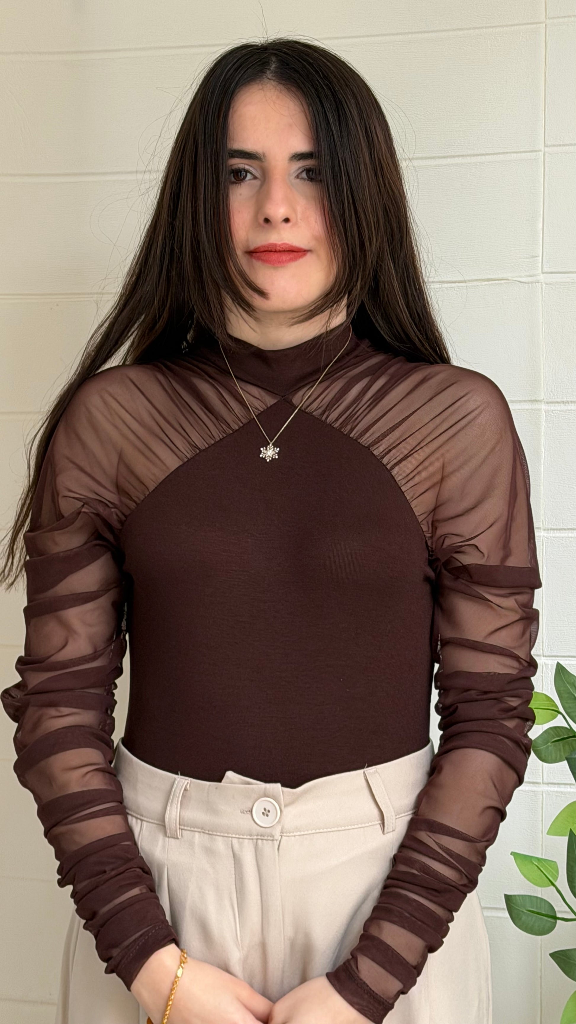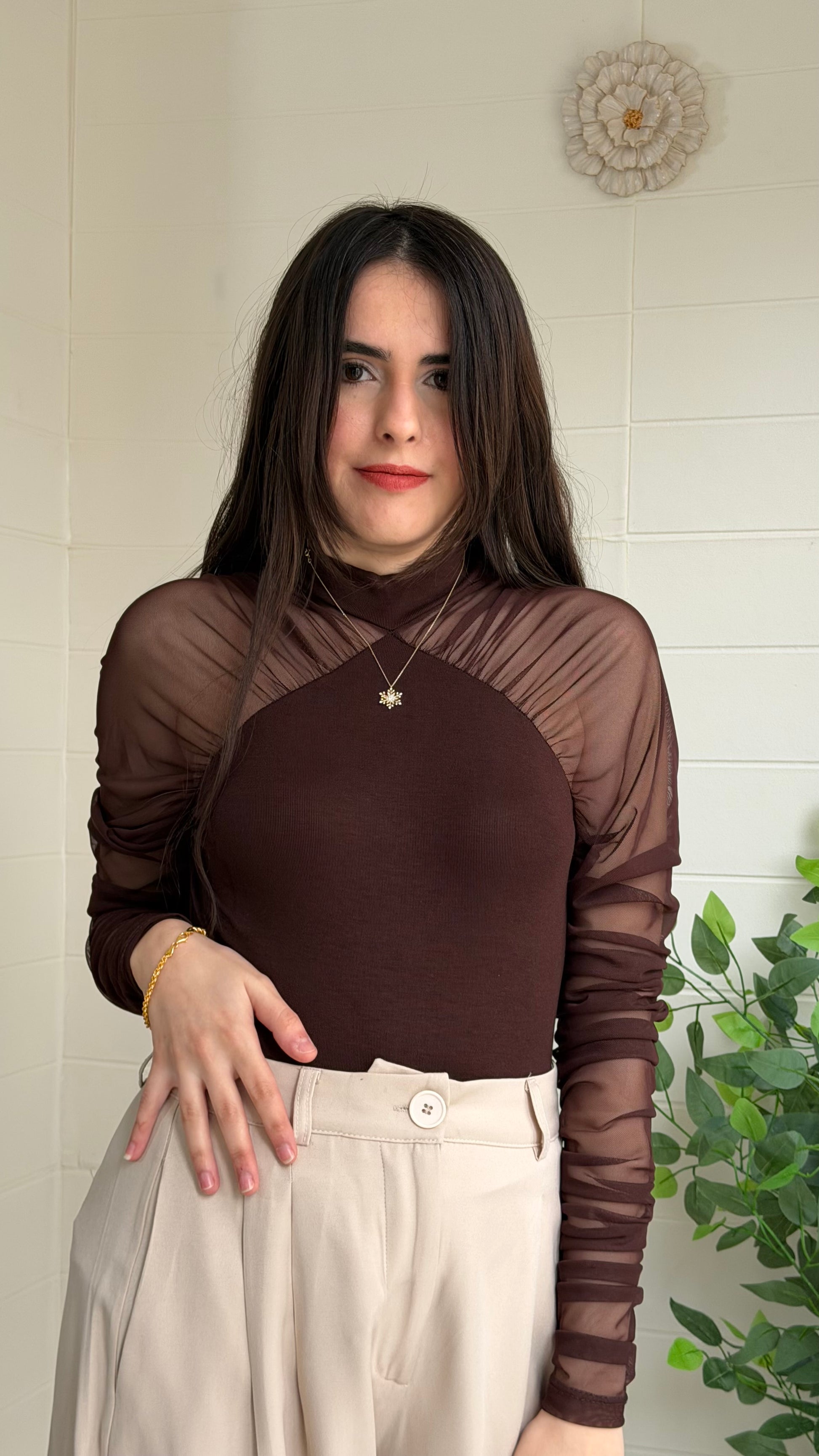 Yumuşak ve akıcı dokulu ribana bluz, yarı saydam tül kollarıyla modern ve zarif bir görünüm sunar. Vücuda uyumlu yapısı sayesinde günlük kombinlerden özel davet stiline kadar geniş kullanım alanı sağlar.