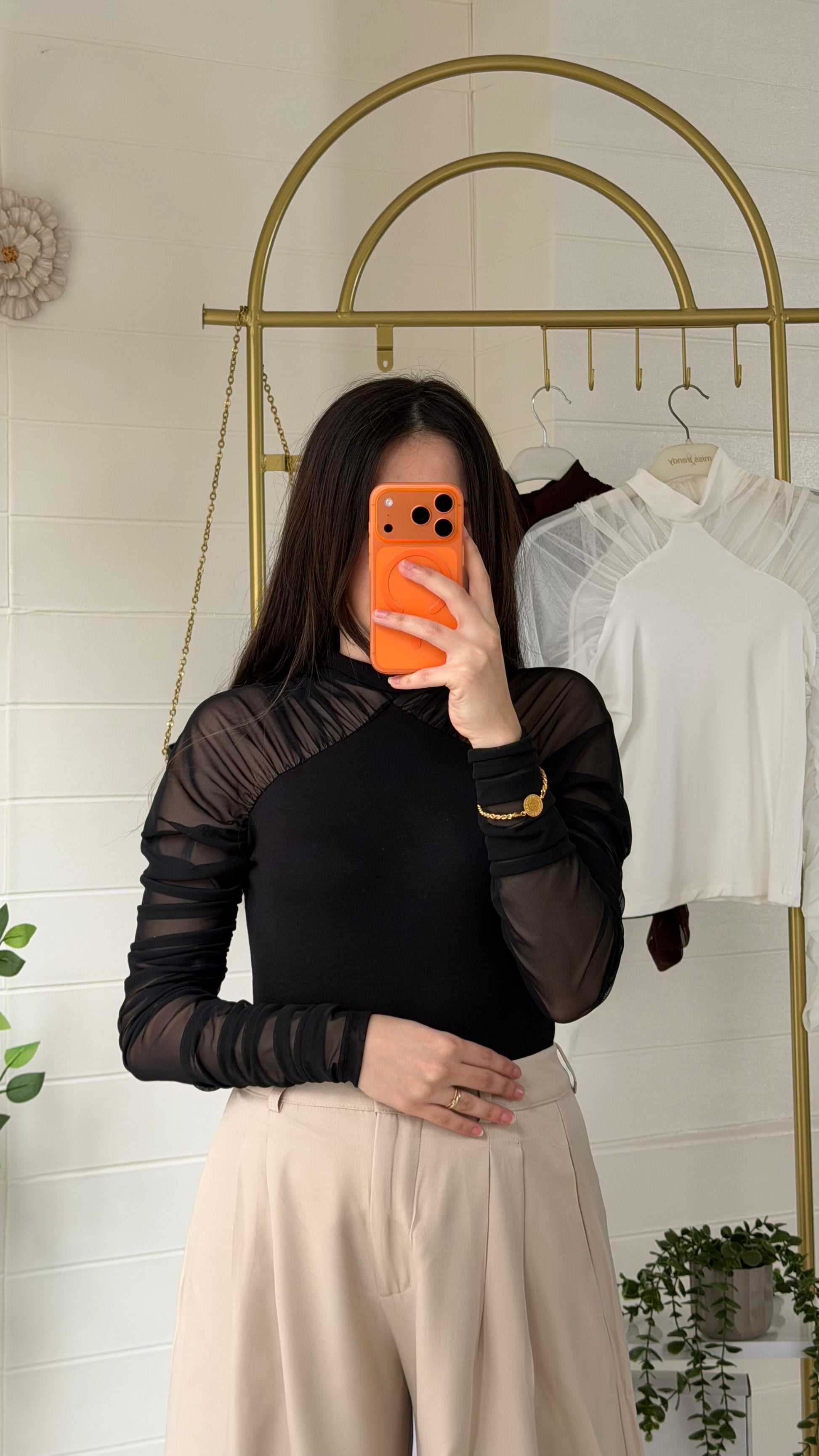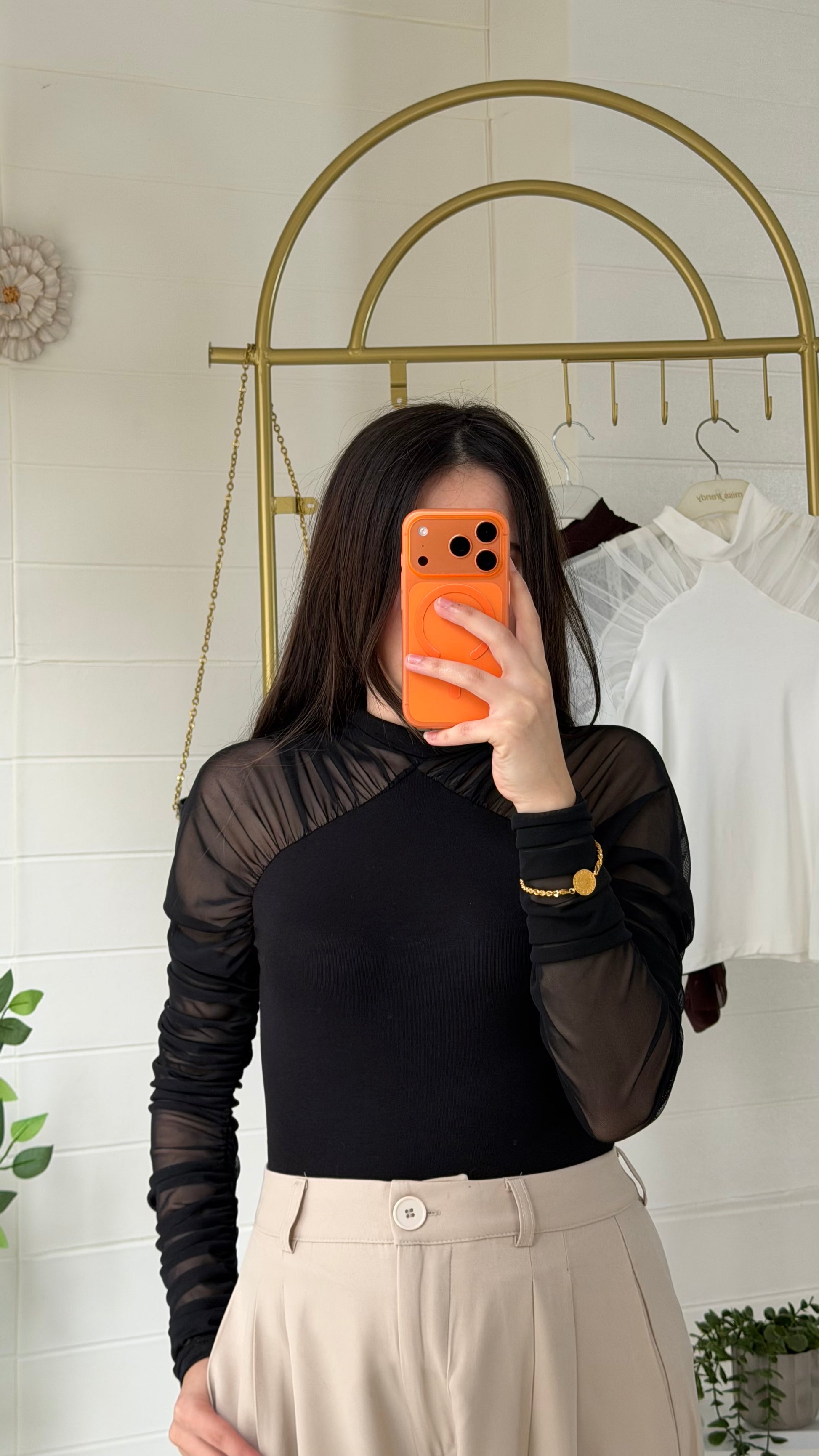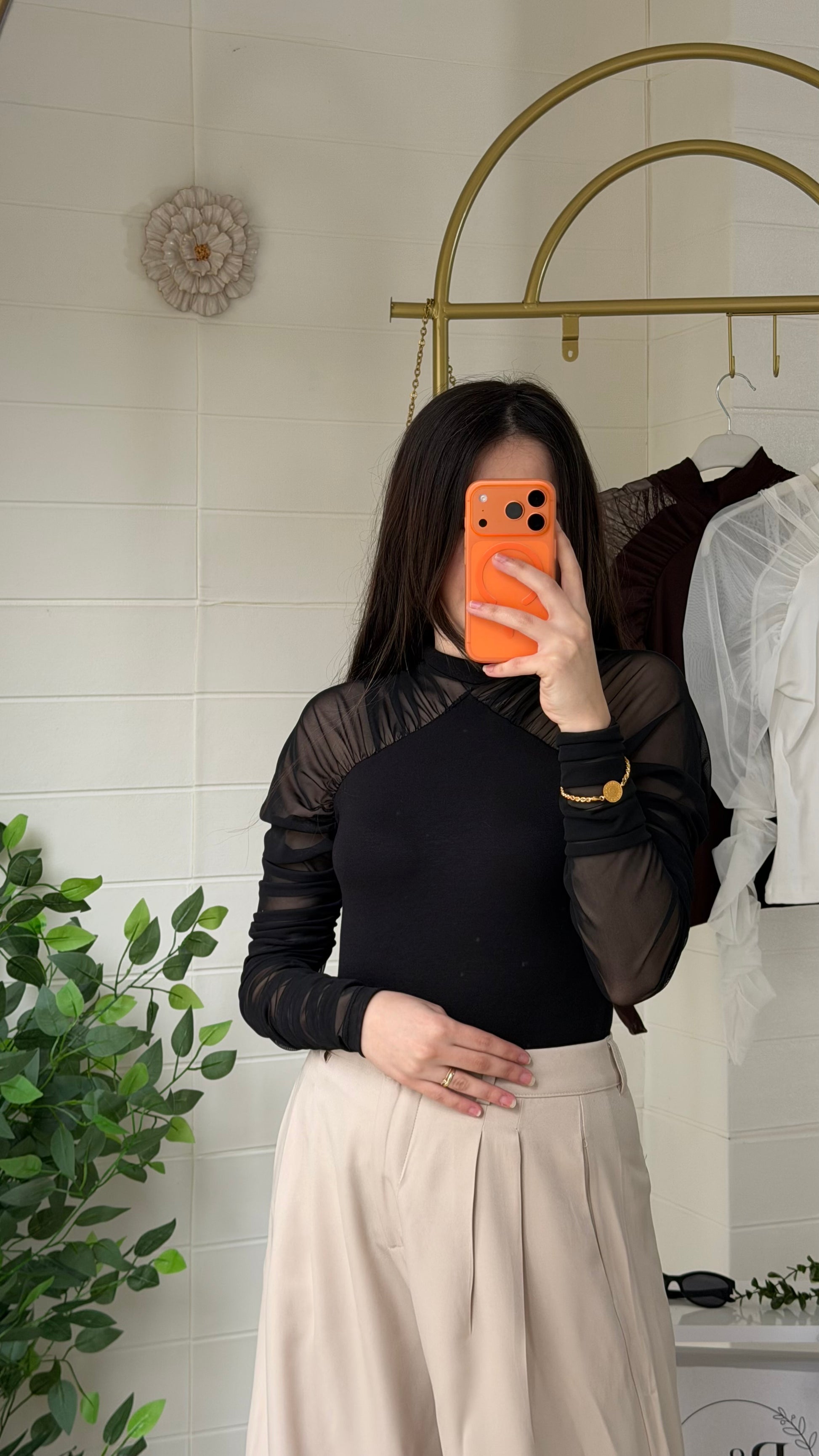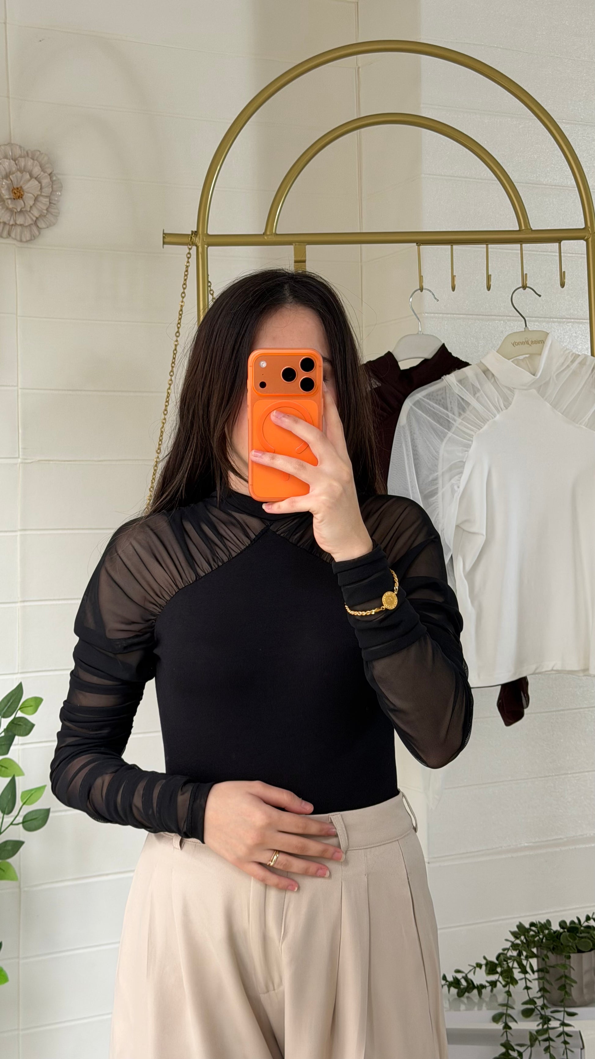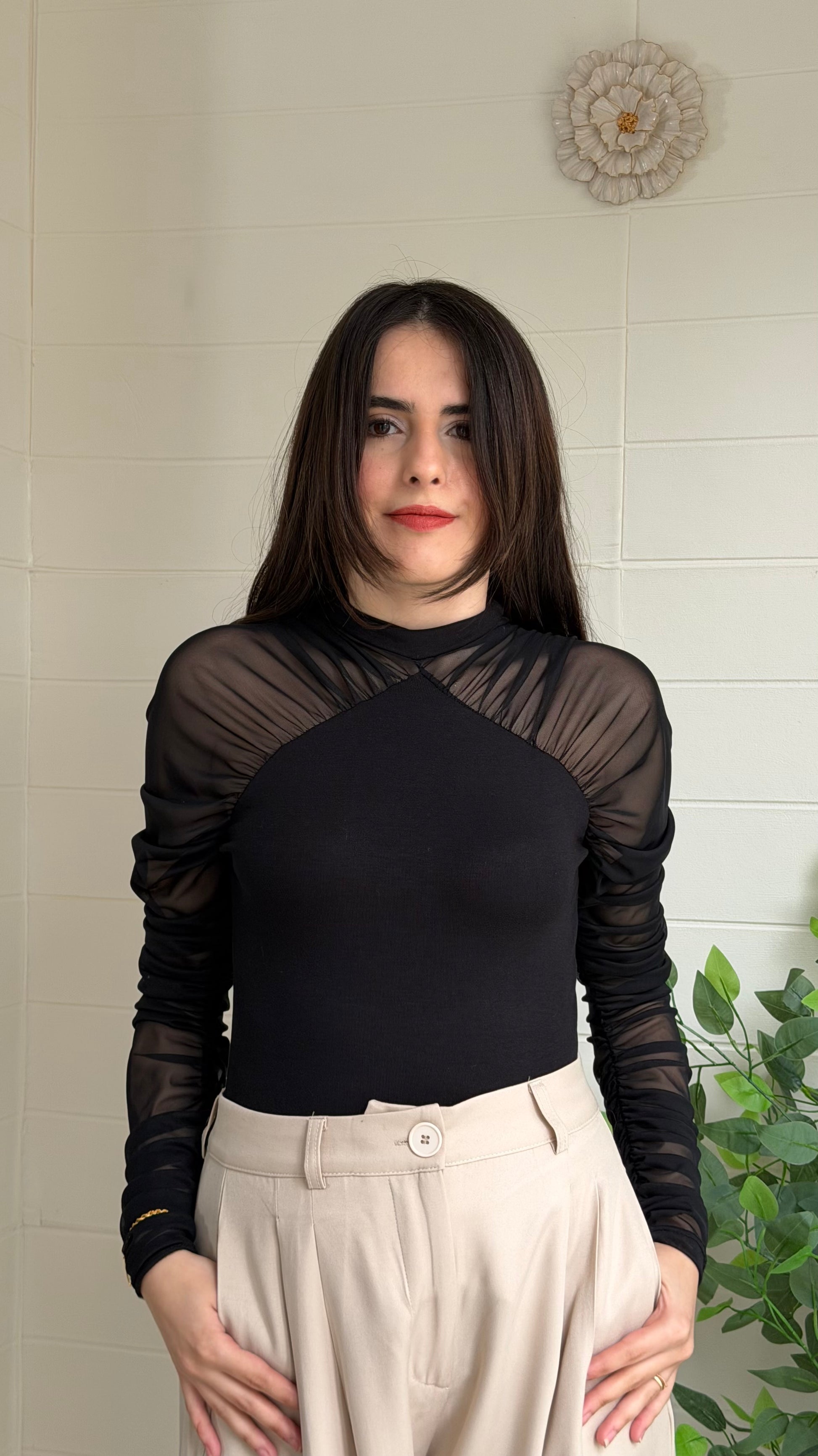 Yumuşak ve akıcı dokulu ribana bluz, yarı saydam tül kollarıyla modern ve zarif bir görünüm sunar. Vücuda uyumlu yapısı sayesinde günlük kombinlerden özel davet stiline kadar geniş kullanım alanı sağlar.