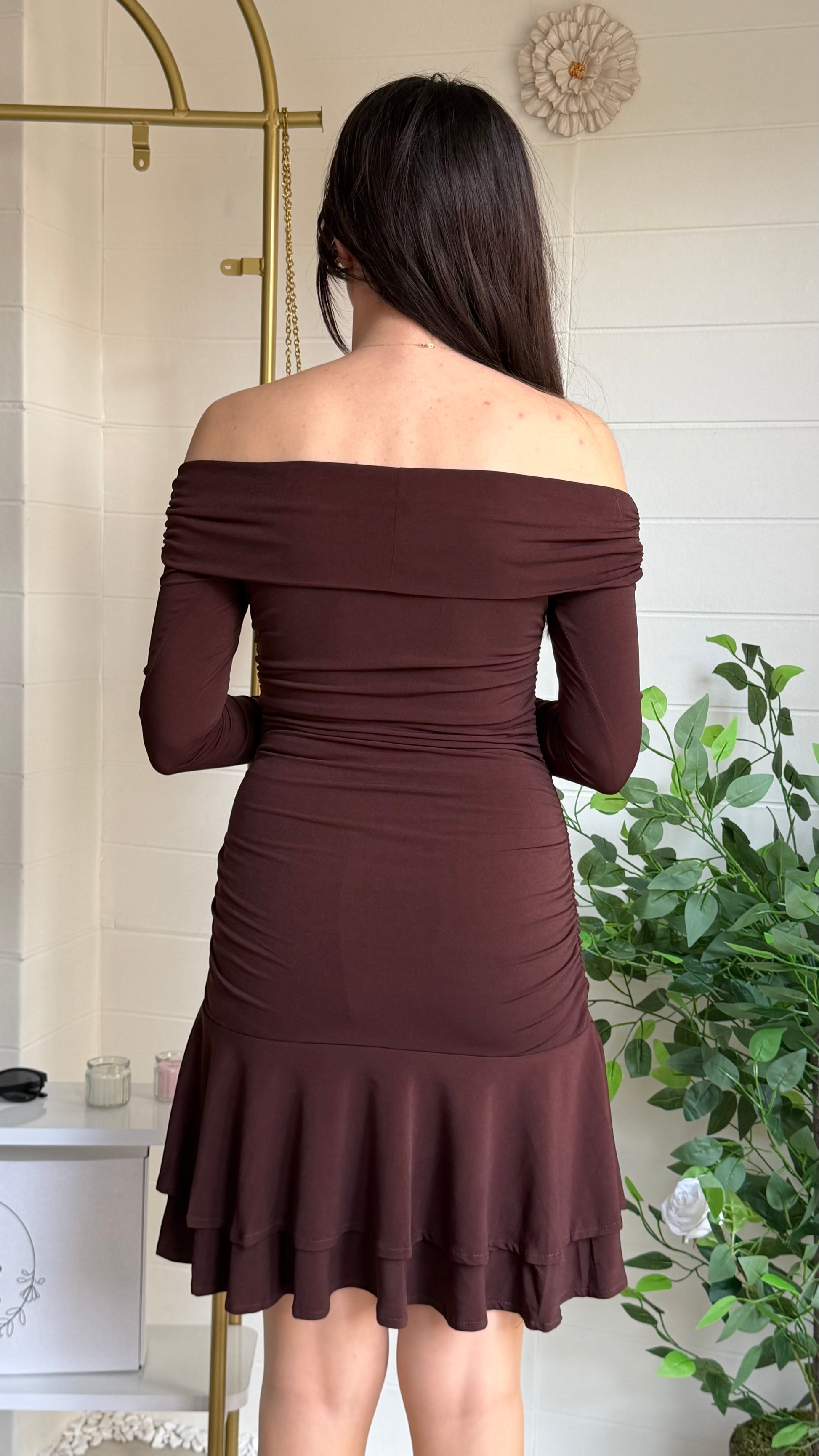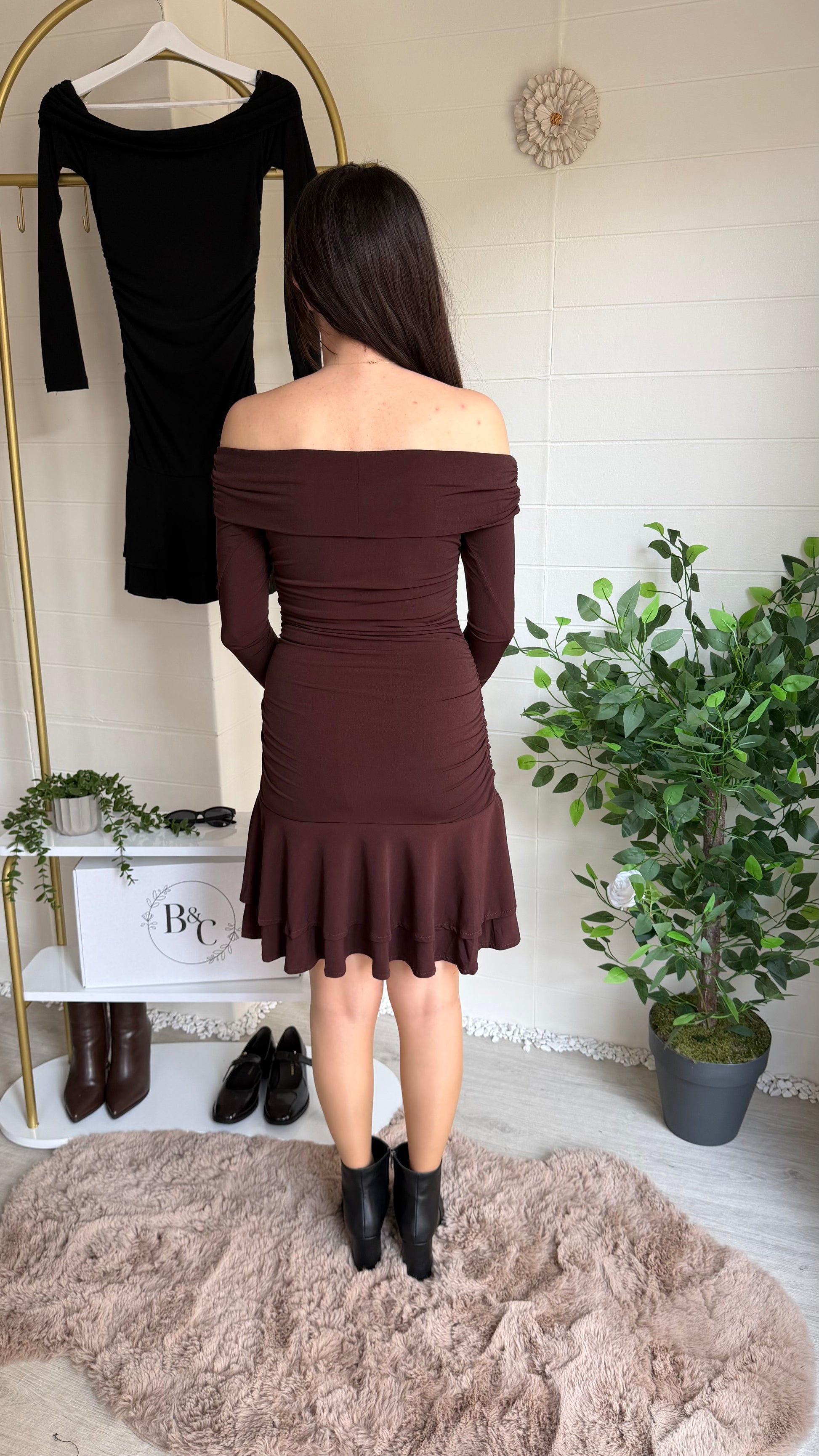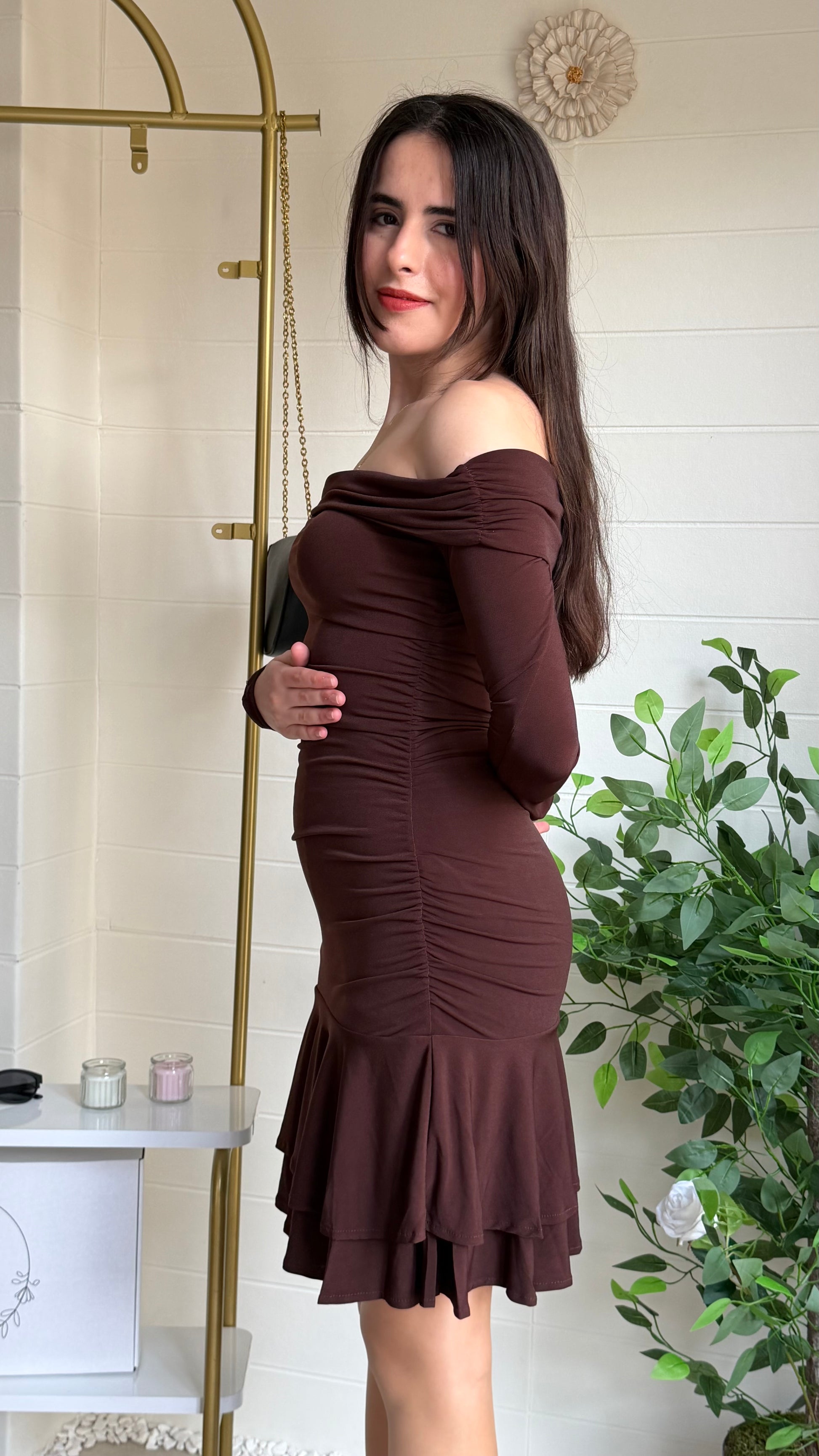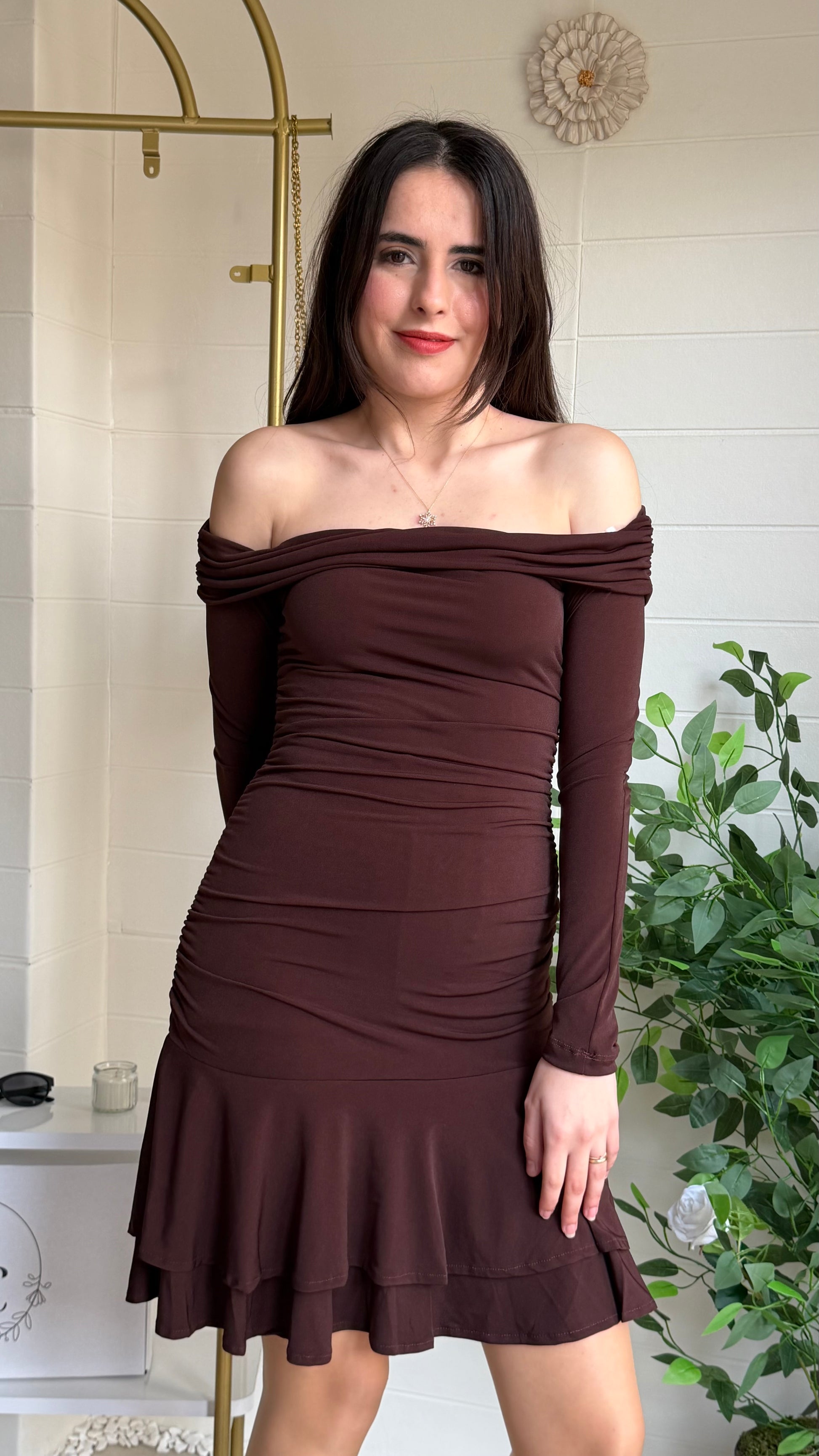 Zarafeti modern detaylarla buluşturan bu mini elbise, Madonna yaka kesimiyle omuz hattını ön plana çıkararak etkileyici bir silüet oluşturur. Gövde kısmındaki drape detayları vücut hatlarını toparlarken etek ucundaki katmanlı fırfırlar tasarıma hareketli ve romantik bir hava katar.