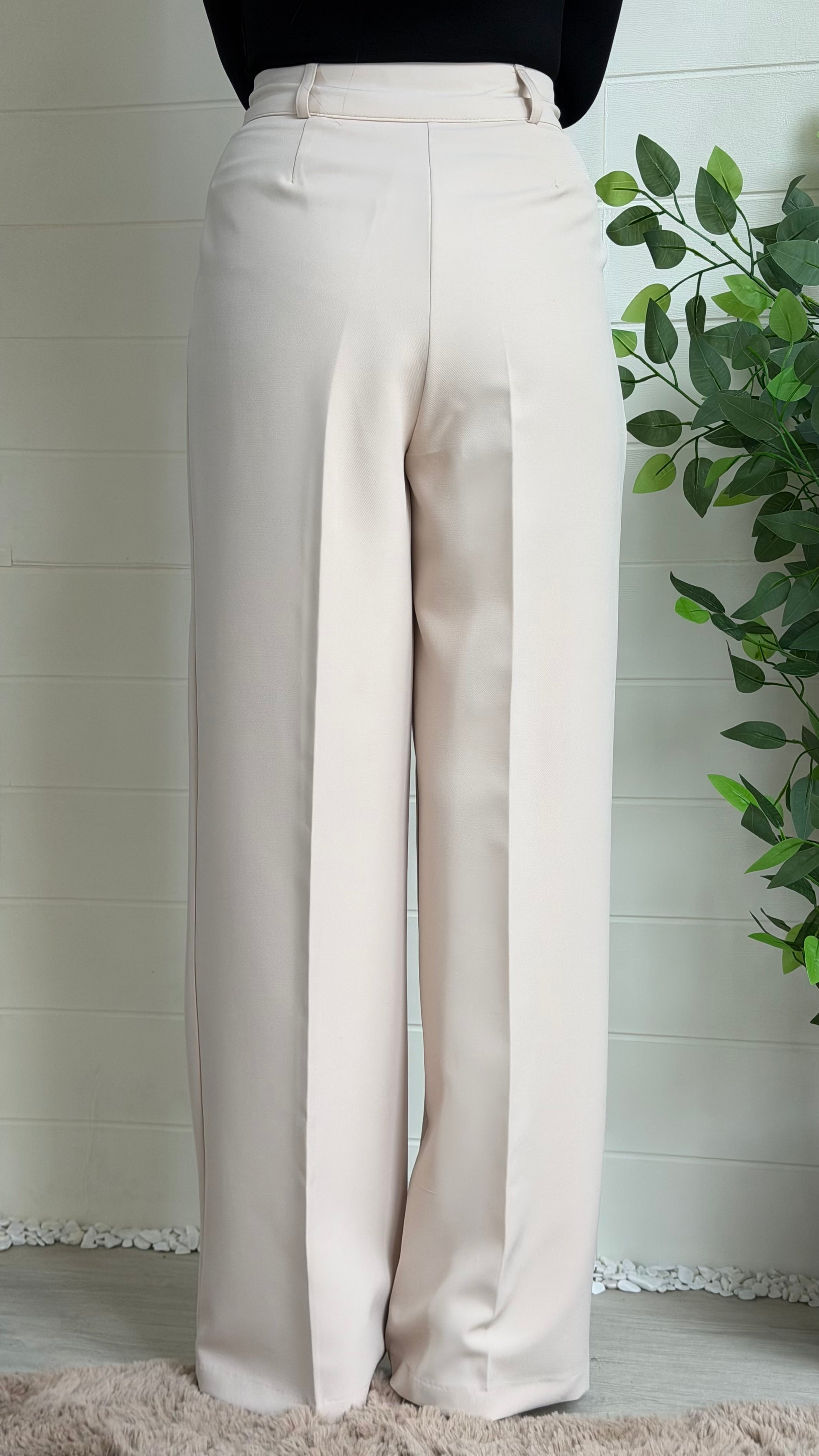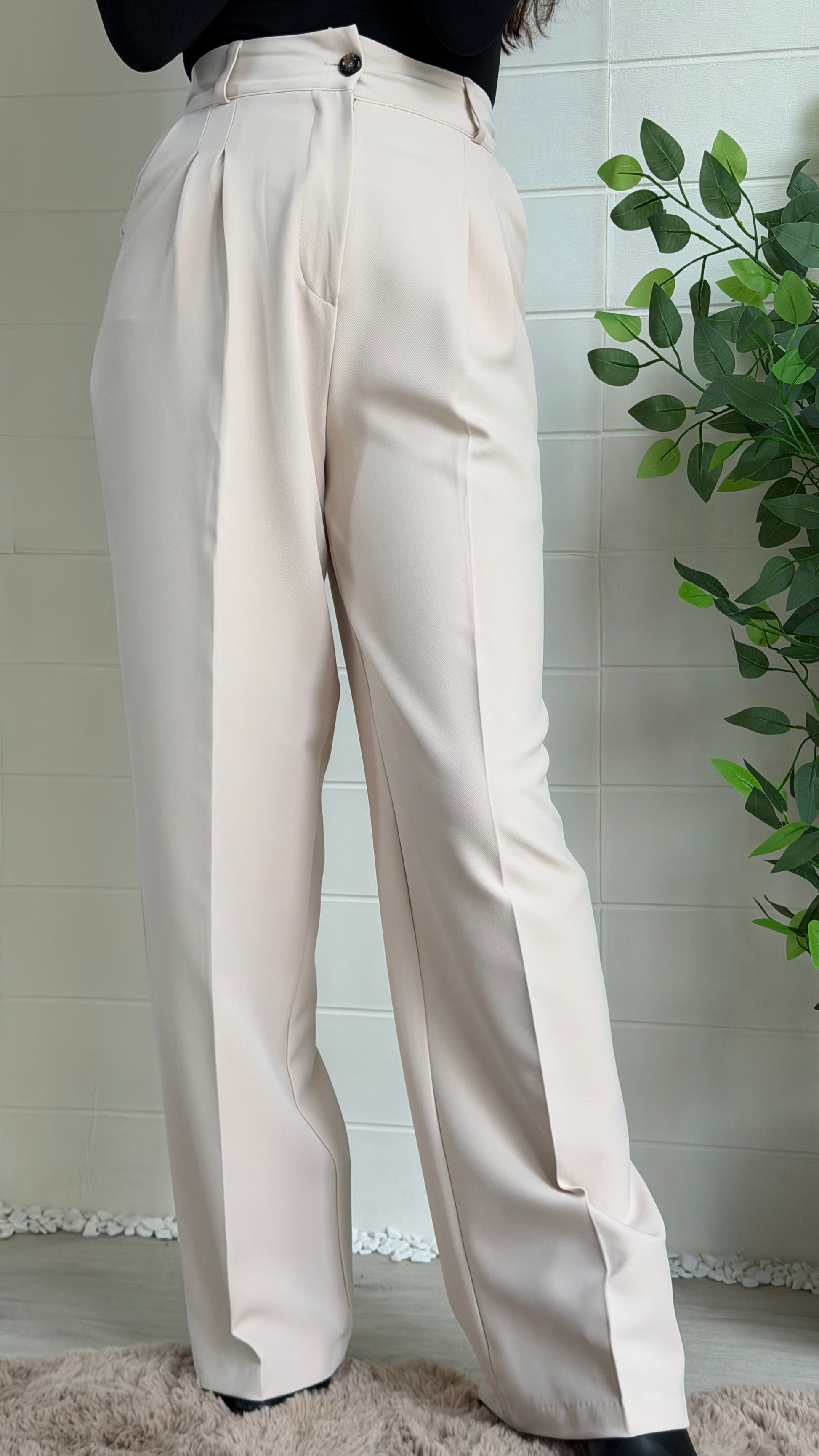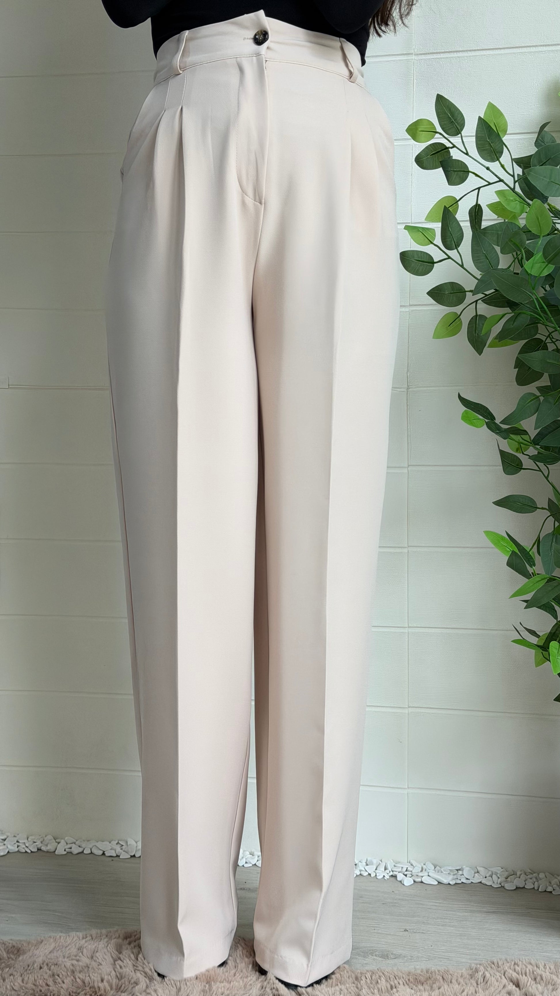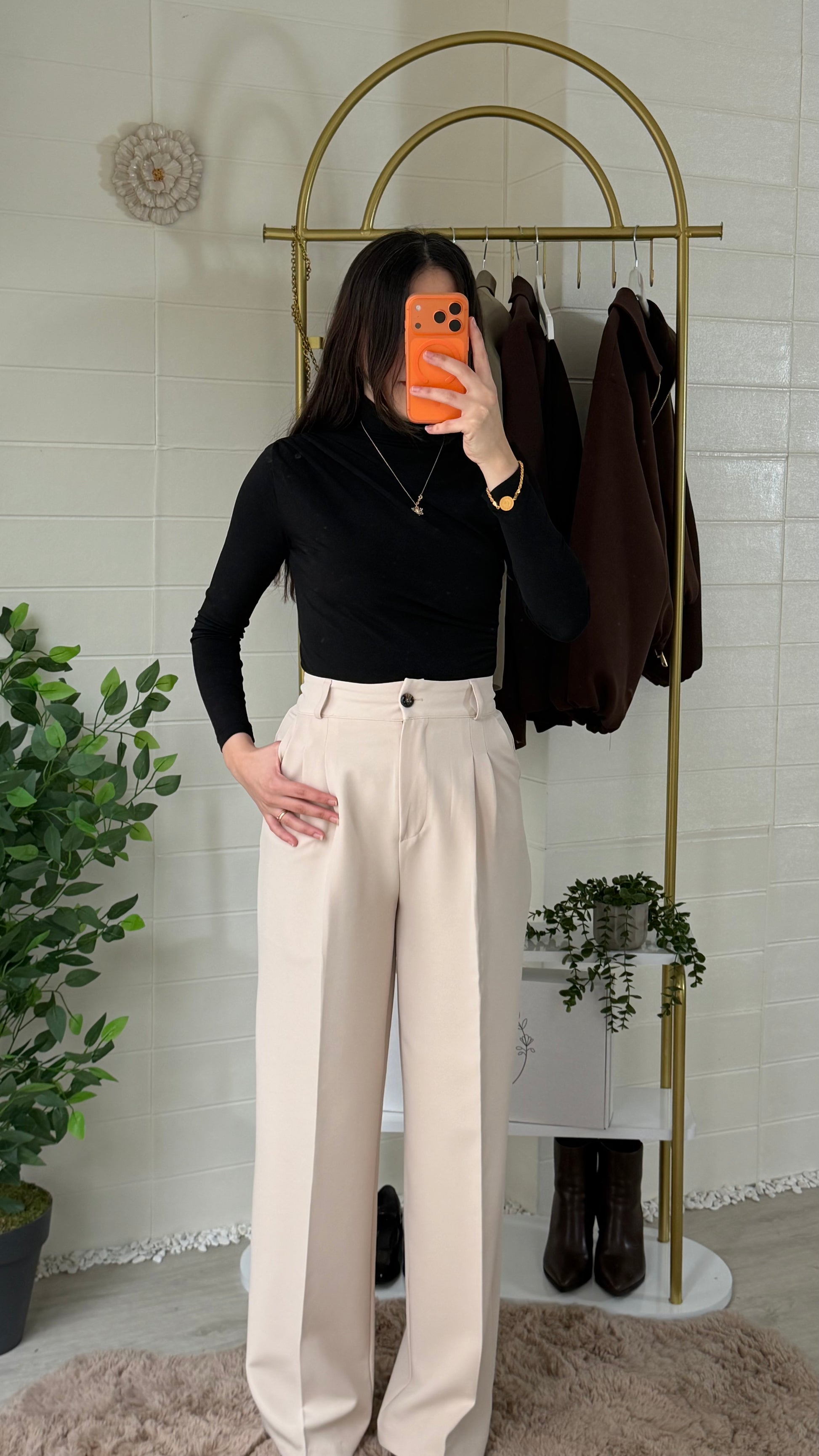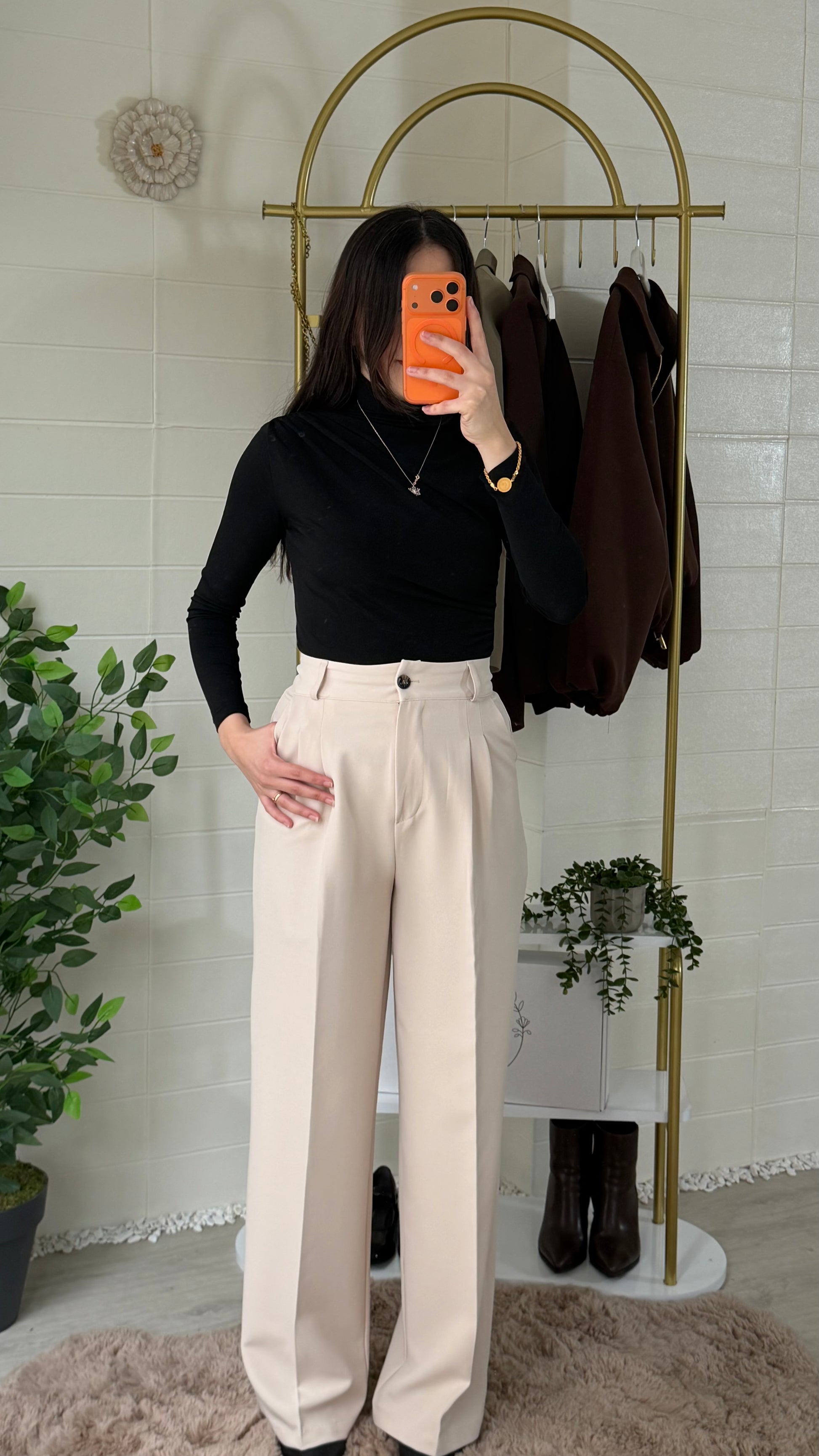 Yüksek bel, bol ve geniş paça palazzo pantolon. Önde pileli detaylar, keskin ve zarif bir siluet oluşturur. Günlük ve iş ortamlarında rahatlıkla kullanılabilir.