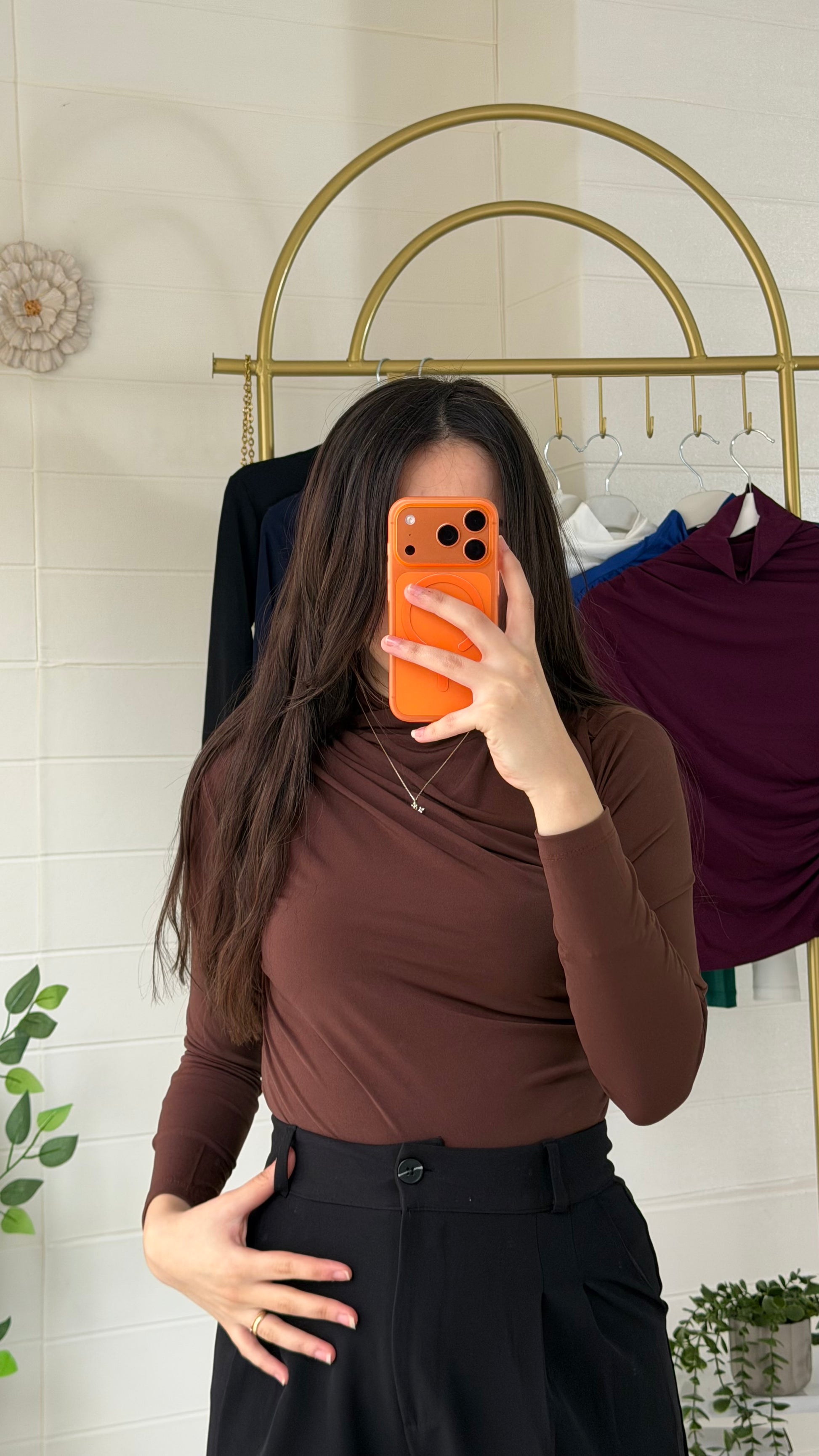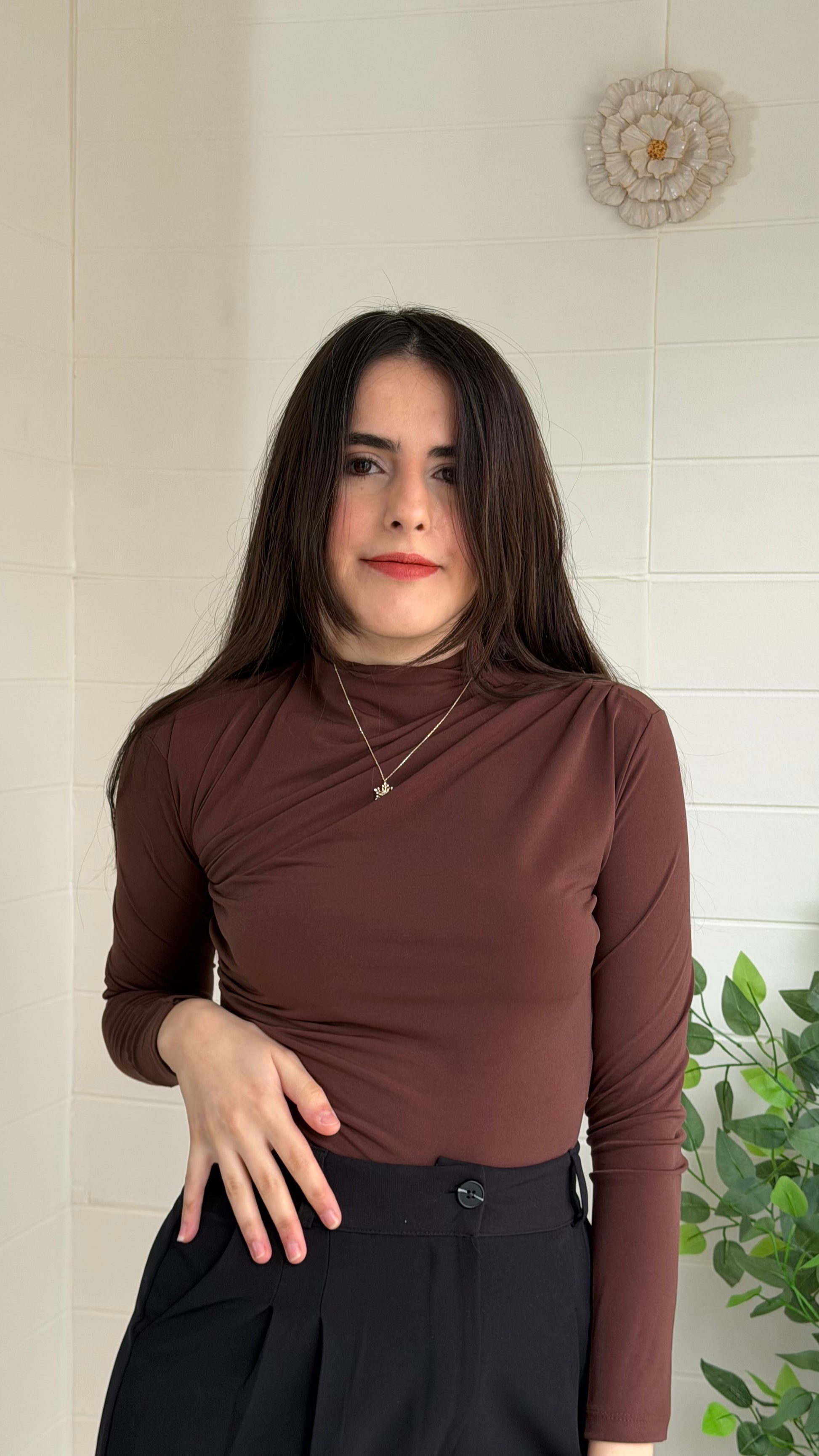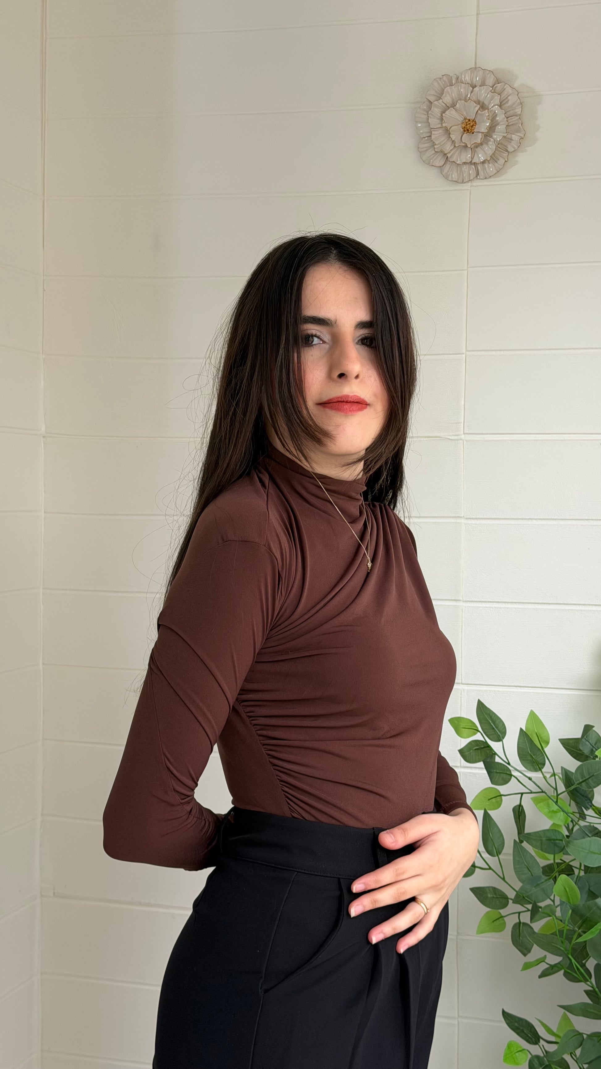 Omuz ve yan büzgü detaylarıyla modern bir siluet sunan bu bodysuit, vücuda oturan kesimi ve yüksek yaka tasarımıyla zarif bir görünüm sağlar. Günlük kullanımın yanı sıra özel kombinlerde de rahatlıkla tercih edilebilir.