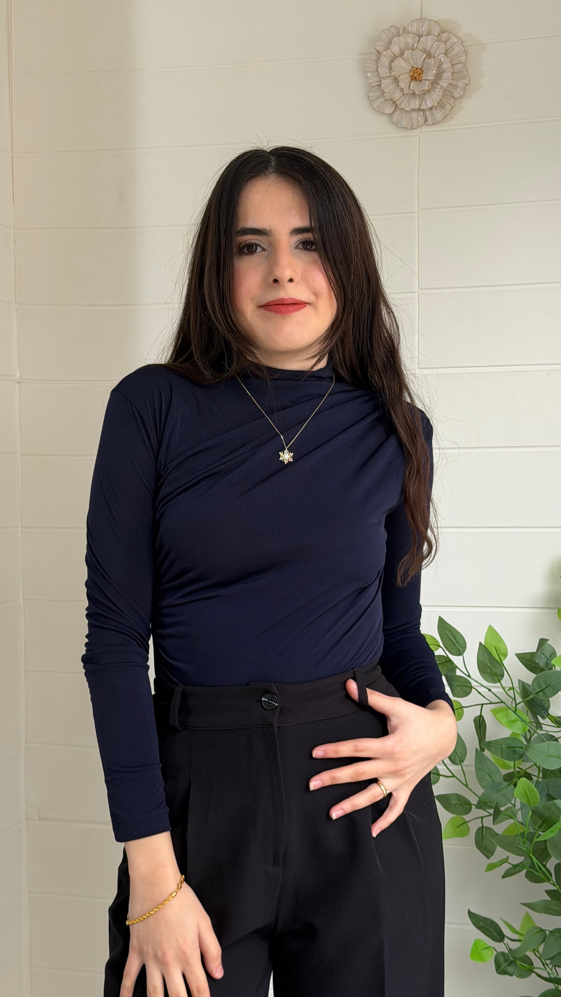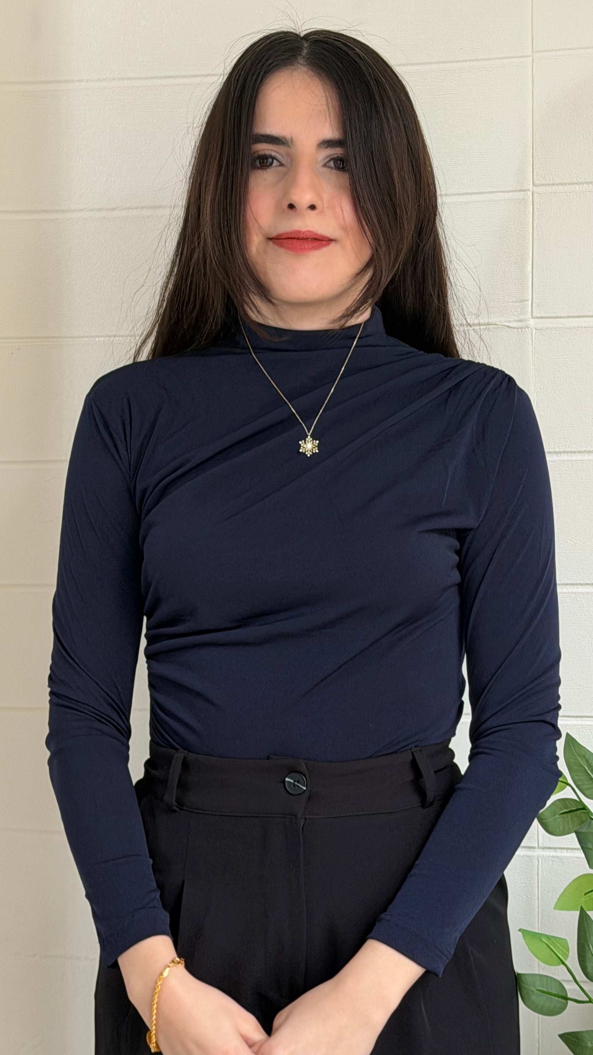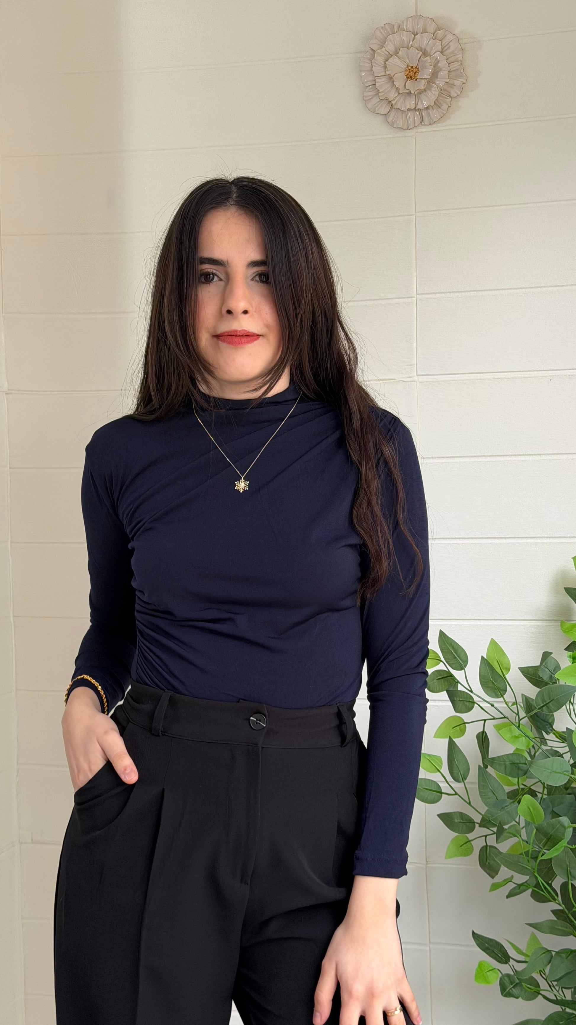 Omuz ve yan büzgü detaylarıyla modern bir siluet sunan bu bodysuit, vücuda oturan kesimi ve yüksek yaka tasarımıyla zarif bir görünüm sağlar. Günlük kullanımın yanı sıra özel kombinlerde de rahatlıkla tercih edilebilir.