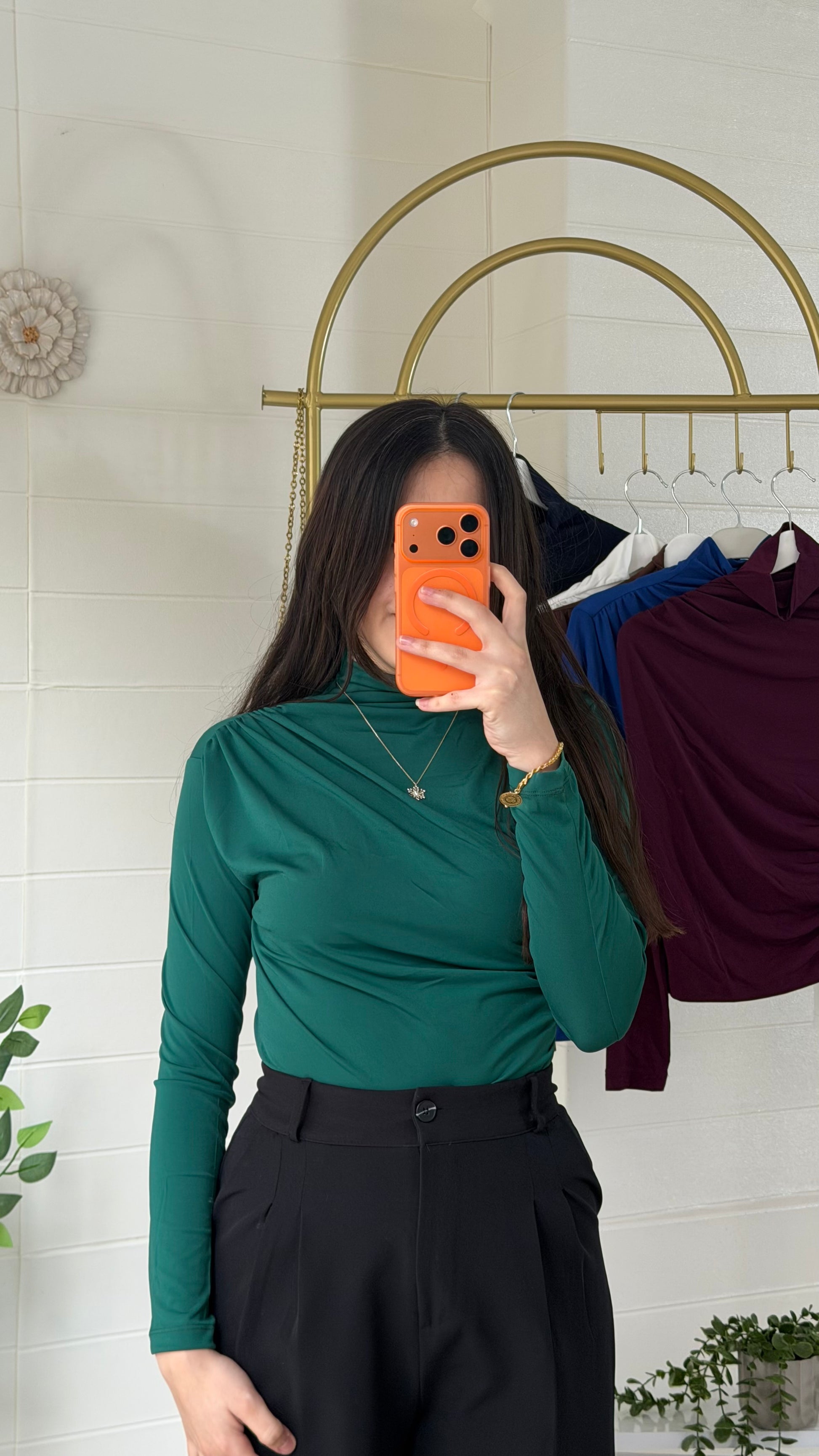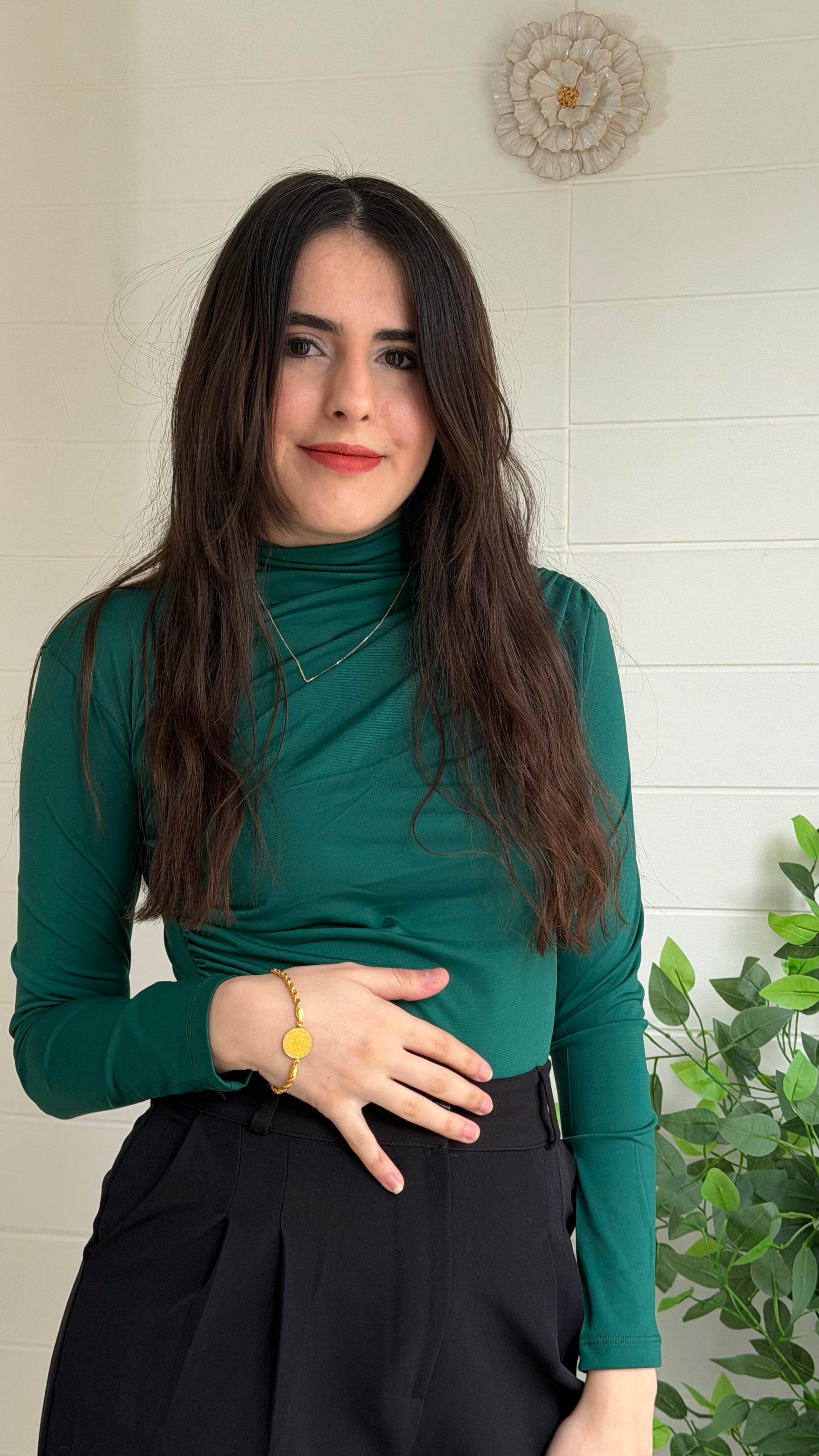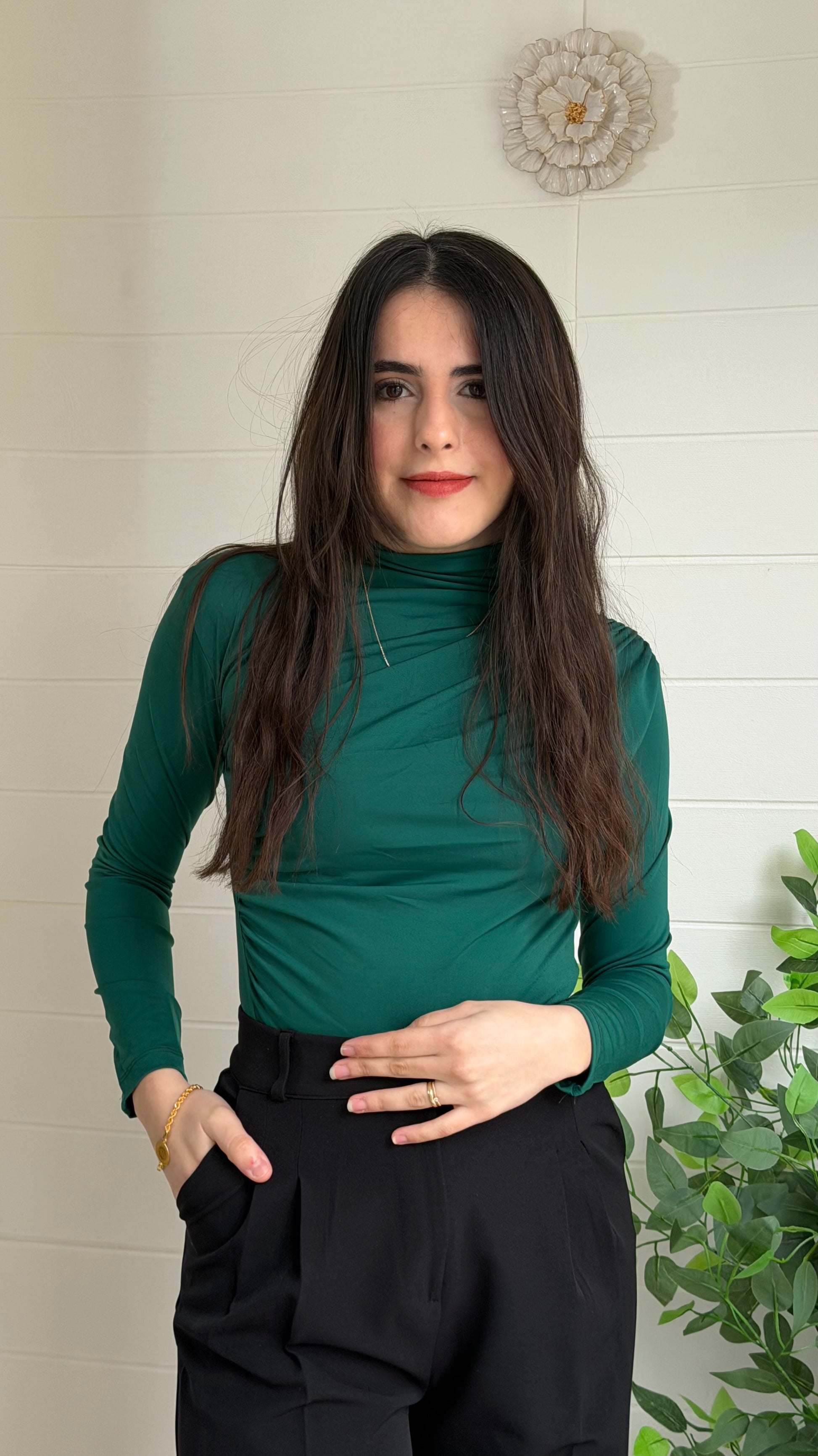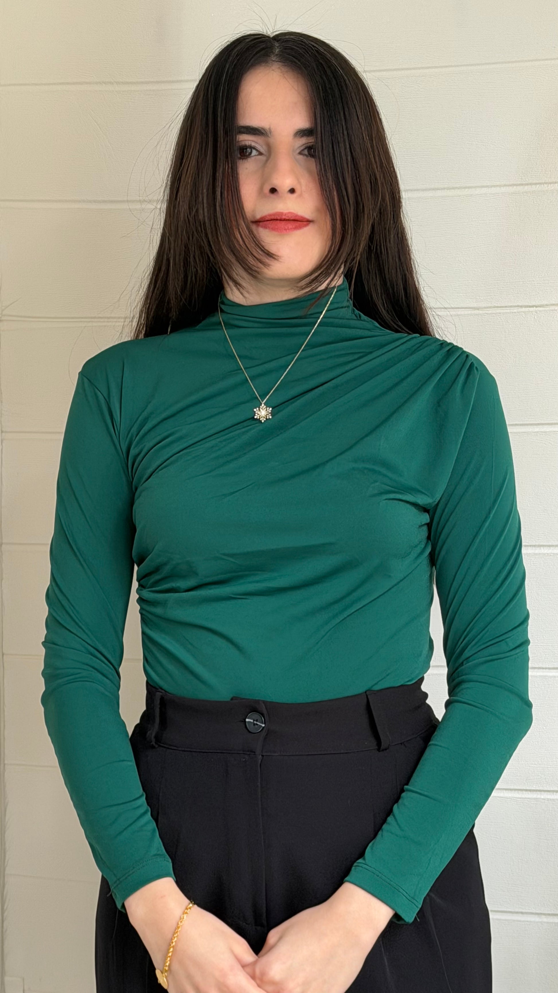 Omuz ve yan büzgü detaylarıyla modern bir siluet sunan bu bodysuit, vücuda oturan kesimi ve yüksek yaka tasarımıyla zarif bir görünüm sağlar. Günlük kullanımın yanı sıra özel kombinlerde de rahatlıkla tercih edilebilir.