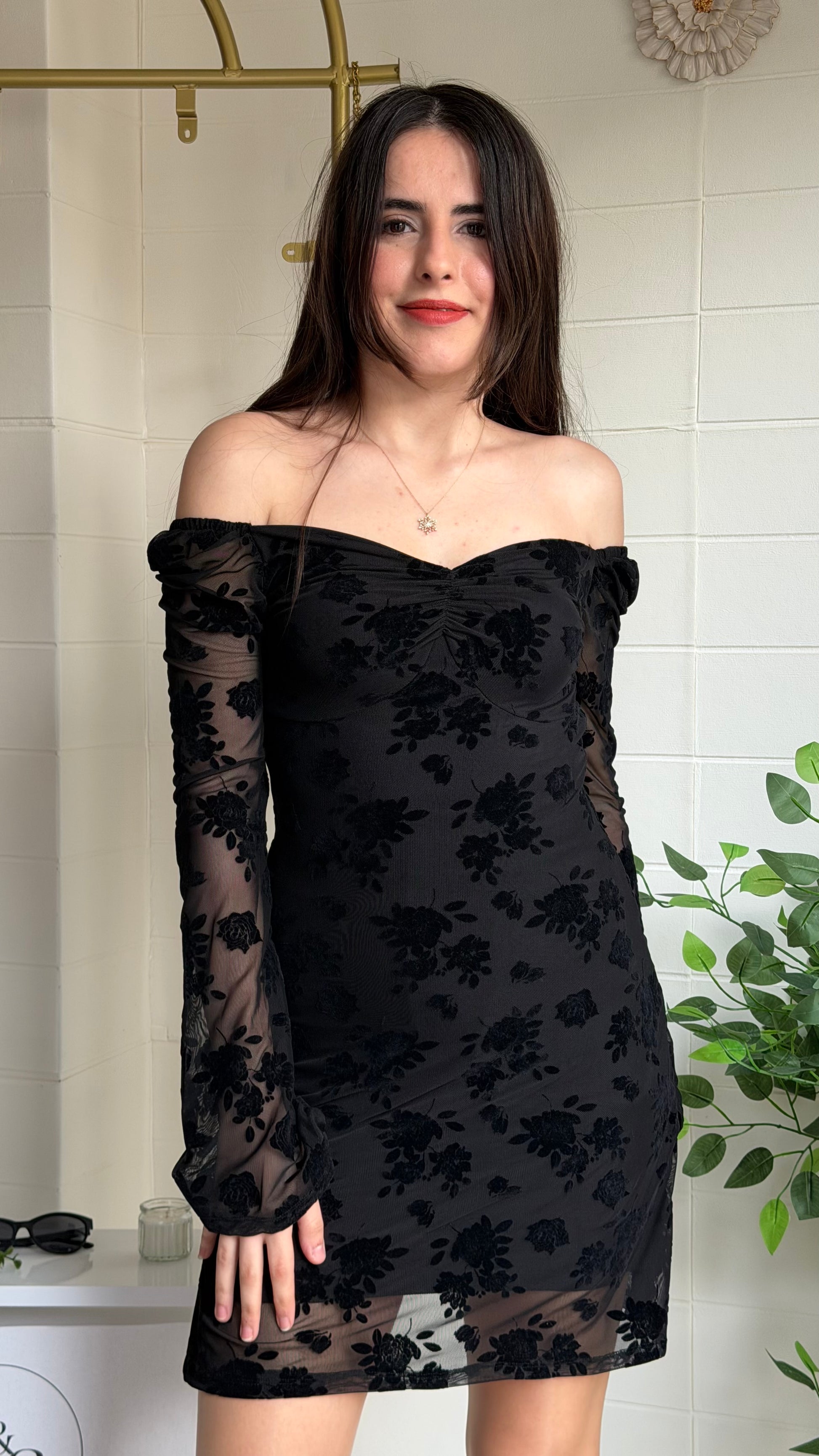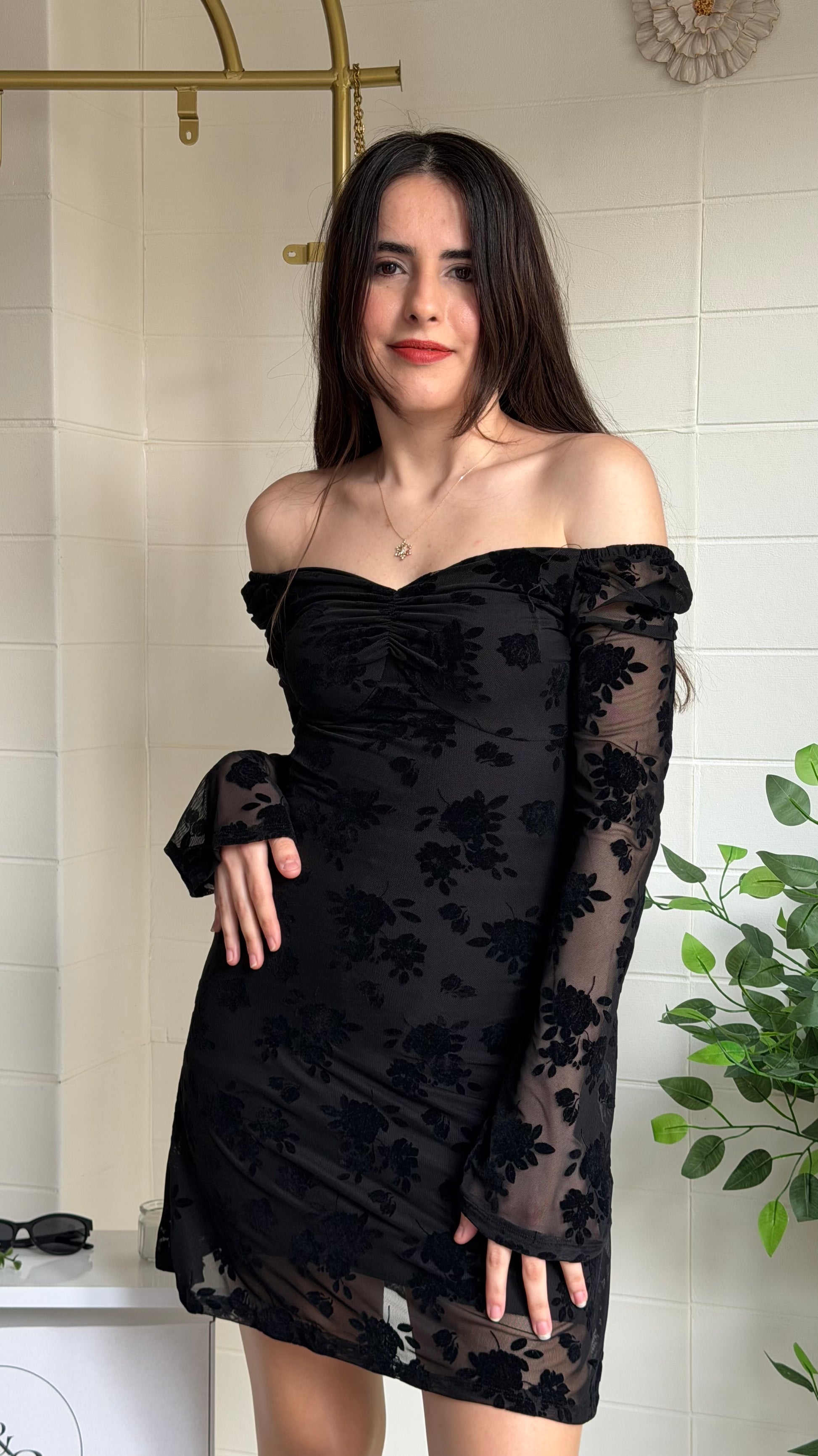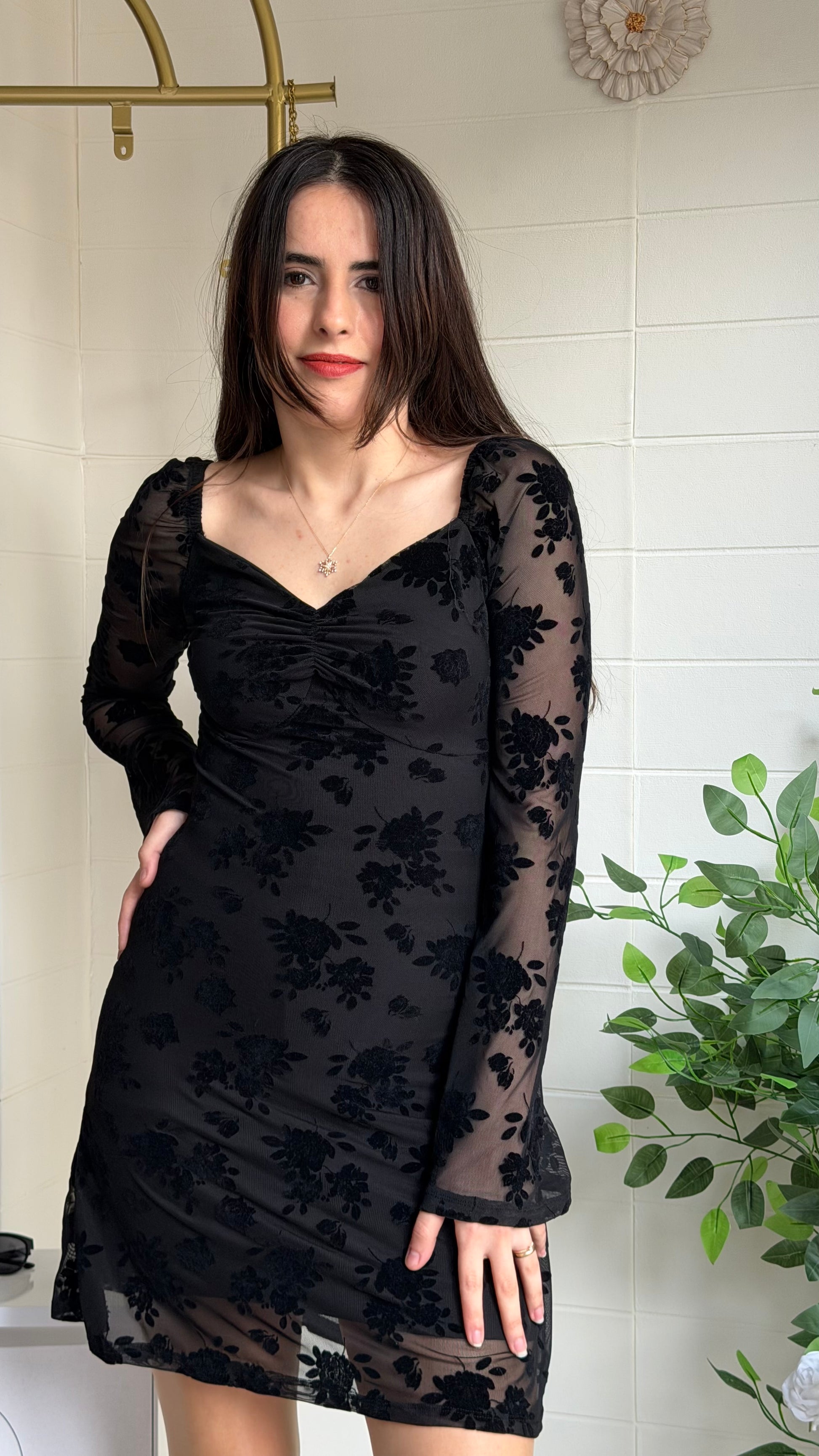 Modern zarafeti romantik dokunuşlarla buluşturan bu kısa elbise, flok çiçek dokulu yüzeyi ve göğüs kısmındaki büzgü detayıyla feminen bir siluet oluşturur. Yarı transparan tül kollar ve etek ucu tasarımı sofistike bir görünüm sunarken yapısı gün boyu konfor sağlar.