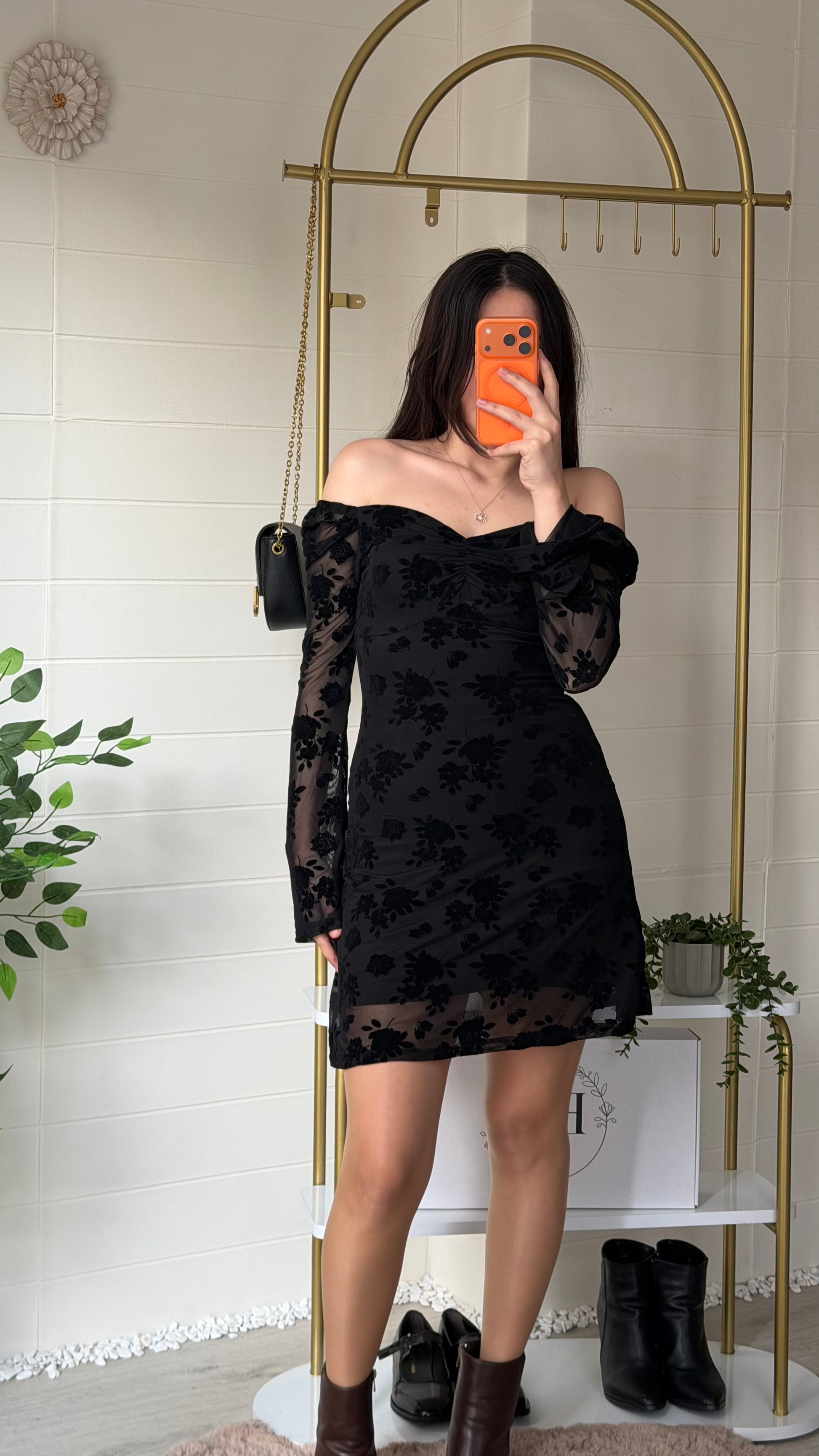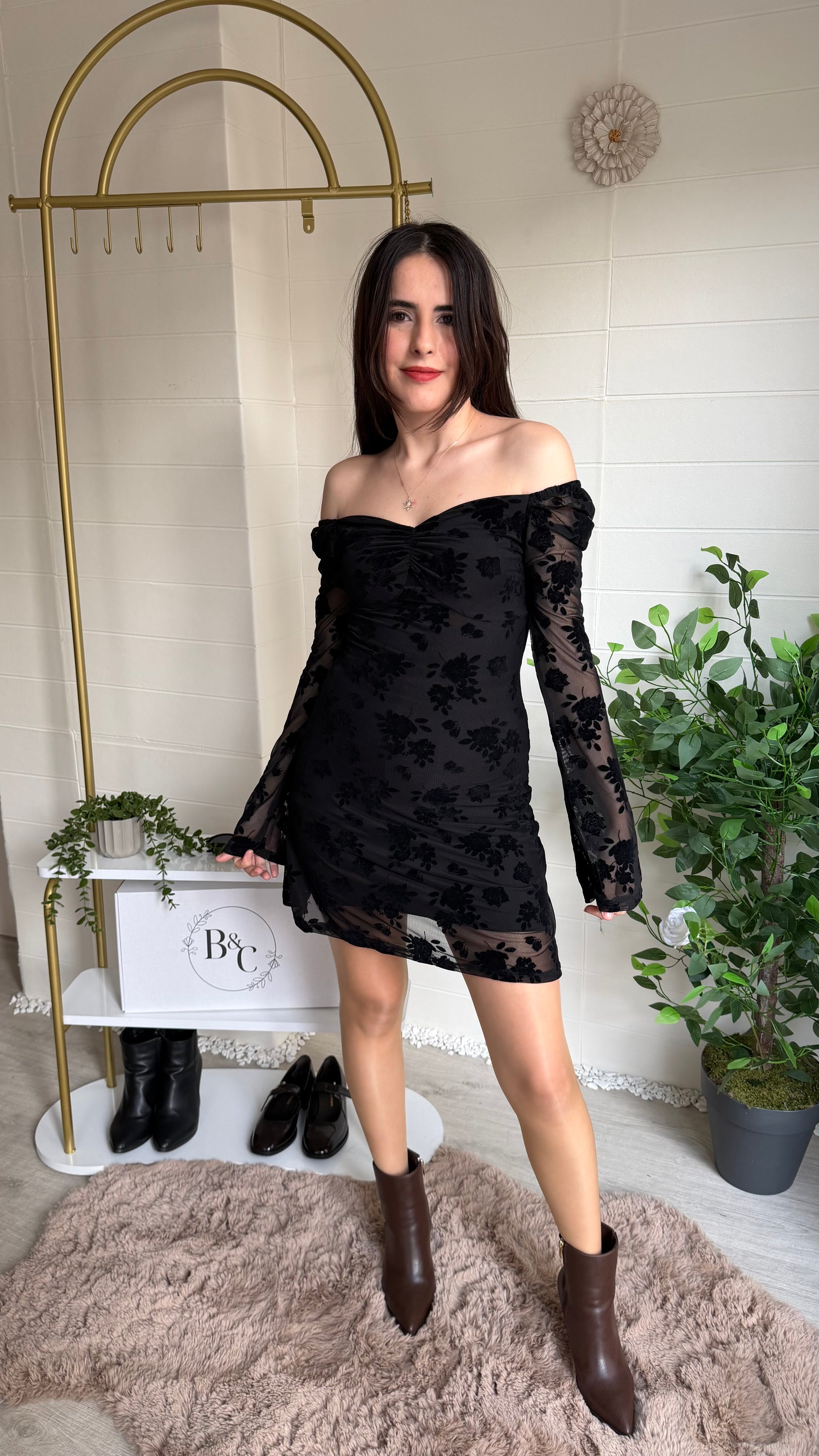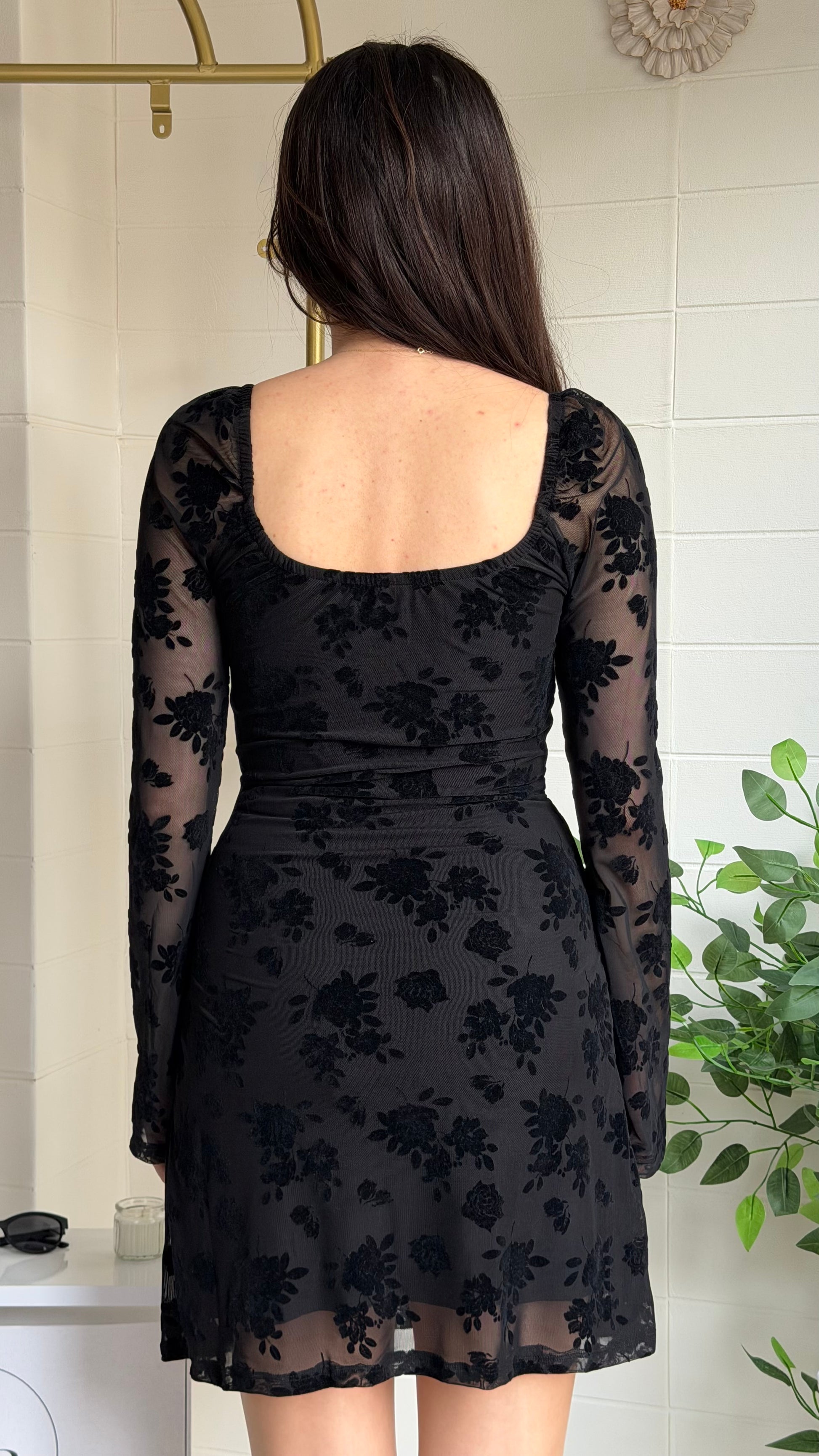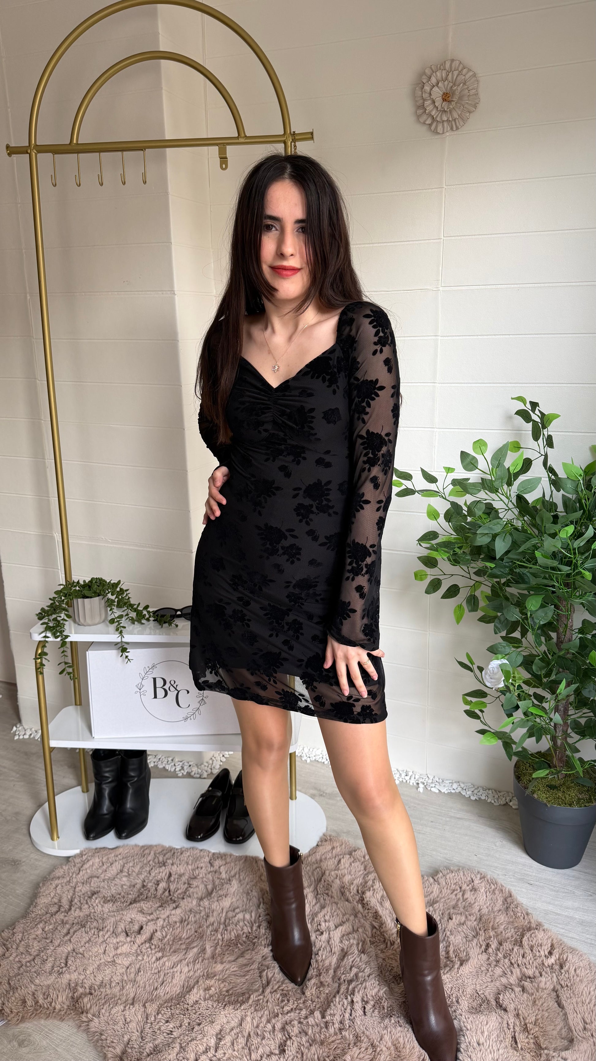Modern zarafeti romantik dokunuşlarla buluşturan bu kısa elbise, flok çiçek dokulu yüzeyi ve göğüs kısmındaki büzgü detayıyla feminen bir siluet oluşturur. Yarı transparan tül kollar ve etek ucu tasarımı sofistike bir görünüm sunarken yapısı gün boyu konfor sağlar.