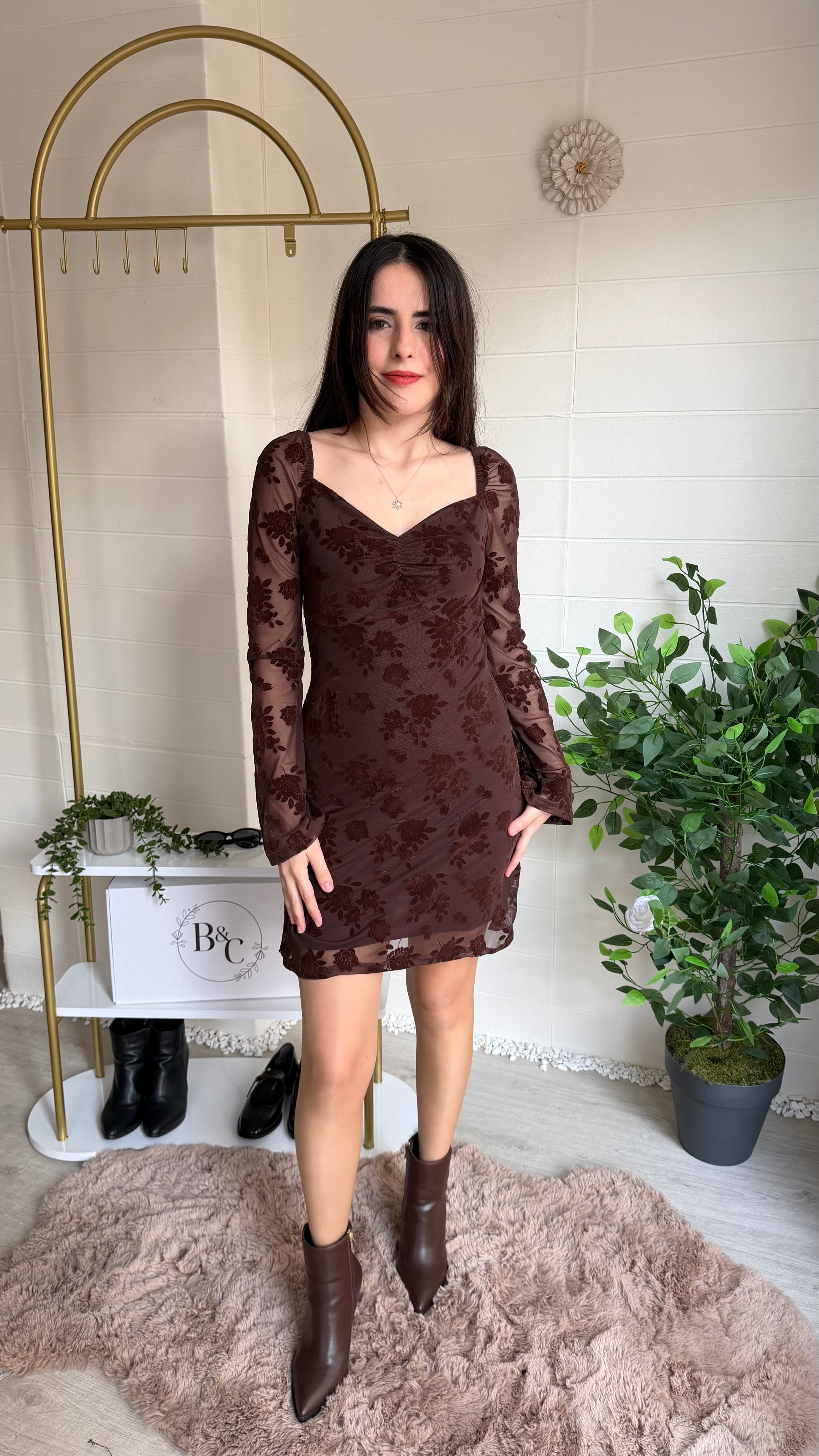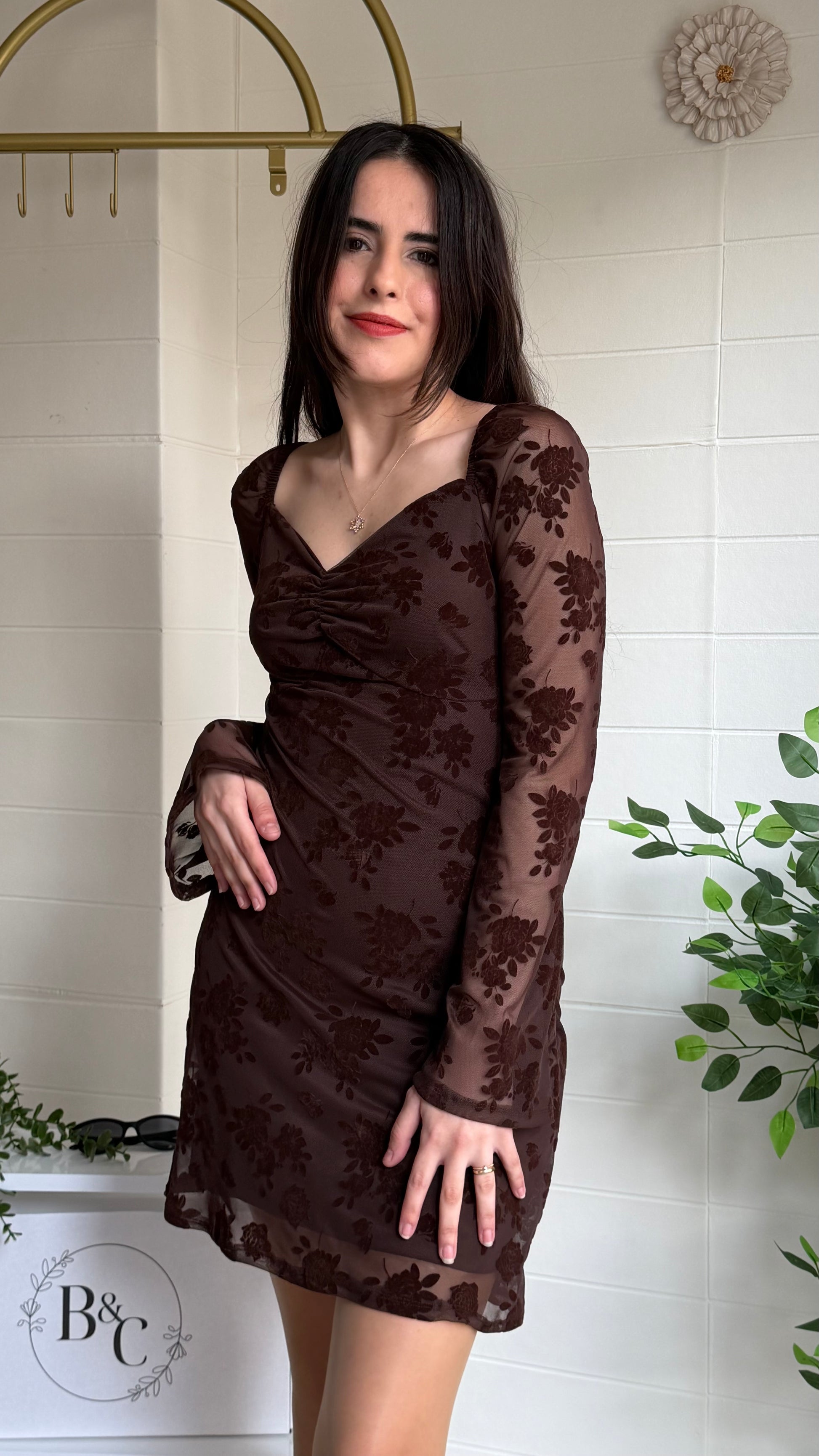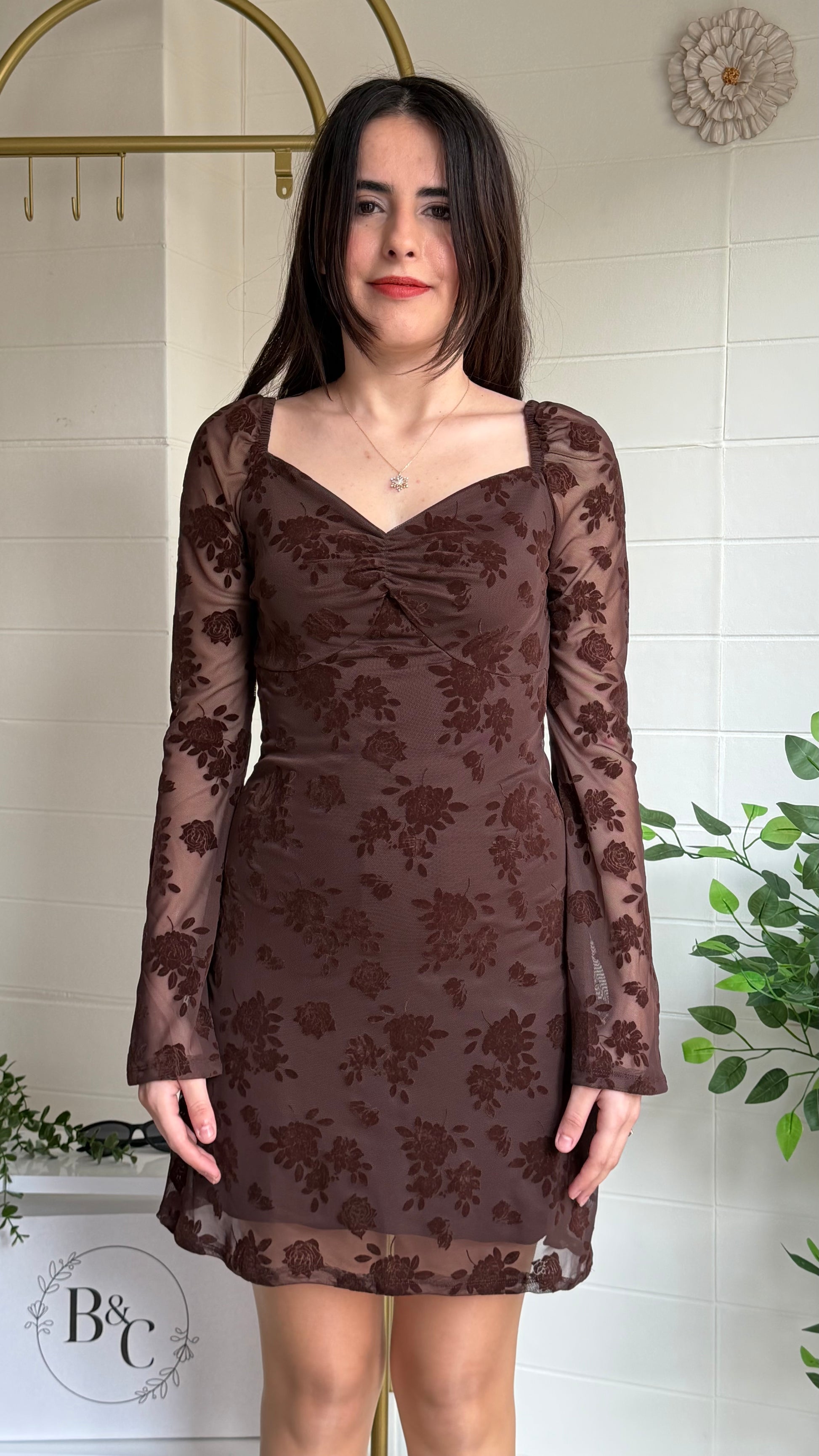 Modern zarafeti romantik dokunuşlarla buluşturan bu kısa elbise, flok çiçek dokulu yüzeyi ve göğüs kısmındaki büzgü detayıyla feminen bir siluet oluşturur. Yarı transparan tül kollar ve etek ucu tasarımı sofistike bir görünüm sunarken yapısı gün boyu konfor sağlar.