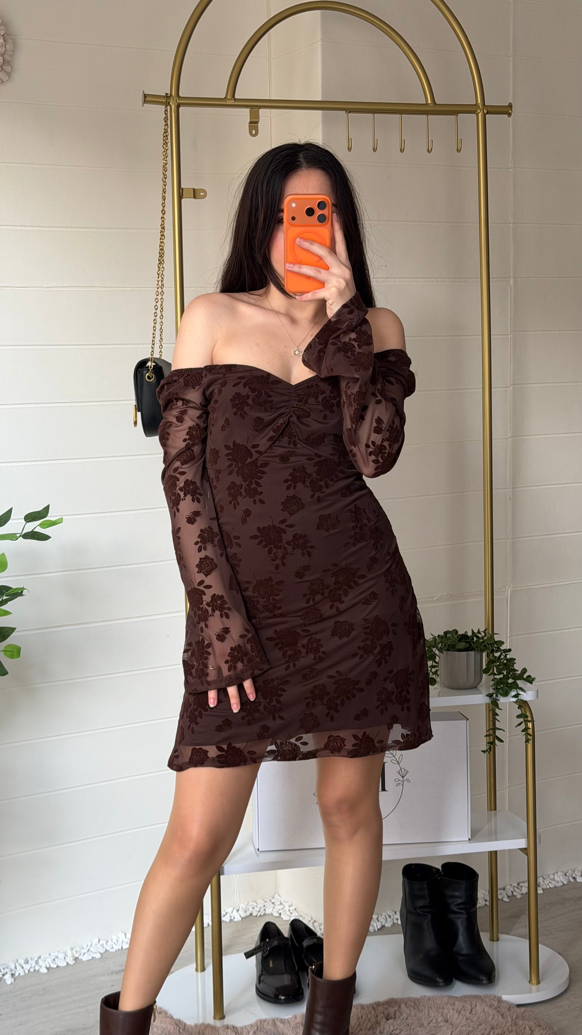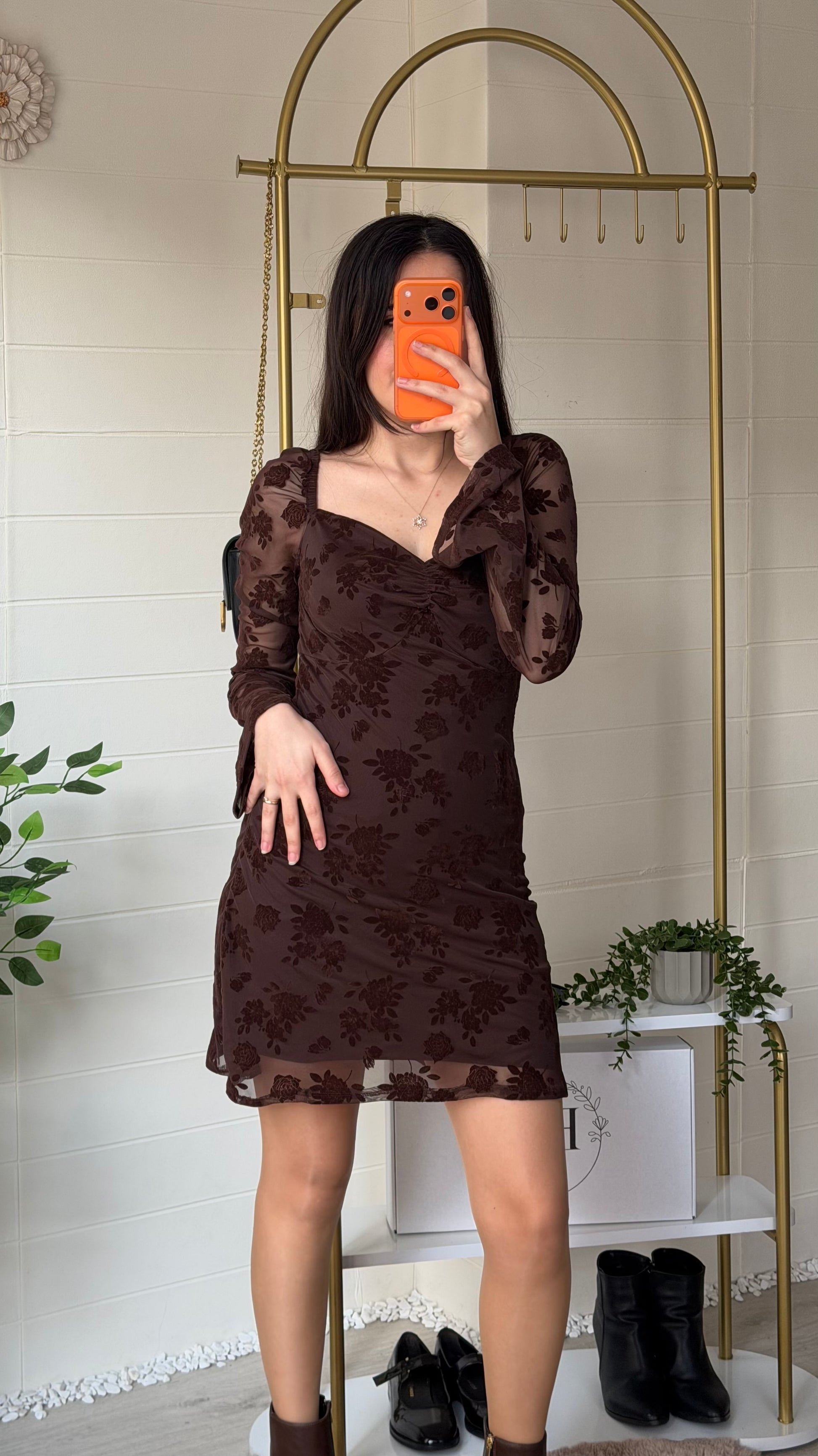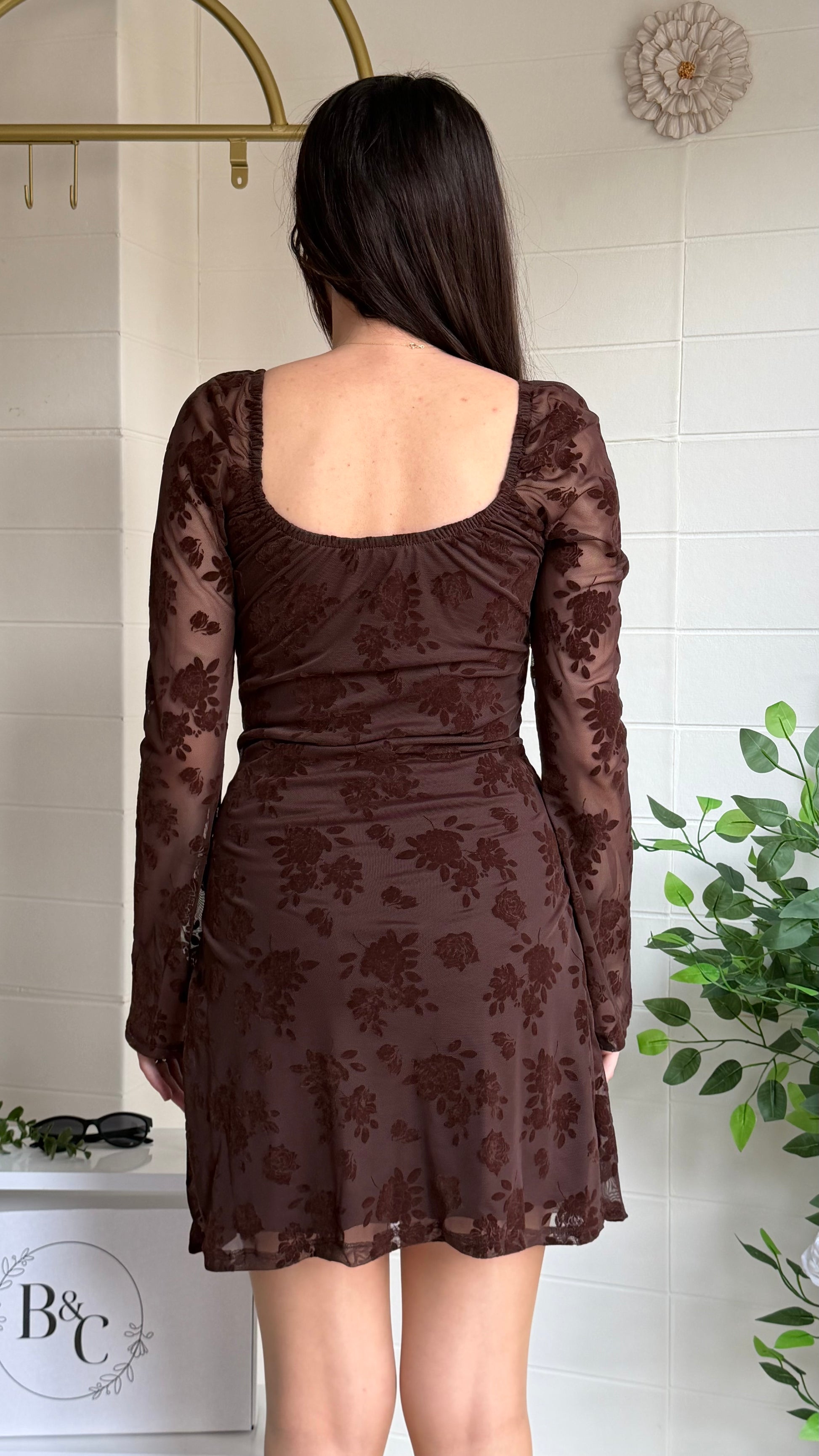 Modern zarafeti romantik dokunuşlarla buluşturan bu kısa elbise, flok çiçek dokulu yüzeyi ve göğüs kısmındaki büzgü detayıyla feminen bir siluet oluşturur. Yarı transparan tül kollar ve etek ucu tasarımı sofistike bir görünüm sunarken yapısı gün boyu konfor sağlar.
