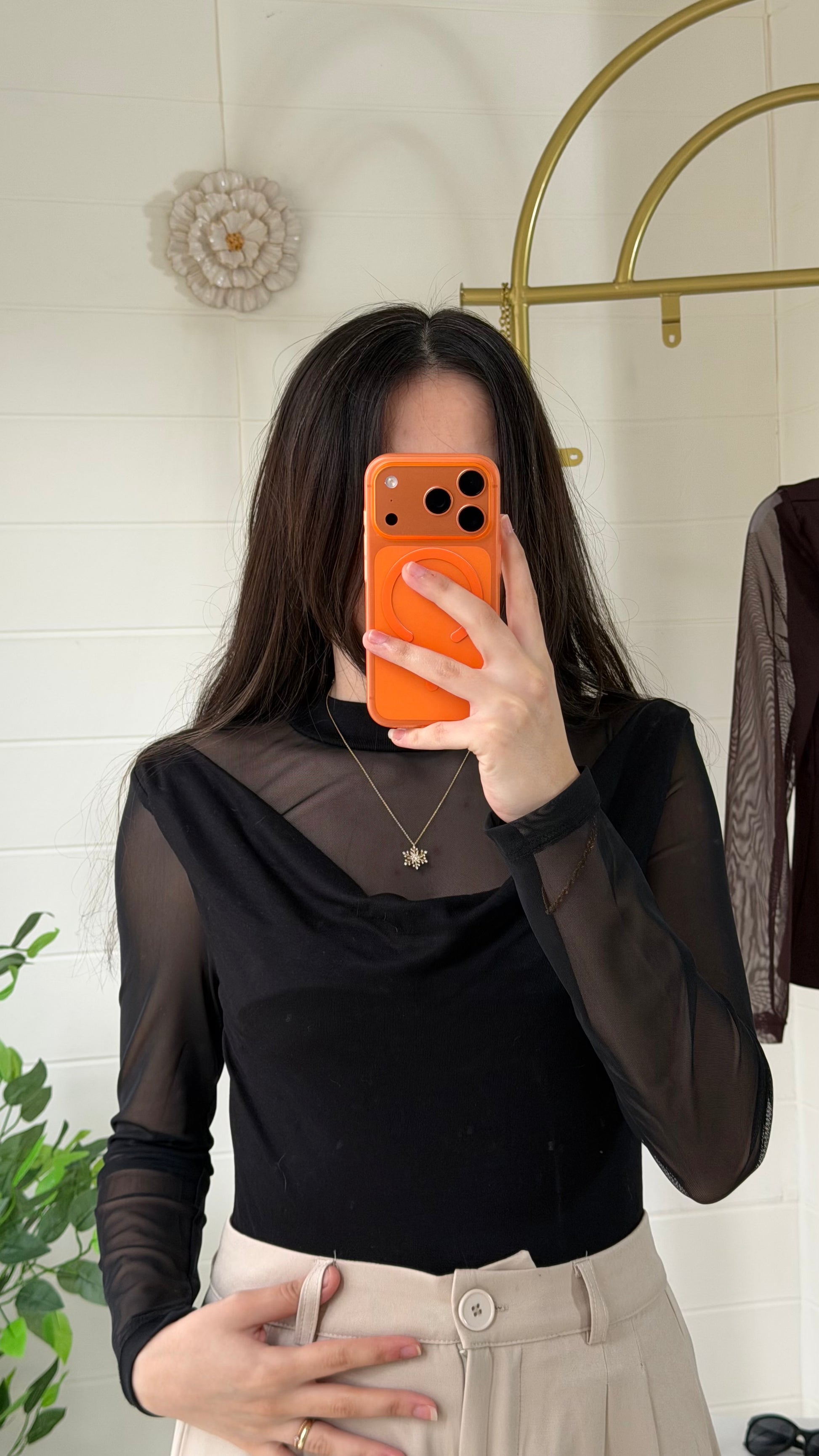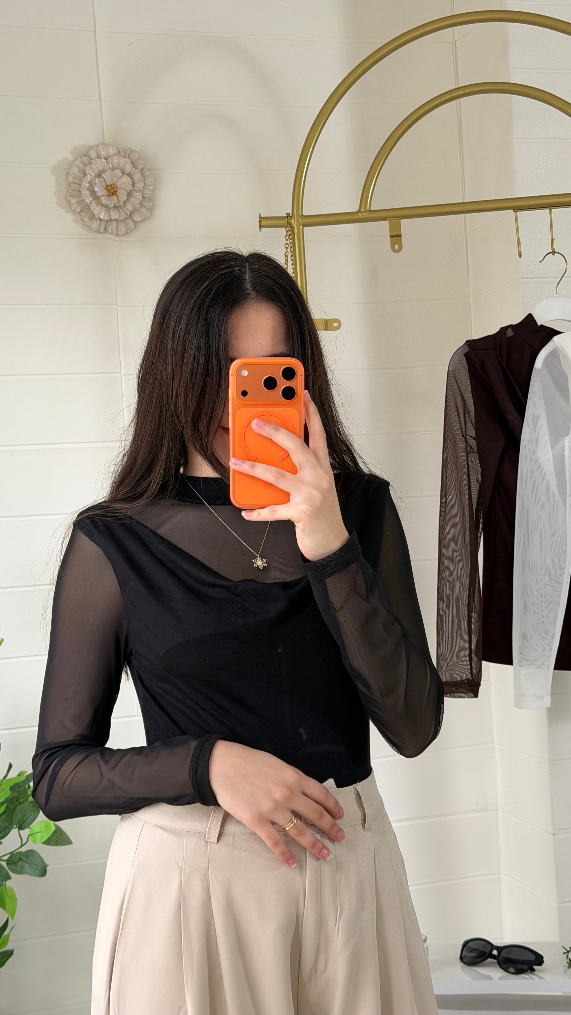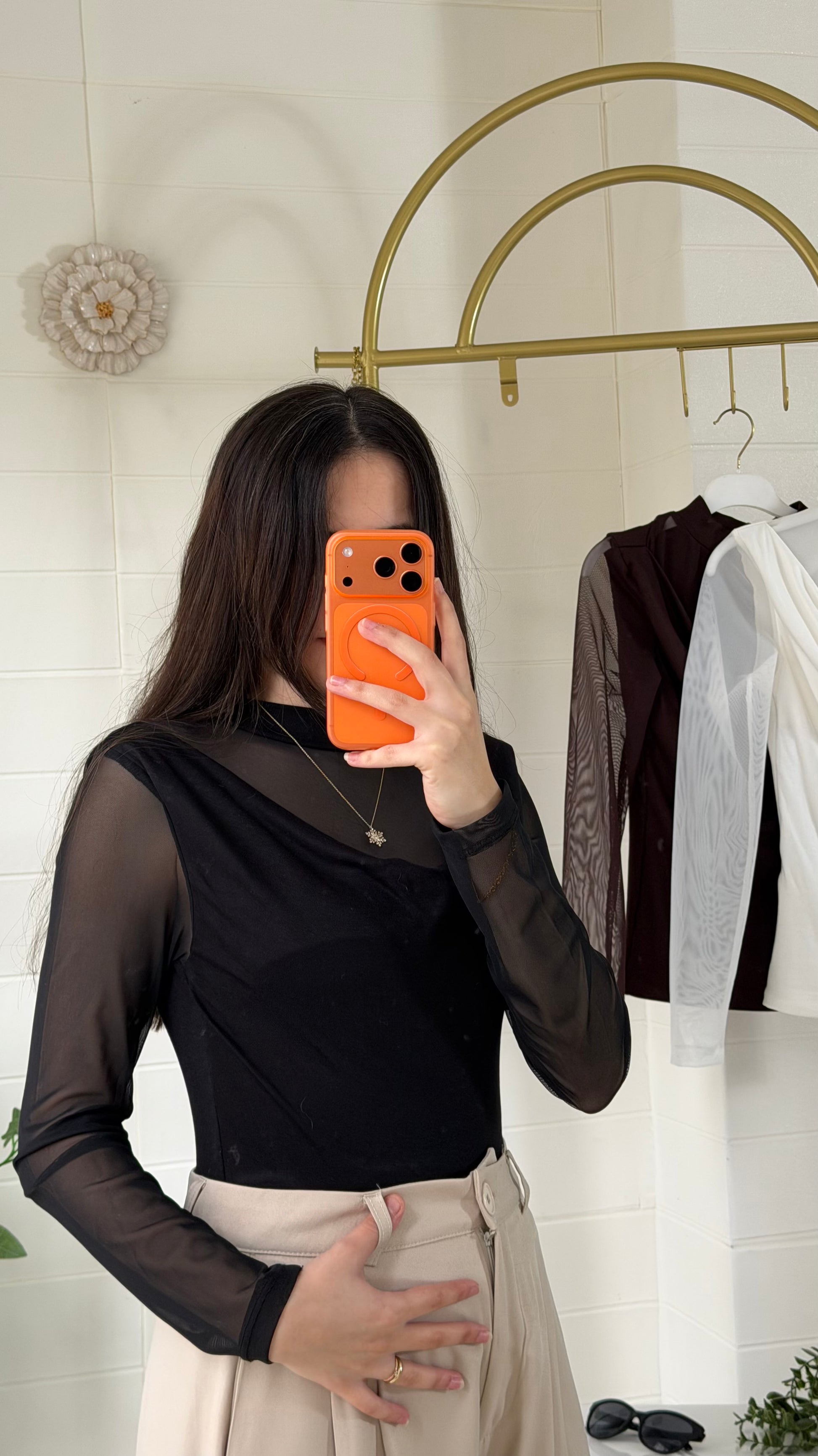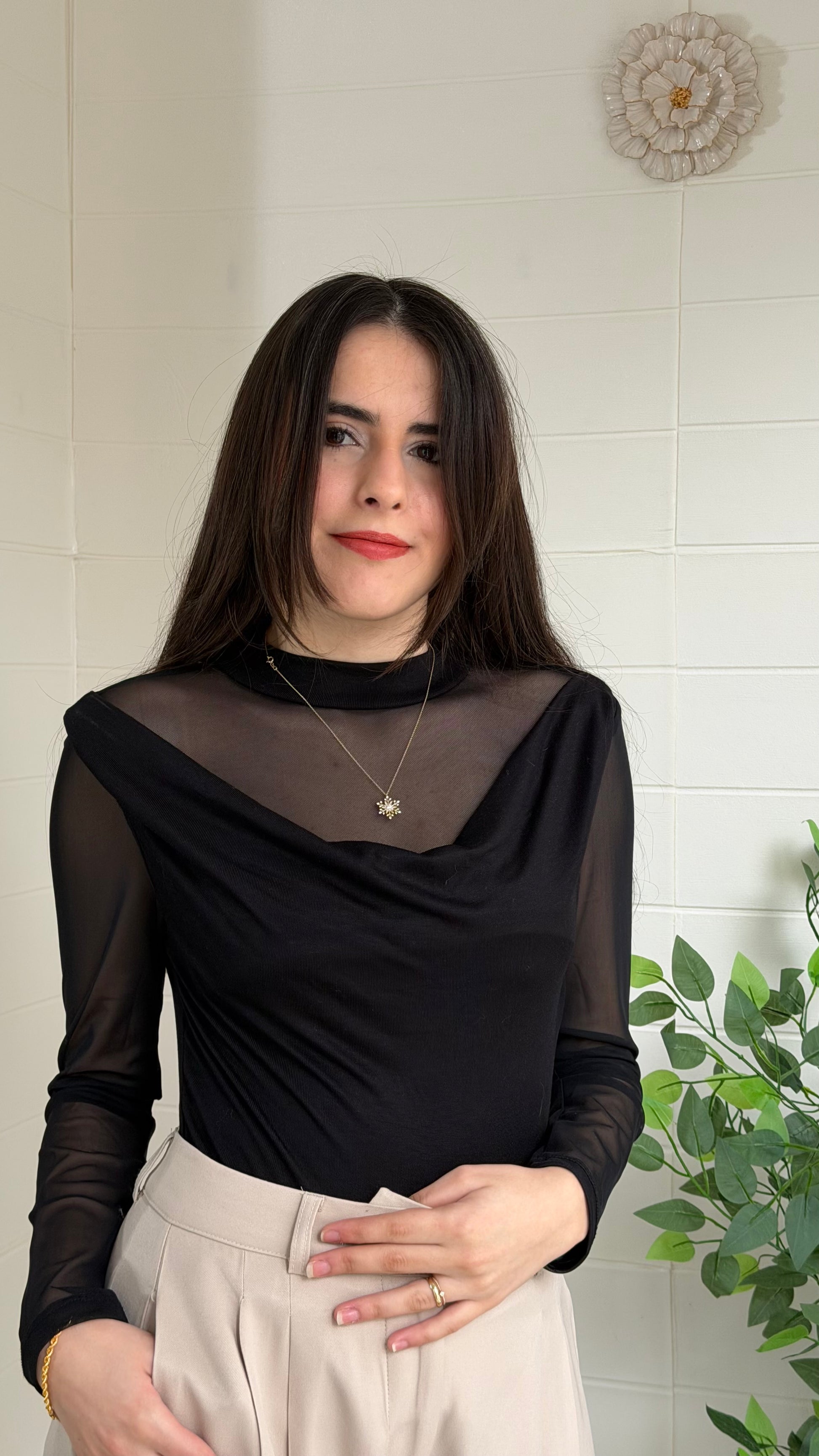 Degaje yaka formu ve tül garnili kol detaylarıyla zarif bir duruş sunan bu bluz, akıcı yapısı sayesinde vücudu nazikçe sarar. Yarı saydam kol tasarımı modern bir dokunuş katarken günlük ve özel kombinler için şık bir alternatif oluşturur.