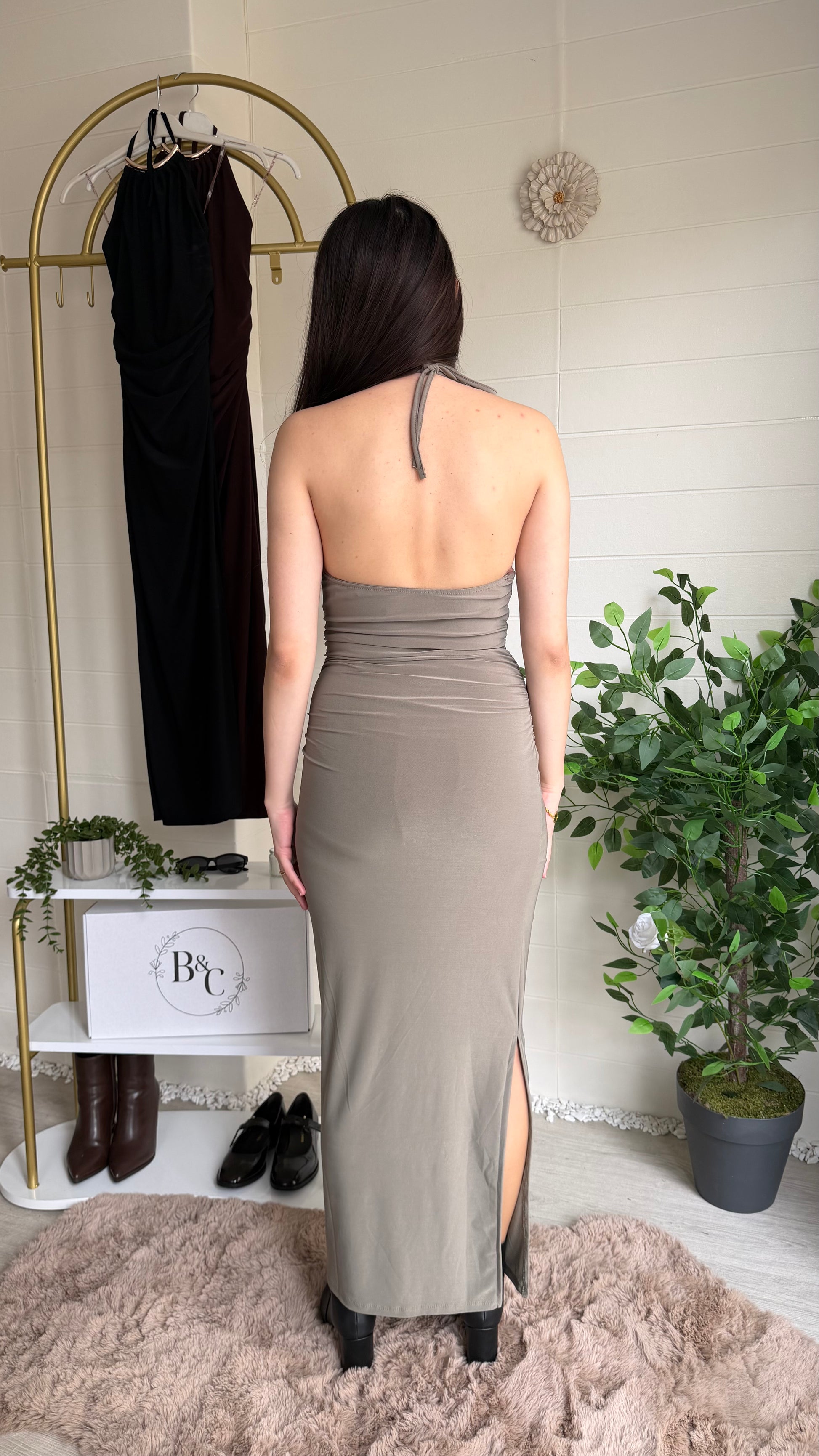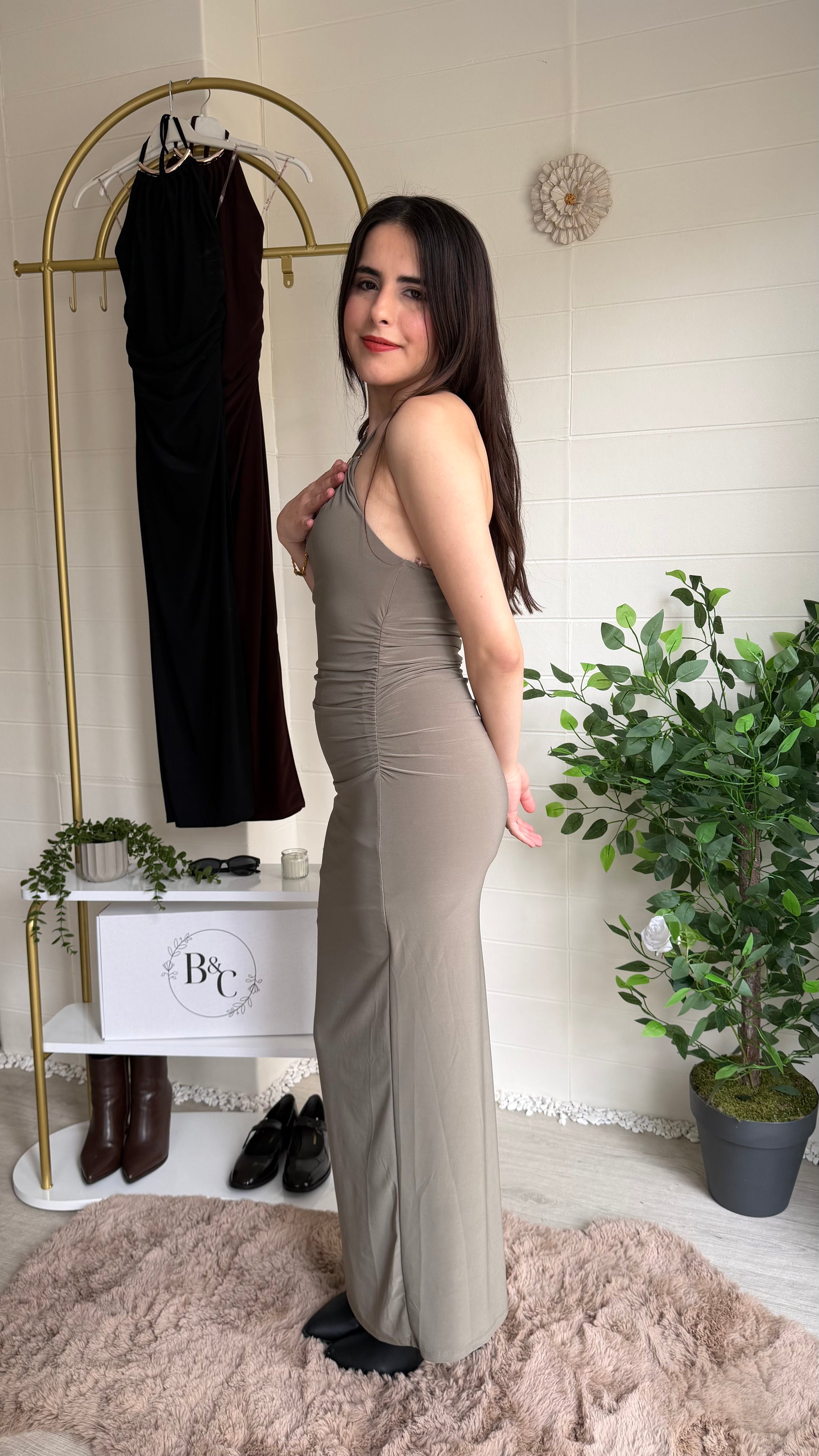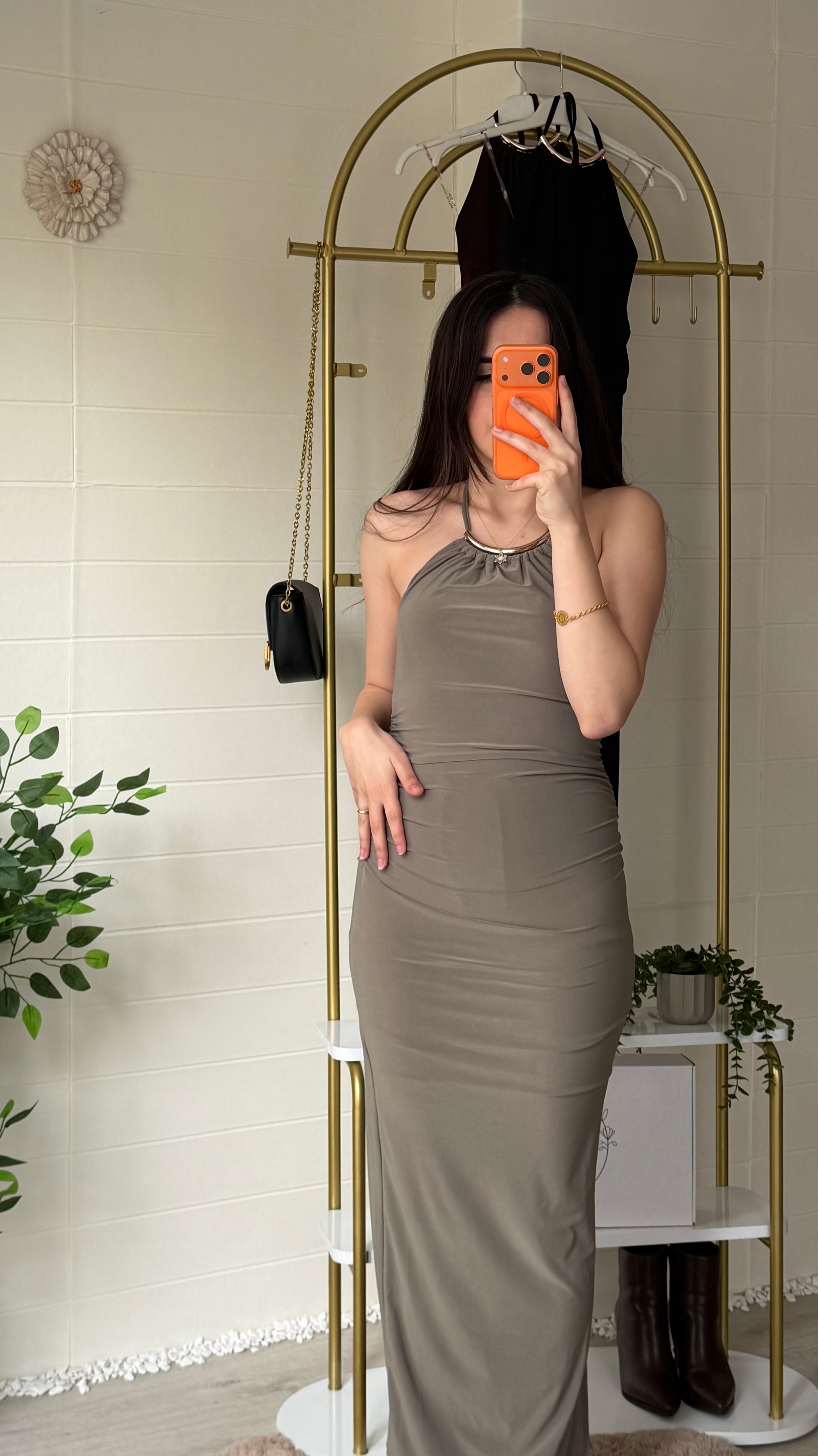 Zarif ve güçlü bir siluet sunan bu uzun elbise, akıcı kumaşı ve sırt dekoltesini vurgulayan halter yaka formuyla modern feminenliğin şık bir yorumudur. Esnek yapısı vücuda nazikçe uyum sağlarken, yan yırtmaç detayı yürüyüşe zarif bir akış kazandırır.
