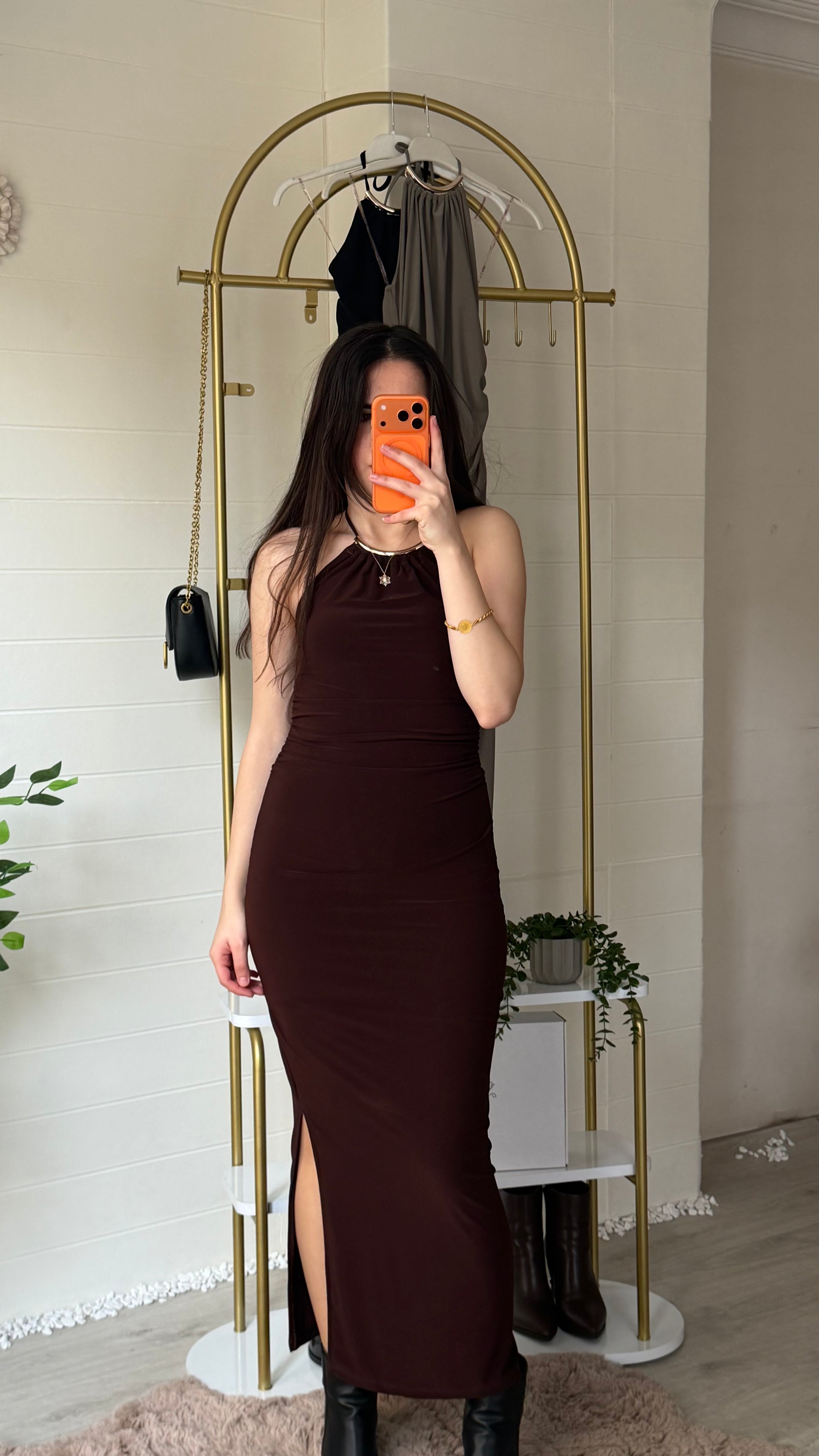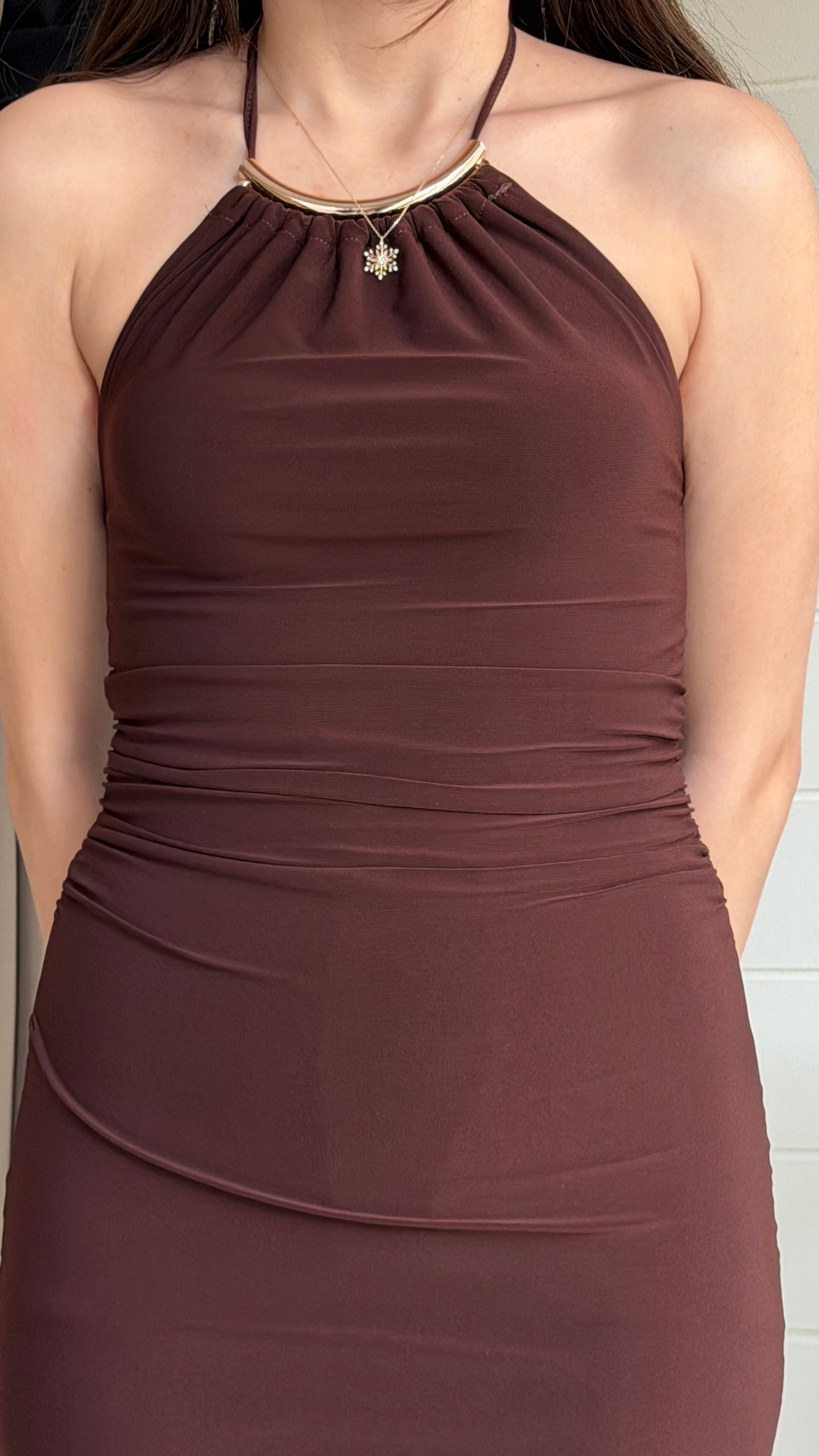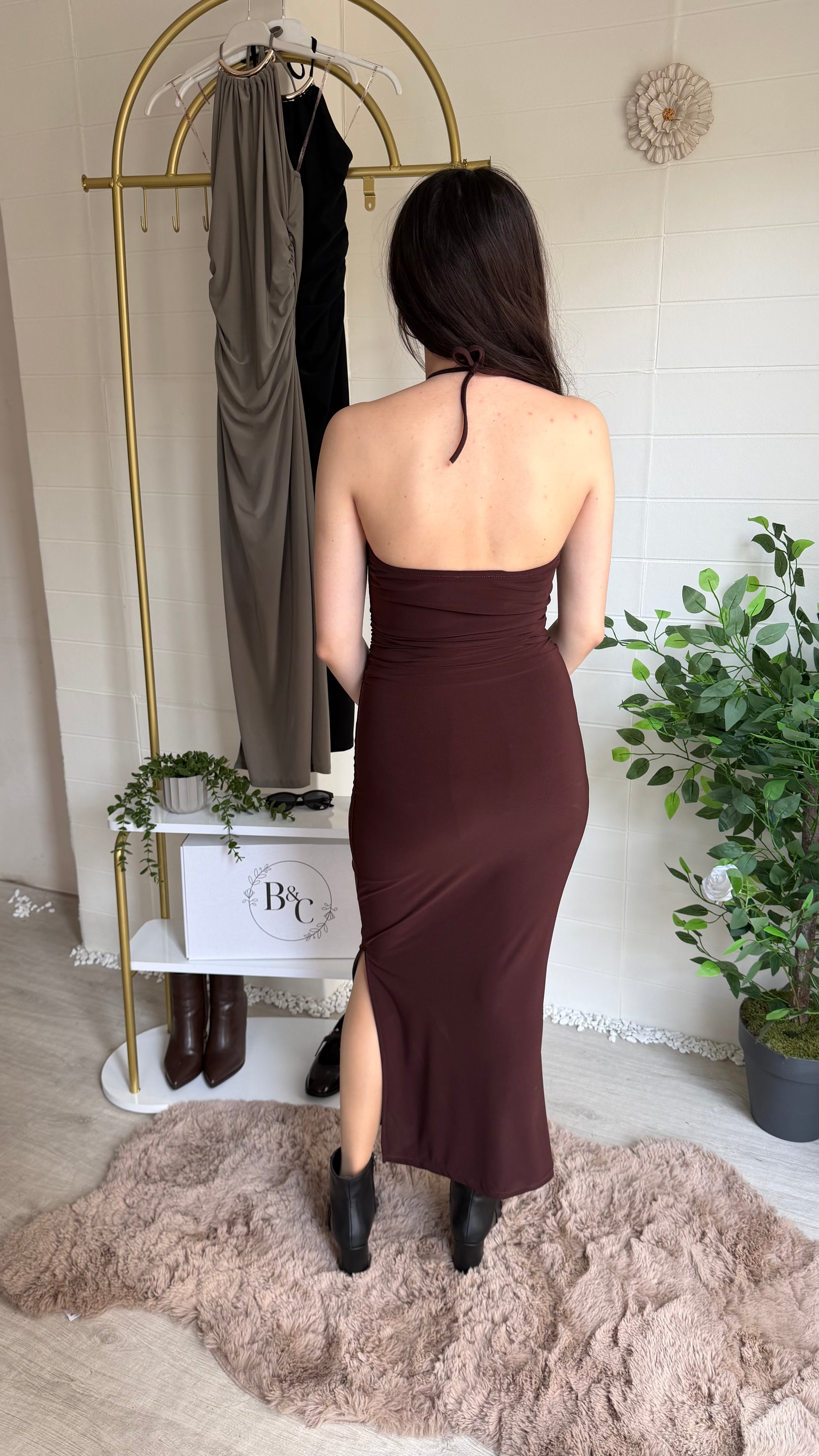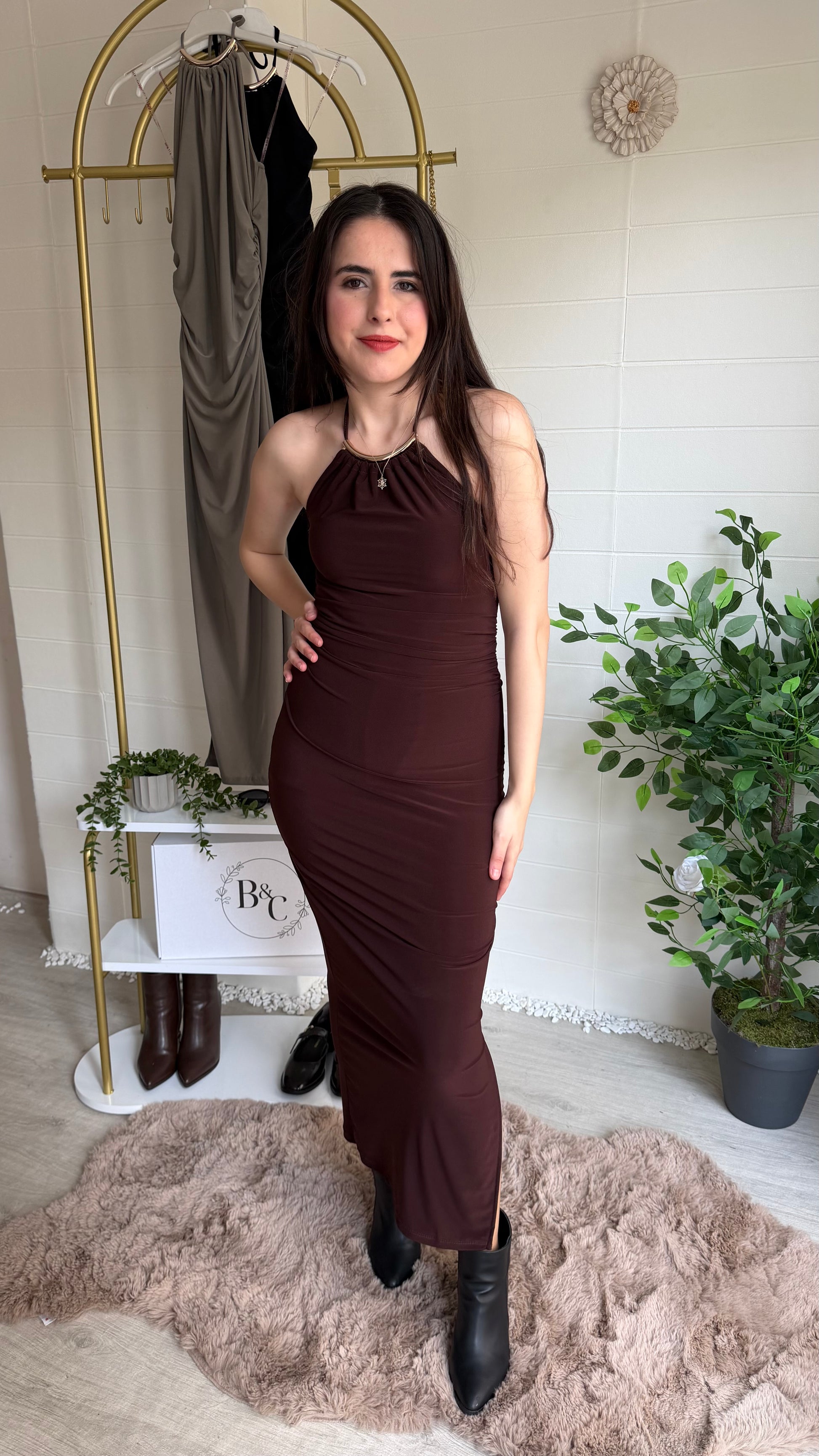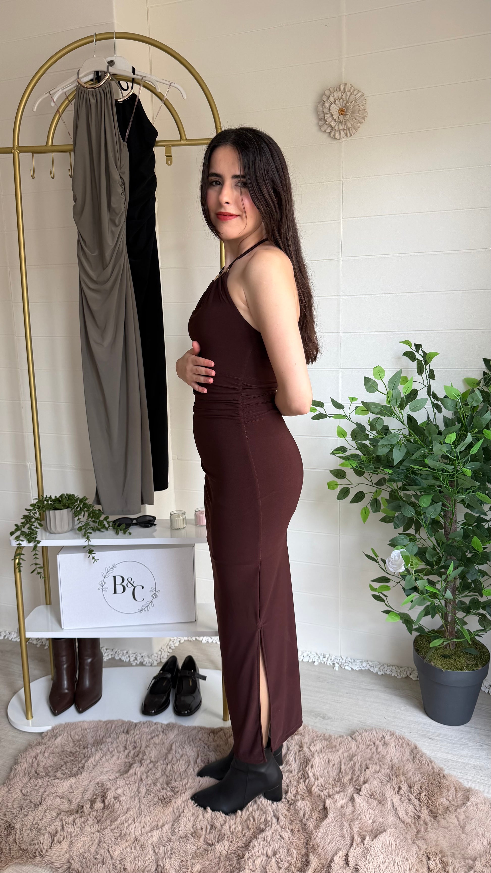 Zarif ve güçlü bir siluet sunan bu uzun elbise, akıcı kumaşı ve sırt dekoltesini vurgulayan halter yaka formuyla modern feminenliğin şık bir yorumudur. Esnek yapısı vücuda nazikçe uyum sağlarken, yan yırtmaç detayı yürüyüşe zarif bir akış kazandırır.