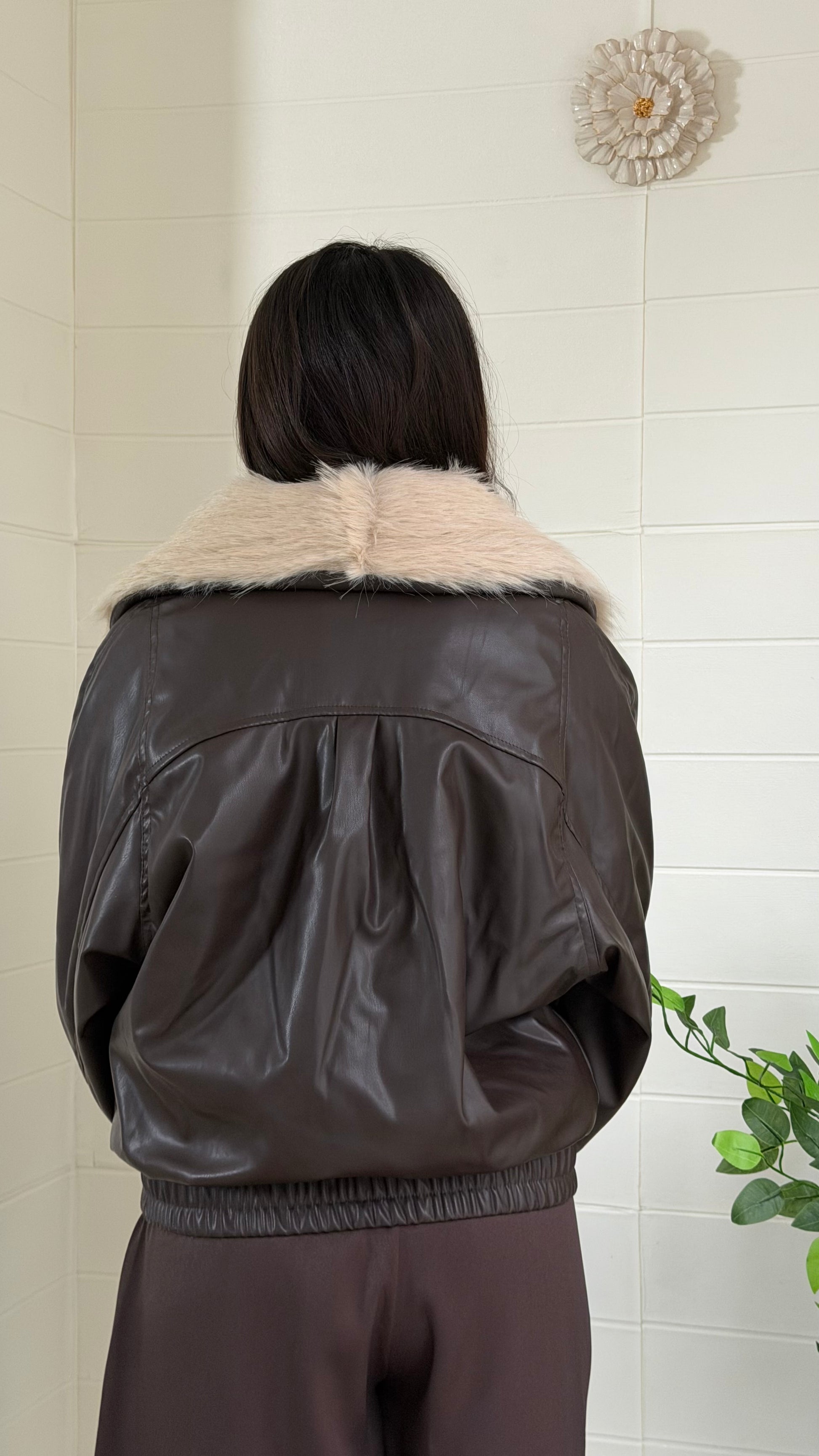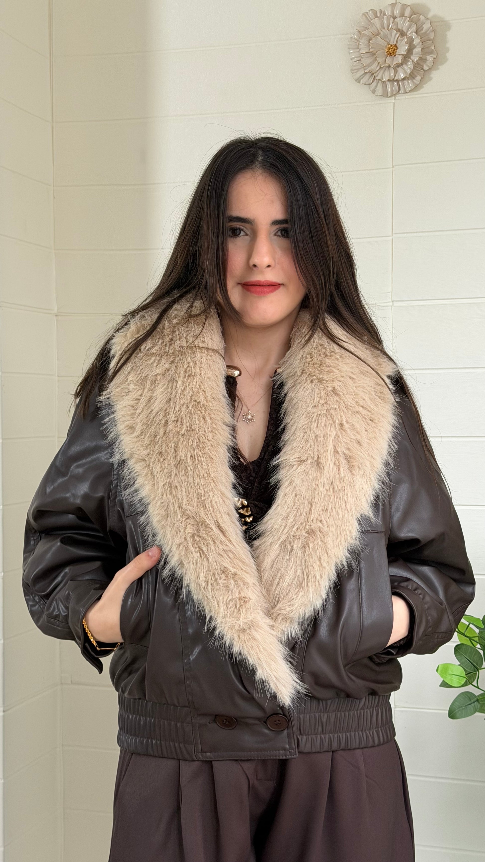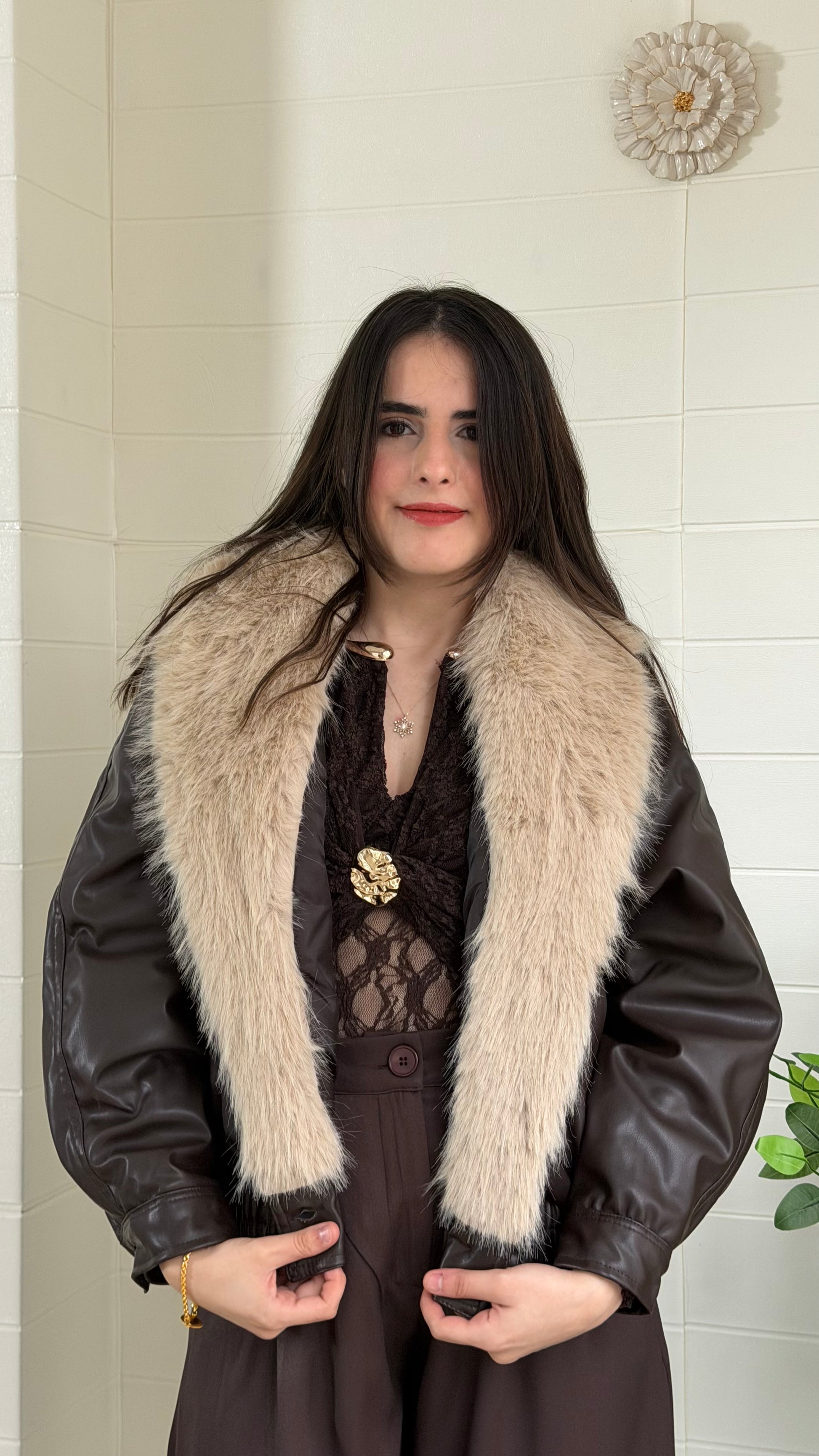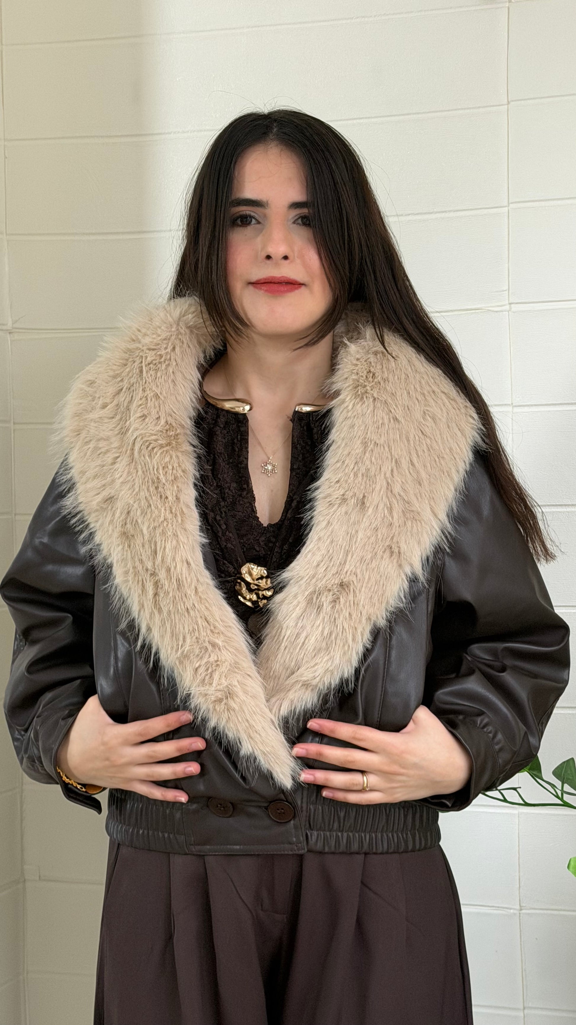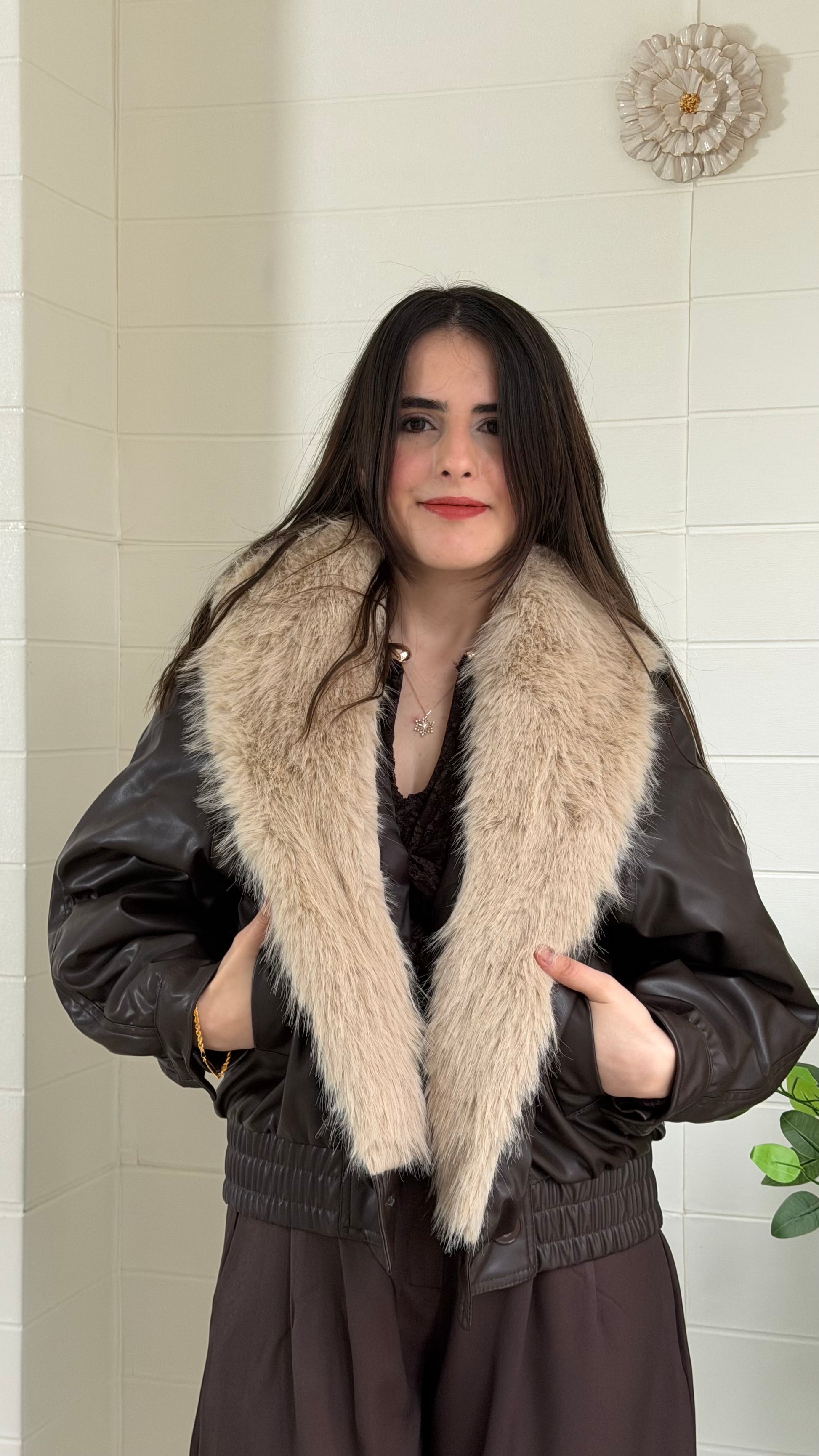 Kürk detaylı, dikkat çekici suni deri mont. Yaka kısmı kıyafete gösterişli bir dokunuş katar. Günlük ve şık kombinlerle rahatlıkla kullanılabilir.