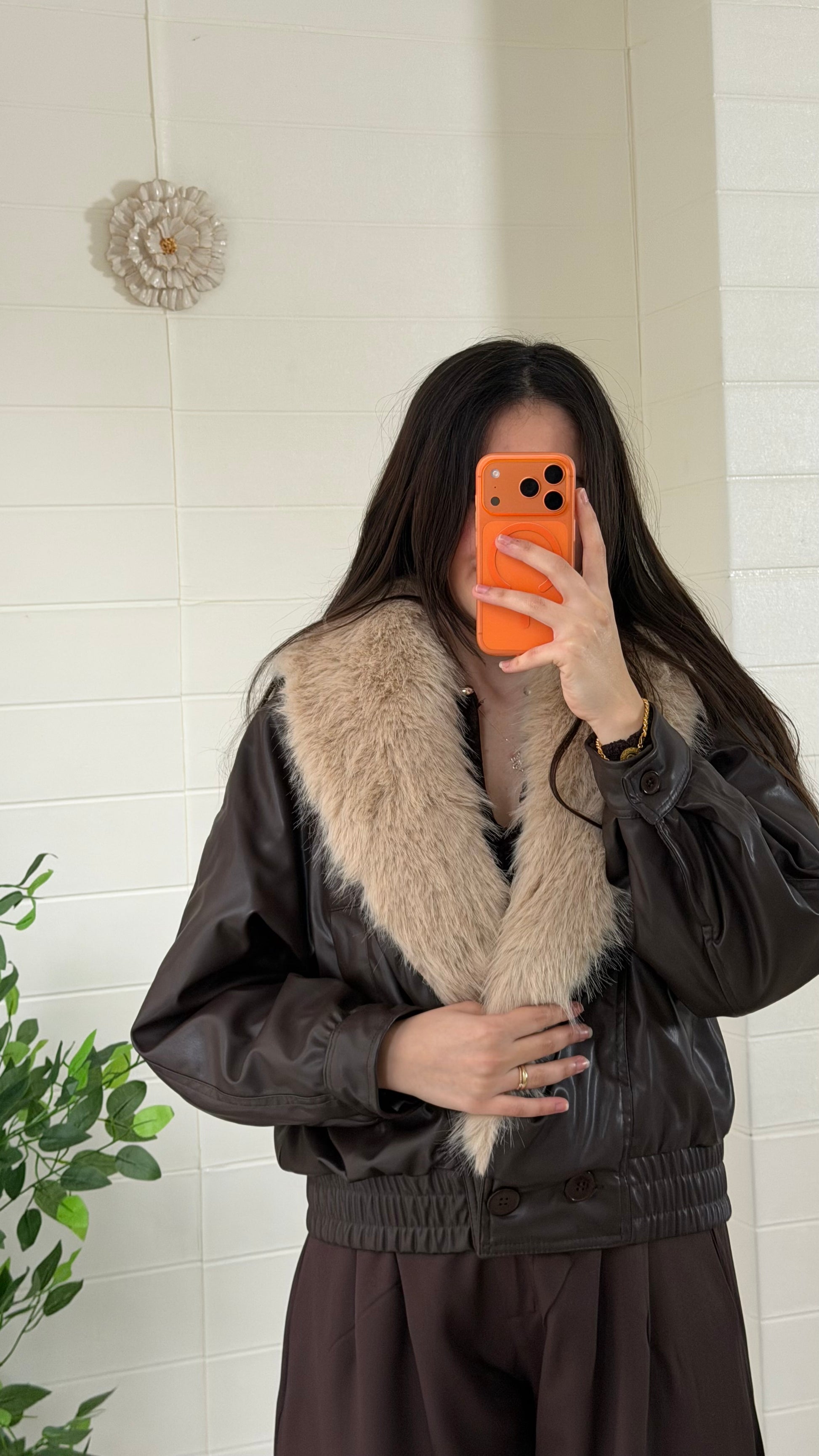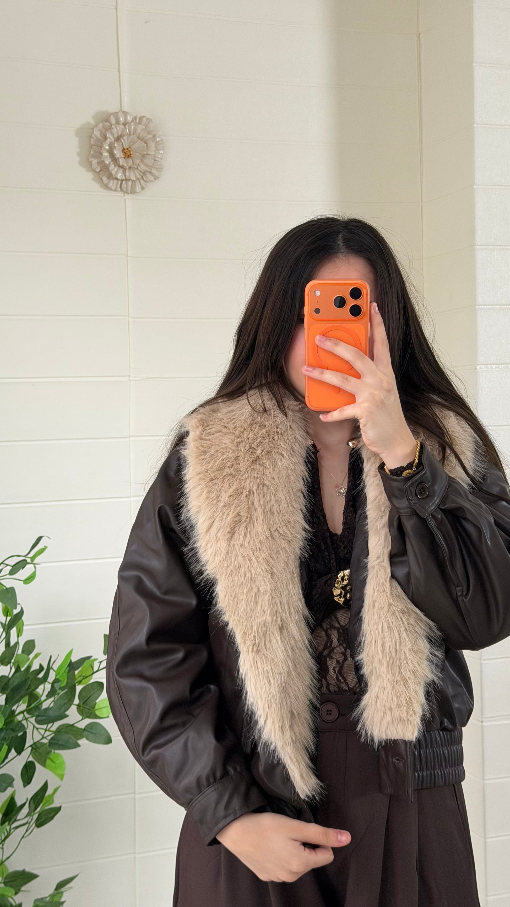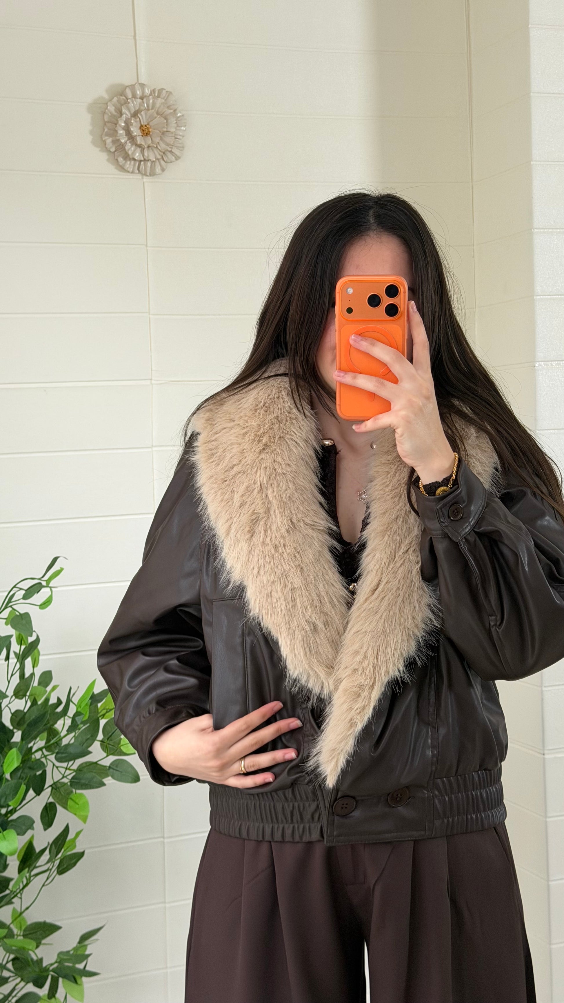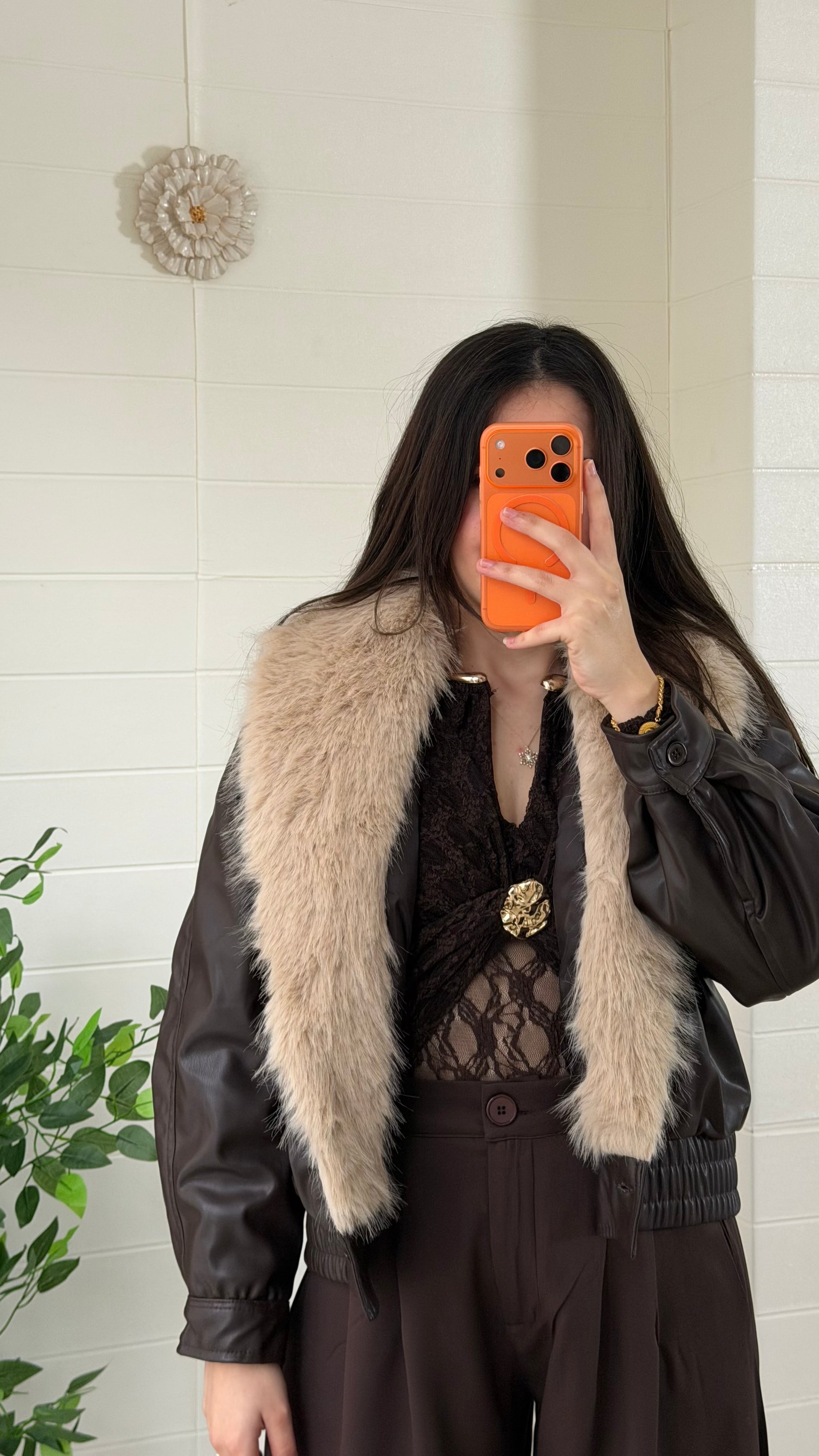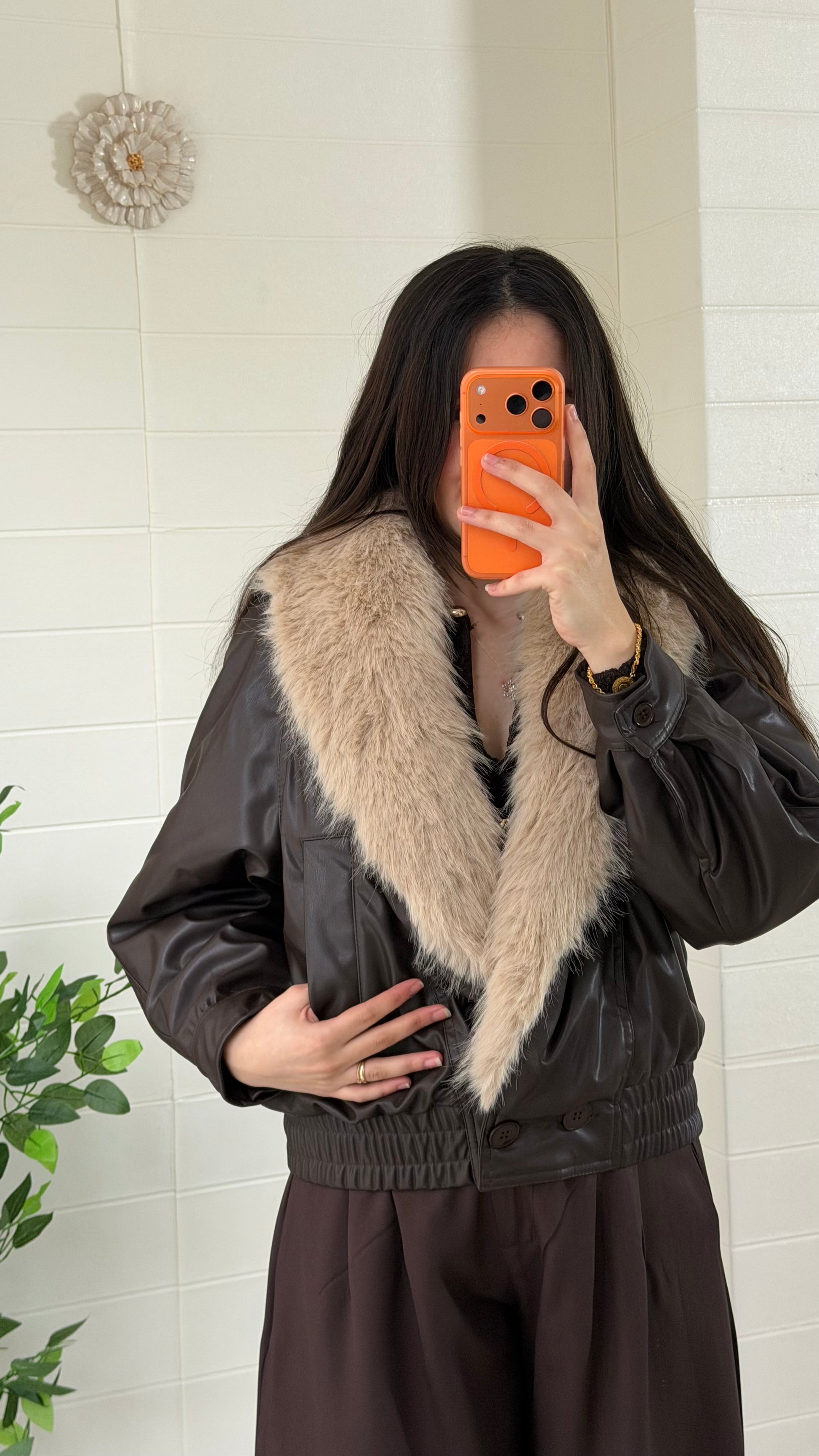 Kürk detaylı, dikkat çekici suni deri mont. Yaka kısmı kıyafete gösterişli bir dokunuş katar. Günlük ve şık kombinlerle rahatlıkla kullanılabilir.